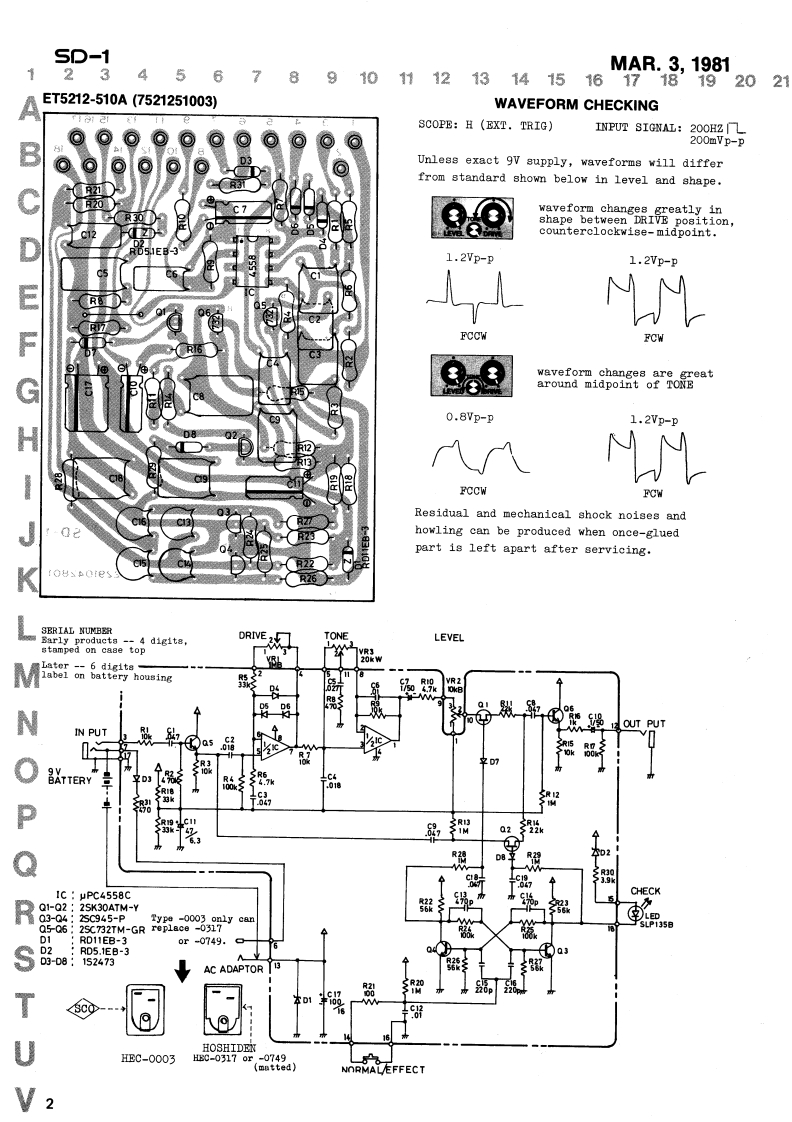MAR.3,1981SP-1⑤E▣SsSD-1SERVICE NO正SFirst Edition(2nd Printing JAN.20,1984 E-2)SPECIFICATIONSSCREW3 x 10mmPower.................Battery 9V(1)AC AdaptorCurrent Draw..............4mA at9VInput impedance ..........470knOutput load impedance....Over 10kDimen8ions......,70W)×55(H)×125D)mm9VCOIL SPRING(2217010900)Weight.t400gBATTERY6(2215070201)CASE(2201013000)CONNECTORCOVER(2202011600)JackBASE(2235030500)bottom,not shownEC-0003(13449702)orBC-0317-1-1(13449704)LED SLP.-135B(15029117)(detail on parts list)PotV10A15R10BKnob TK-1122(2247010500)(13229510)PotV10A15R1B(13229512)KnobK-1140(2247012500)JackSG-7622(13449106)PotVM10A15R20KW(13229521)Pedal(2218051700)·JackSG-7713(13449104)Base(2201013000)POTENTIOMBTERPARTS LIST13229512028-452VM10A15R1MB13229510028-447VMLOAL5R10KBParts are designated in 8-10.digits accompanied13229521VMIOA15R20Hby 6 digit number previously used,if have,for13129710cross reference.001-295Switch JM-0404N-before abridged part number stands for NEW,13449106009-012Jack SG-7622 OUTand should not be replaced by No.to avoid con-13449104009-036Jack SG-7713 INfusion between two systems.13449702009-022Jack HBC-0003Ac adaptor jack in early unit,or13449704later unit,HBC-0317-1-1 orNEWOLDHEC-0749-01010(same but mattedboth types require dedicated mounting hole in case2201013000。。Case2218051700。PedalPCB2202011600065-1307521251003CoverET5212-510Aass'y2291042801PCB N-428A2234030400111-031BaseSEMICONDUCTOR2235030500111-032Base15189105020-097uPc45580Ic2215070201.068-026Guide bushing15091547018-039RD11EB-3zener2247010500016-025KnobTK-112215091523018-075RD5.1EB-3zener2247012500016-068KnobTK-114015019103018-014182473diode2217010900070-059Coil spring15129108017-10428C945-P2217050200065-153Insulating sheet15129104017-110PCB-bottom Cover28C732TM-GR222603050015139101107-053Cushion017-0142SK30ATM-YFETbattery,bottom cover15029117SLP-135BLEDRolandPrinted in JapanAH-2