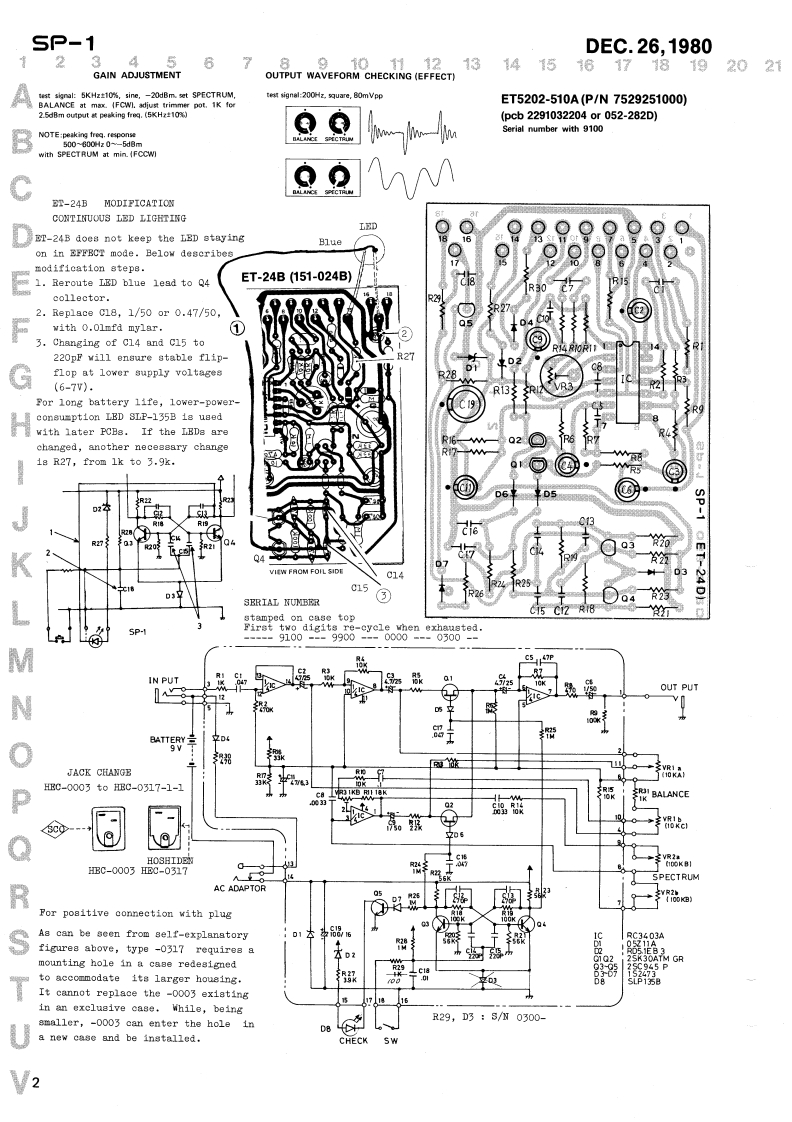 DEC.26,1980SP-15E▣SSSP-1 SERVICE NOTESSPECIFICATIONSecond EdittionPower..........:...Battery 9v (1)AC AdaptorSCRW3×10mmCurrent draw,·,,,··3.5mAS/N ratio,,,,,,,,,,,·,Over 80dBN-109Input impedance.......470K(2217010900)Output load impedance ..Over 1OKS9VCOIL SPRINGBATTERYN0.59(070-059】Dimensions,,,,:,·····70(W×55(H)×125(D)mm2.8(W)×2.2(H)x4.9(D)inPEDAL GUIDEWeight,400g,0.881IbBUSH NO.26(068-026]N-702C0VERN0.130(065-1301N-116(2202011600(2215070201)BASE NO.32(111-032)RUBBERBOTTOM NOT SHOWNN-3052235030500)CASE NO.18(066018)N-106(2201010600)*HEC-0317(13449704)JACKHEC-003detail on back page(009-022)◆GL32AR*SLP-135B(019-0081(15029117)GM70A15R.10KA+10KC(028-641)(13229756)POT.GM70A15R100K8×2(028-655)(13229755)日AHKN0BTK-1122(0160251(2247010500)SG.7622●OUTPUTINPUT●SG-7713(009-012)(009-036)(13449104)(13449106)SpectrumCOVER·SPN0.145065.145)PedalN-502FBASE N0.31(111031)N-304(2218050205)RUBBER(2235030400)PARTS LIST001-091 Switch JM0400#1 whiteor13129710001-295JH-0404b1acgincompatible different in aizeDESIGNATIONBoth New(8-10 digits)and old (6 digits)for cross-reference151-024 B PCB a8syB7-24B(pcb052-262B》SYMBOL*Indicates latest one of the changed partsW7520251000BT-5202-510ACOMPATIBILITY No comment on compatible ones(pab22910322040r052-282D)】N for No.Always followed by abbriviated NEW numberPOTENTIOMETER13229755028-655GM70A15R100Bx2NEWOLDDESCRIPTION13229756028-641GM7OA15R 10KA+10KC2201010600066-018Case N-106main13299109030-4598R-19R1KB trimmer2218050205065-145Peda1T-502BtopSEMICONDXUCTOR2235030400111-031BaseI-304pedal matt15169114020-077RC3403Aquad op amp2202011600065-130CoverM-116bottom*15129108017-11028C945-P(017-037230536-P)2235030500111-032N-305 bottom,rubber15139103017-01623K30AW-0RFET2247010500016-025KnobTK-1122 w/eerew15019103018-014182473(181555)diode2215070201068-026Guide bushing N-702A*1501952301B-075RD5.1EB-3(018-07302EZ4.7A)2217010900070-059Coil.springN-10915019617018-068052-11A zener13449106009-012 Jack SG-7622output*15029117019-0348IP-135B(019-008GL-32AR)13449104009-036Jack80-77131nputBLBCTROLYTIC CAPACITOR13639109032-008ECEA6V47 47mfd 6.3V13449702009-022JackHEC-0003 AC adaptor13639150(w/800m9rk)032-0370EA16V00100mfd16713449704B0-0317-1-1(H09HID2N)13639202032-071ECEA5OV1 1mfd 50Vdownward compatibility:verte(see even page)13639165032-046ECEA25V4R7 4.7mfd 25VRolandPrinted in JapanAH-21