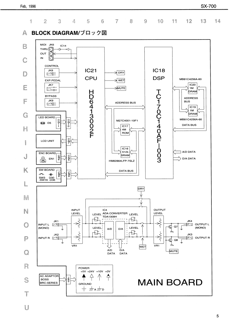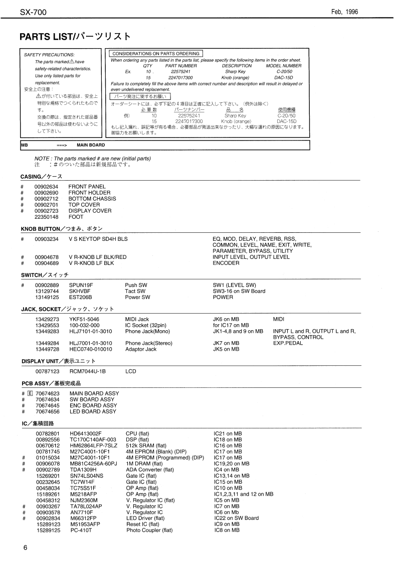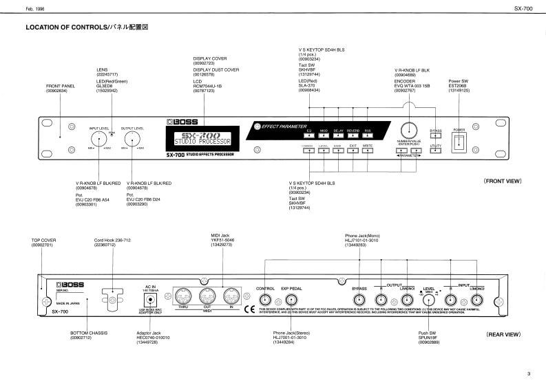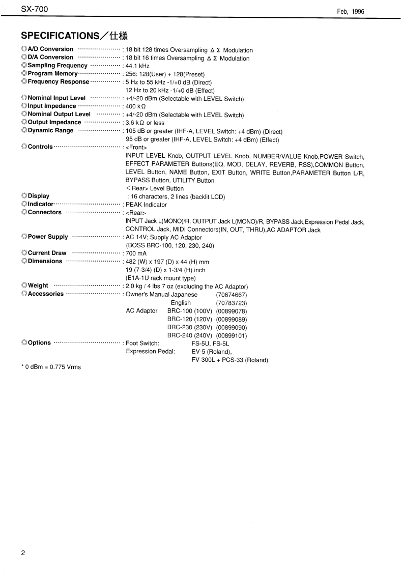 Feb,1996SX-700OSS5X-700 SERVICE NOTESSTUDIO EFFECTSFirst EditionPROCESSORIssued by RJATABLE OF CONTENTS目次PageSPECIFICATIONS·仕樣……2LOCATION OF CONTROLSパネ儿配置☒……3EXPLODED VIEW.............................分解☒…………4BLOCK DIAGRAM.............................ブ口y夕☒…5PARTS LIST..................................パ-又卜…68TEST MO0DE…デ卜E-K…912IDENTIFYING THE VERSION NUMBER·/バ-ヅョ>)確認方法…13RESTORING THE FACTORY PRESETS·フ刀夕卜)-·プ)七y卜)設定方法13DATA SAVE…デ-夕の七-ブ…14、15DATA LOAD..................................デ-夕の口-…16TROUBLESHOOTING卜与ブ儿之1-子1分…17ERROR MESSAGE............................工ラ-火y七-ヅ…18、19MAIN BOARD ASS"Y............................MAIN BOARD ASS'Y…20~22SW BOARD ASS'Y............................SW BOARD ASS'Y…2022LED BOARD ASS'Y…LED BOARD ASS'Y…2022ENC BOARD ASS'Y…ENC BOARD ASS'Y…20~22IC DATA.......................agg。。。。。。Cデ-夕…23CHANGE INFORMATION.......................姿更案内…24☒日0S5EFFECT AARAMETEN8器凸留誉5-7000+t作053名昌尚凸晋里Roland17059832Copyright c 1996 by ROLAND CORPORATIONPrinted in Japan(AFAO)(CR)1