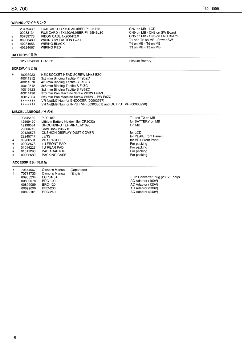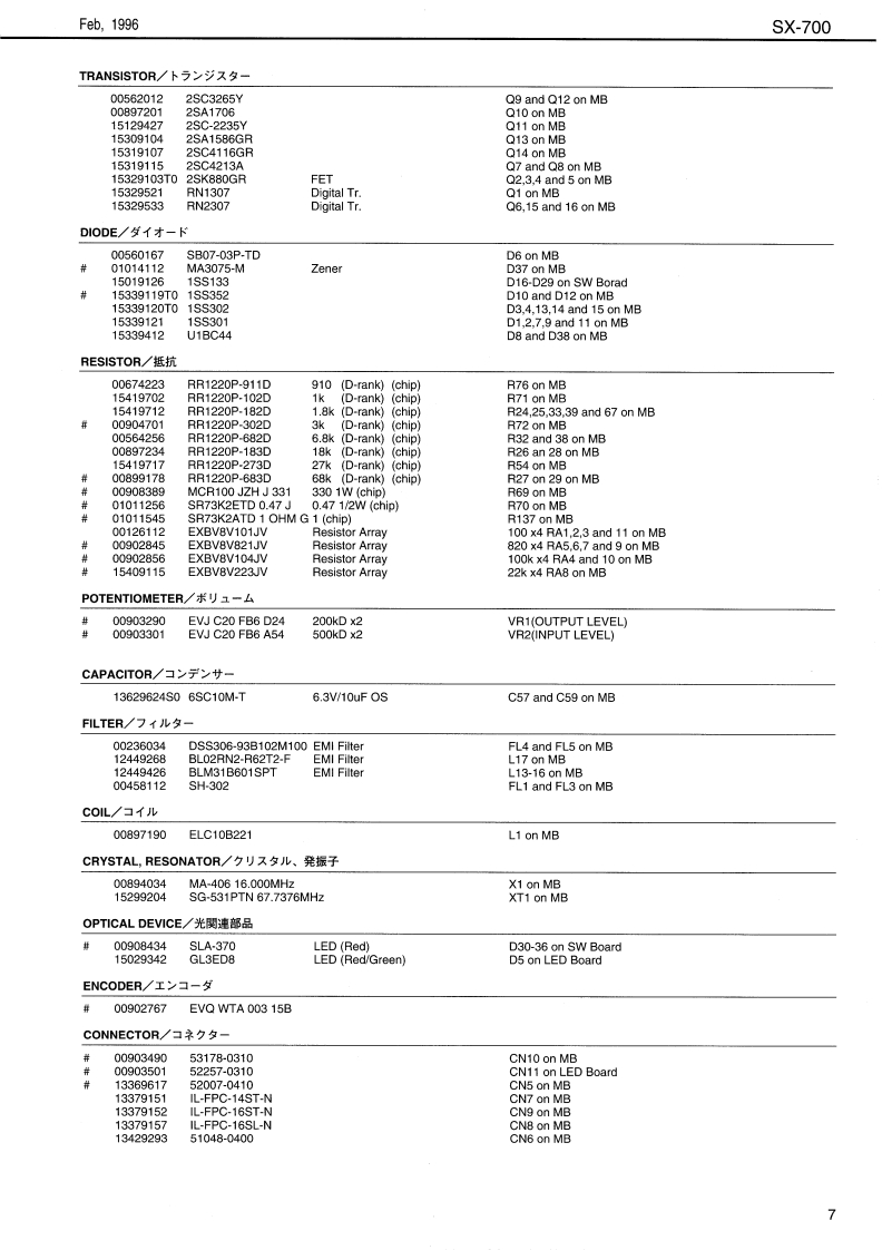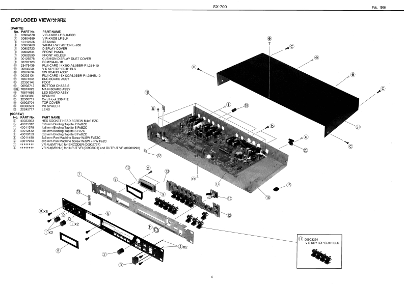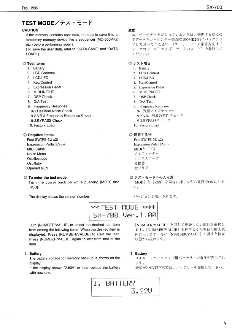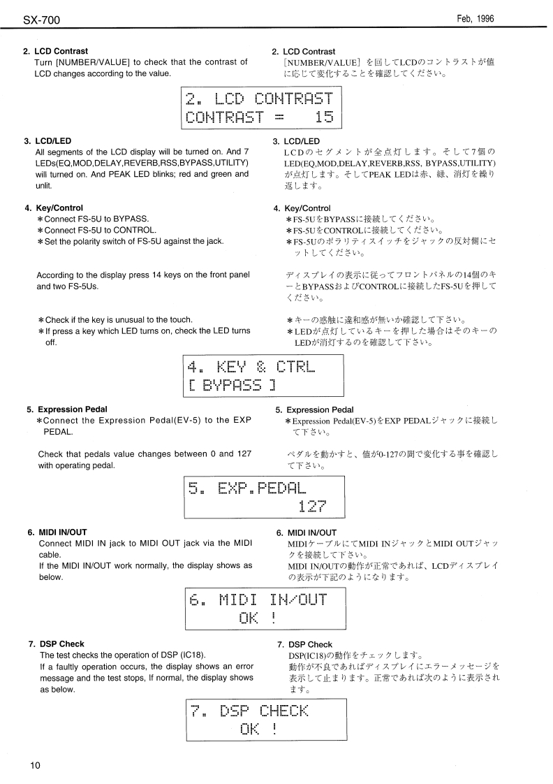 Feb,1996SX-700OSS5X-700 SERVICE NOTESSTUDIO EFFECTSFirst EditionPROCESSORIssued by RJATABLE OF CONTENTS目次PageSPECIFICATIONS·仕樣……2LOCATION OF CONTROLSパネ儿配置☒……3EXPLODED VIEW.............................分解☒…………4BLOCK DIAGRAM.............................ブ口y夕☒…5PARTS LIST..................................パ-又卜…68TEST MO0DE…デ卜E-K…912IDENTIFYING THE VERSION NUMBER·/バ-ヅョ>)確認方法…13RESTORING THE FACTORY PRESETS·フ刀夕卜)-·プ)七y卜)設定方法13DATA SAVE…デ-夕の七-ブ…14、15DATA LOAD..................................デ-夕の口-…16TROUBLESHOOTING卜与ブ儿之1-子1分…17ERROR MESSAGE............................工ラ-火y七-ヅ…18、19MAIN BOARD ASS"Y............................MAIN BOARD ASS'Y…20~22SW BOARD ASS'Y............................SW BOARD ASS'Y…2022LED BOARD ASS'Y…LED BOARD ASS'Y…2022ENC BOARD ASS'Y…ENC BOARD ASS'Y…20~22IC DATA.......................agg。。。。。。Cデ-夕…23CHANGE INFORMATION.......................姿更案内…24☒日0S5EFFECT AARAMETEN8器凸留誉5-7000+t作053名昌尚凸晋里Roland17059832Copyright c 1996 by ROLAND CORPORATIONPrinted in Japan(AFAO)(CR)1