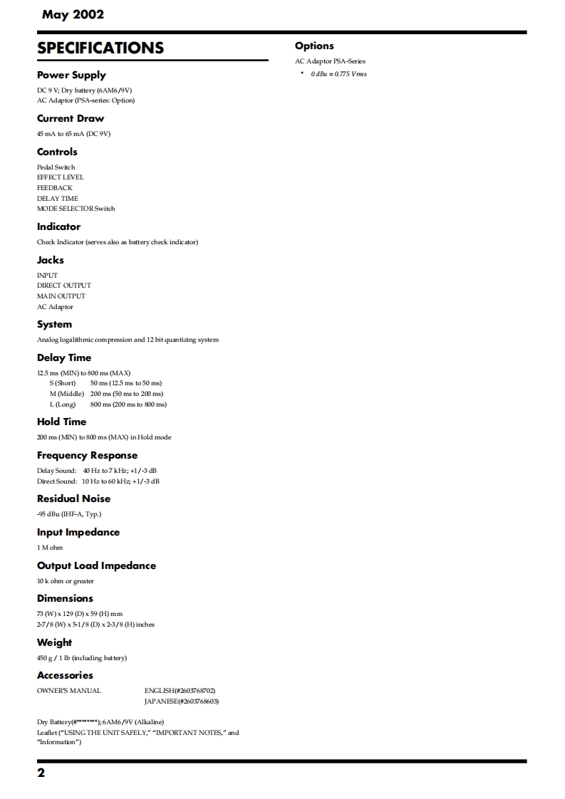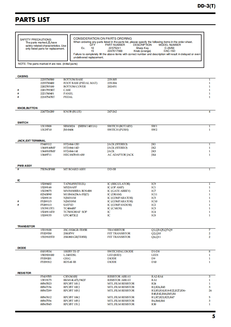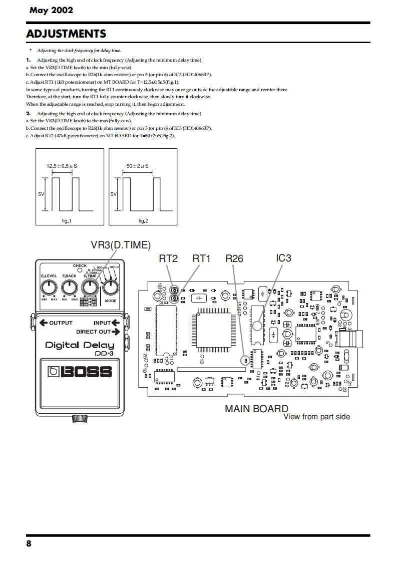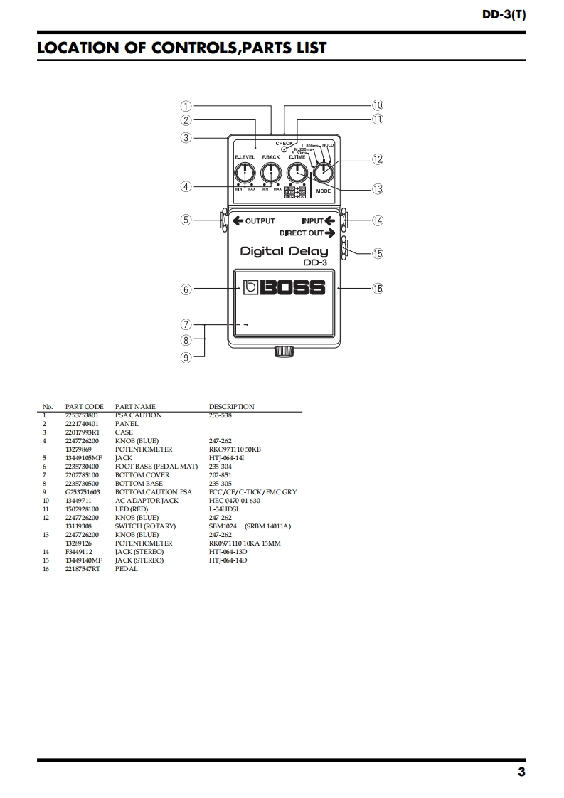 May 2002DD-3(T)回E▣68PP-3DSERVICE NOTESThird EditionDigital DelayIssued by RJASPECIFICATIONS......2LOCATION OF CONTROLS,PARTS LIST.....3EXPLODED VIEWPARTS LIST..4PARTSADJUSTMENTS....8CIRCUIT BOARD......9CIRCUIT DIAGRAM...10WARNINGThere are three types of DD-3(T)with different circuitry called "DD-3","DD-CHECK3Aand "DD-3B".The pedals of all three types are labeled "DD-3".L800ms、H0LD●We call the new type of this model,DD-3B for identifying the old type andE.LEVEL F.BACKD.TIMEnew type for convenience on service system.Check the model name as follows.Of the three types,only the appearance of the "DD-3"is different.Identify the"DD-3"or the "DD-3A or DD-3B"by the shape of the adapter jack as shown in●●●the following figure.Theappearance of the"DD-3A"and the"DD-3B"are the same.Due to aMN MAX MIN MAX哥MODEDRAM change,it has been changed to "DD-3B"from serial No.SO91200 of1912LOT (produced in August 2001).It can be identified by the serial numberThe"DD-3A"and "DD-3B"can also be identified by the silk-screen printingon the board.←OUTPUTINPUT←When referring to the service notes or ordering parts,check the model nameusing the above process.DIRECT OUTThis service note is for the "DD-3B".Refer to "DD-3A SER VICE NOTES"(#17059557)when repairing the DD-3A.Variable resistor,switch andmechanical parts for the "DD-3A"and "DD-3B"are compatible.Refer to "DD-2/3 SER VICE NOTES"(#17059183)when repairing the DD-3.Digital DelayDD-3回口⑤E▣SDD-3A or DD-3BDD-3Copyright 2002 ROLAND CORPORATIONAll rights reserved.No part of this publication may be reproduced in any form without the written permissionof ROLAND CORPORATION.Roland17059557E3Printed in Japan(0800)(AS)