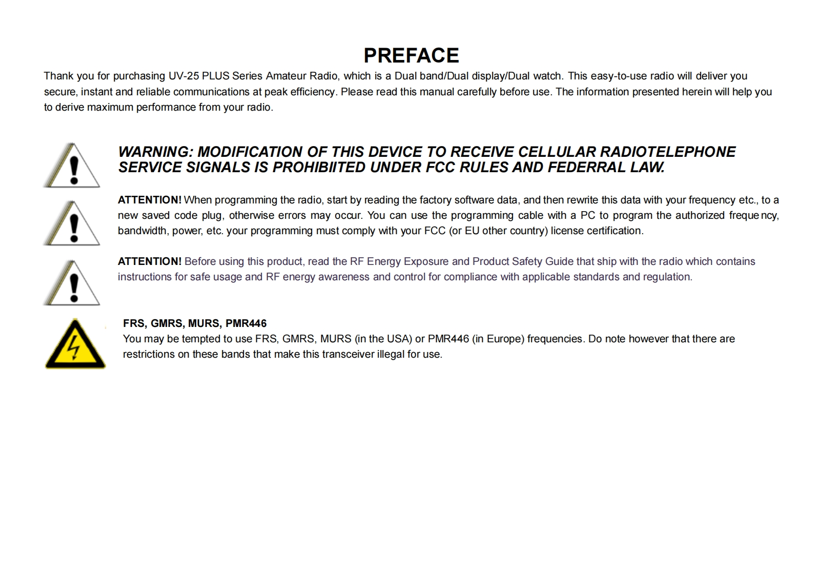 Baofeng-UV-25-PLUS-Manual使用说明书手册找手册网29天前发布关注私信3.75MB44页049Baofeng-UV-25-PLUS-Manual使用说明书手册此内容为付费资源,请付费后查看¥19¥21黄金会员免费钻石会员免费登录购买付费资源 第1页 / 共44页 第2页 / 共44页 第3页 / 共44页 第4页 / 共44页 第5页 / 共44页 第6页 / 共44页 第7页 / 共44页 第8页 / 共44页 第9页 / 共44页 第10页 / 共44页 试读已结束,还剩34页,您可下载完整版后进行离线阅读 THE END宝峰 文本预览 BAOFENGAmateur RadioUV-25 PLUSUSER'S MANUAL 查看更多 收起部分 喜欢就支持一下吧收藏
