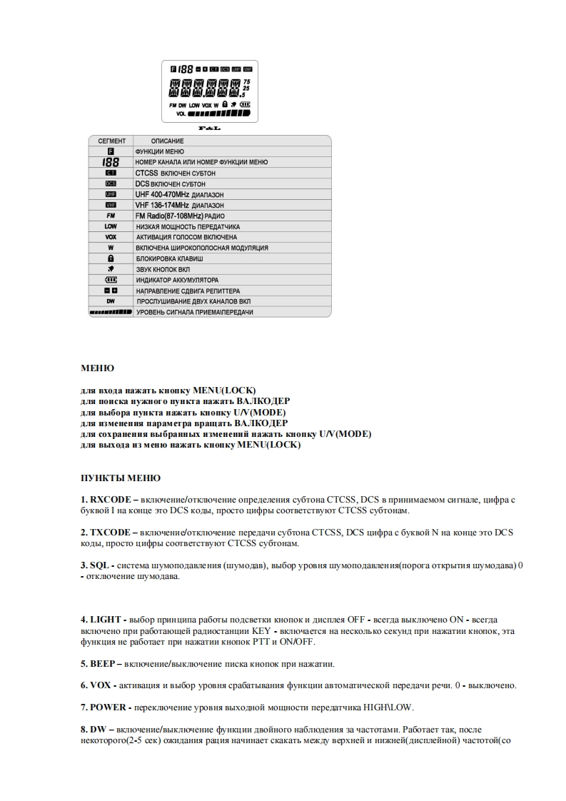 3 AOFENG®HCTPYKIIAΠOOKCΠIIYATAIIHPAIOCTAHIIABAOFENG UV-3R series1.TEXHHKA BE3OIIACHOCTH.CneayiomHe Mepbl npenocTopoKHocTH AOTKHbI cooroaTbca np paoore,oocJyKHBaHHH H peMonTeHaHHoro ycrpoicTBa..aHHoe ycrpoiicTBo 0JKHo 06cJyHBaTbCa TOJILKo cnennaJbHo ooyeHHbIMH cnennaJncTaMH.He BHocHre H3MeHeHna B KoHcTpyKnmio painocTan!Henoib3yiiTe 3apaanble yerpoiicTBa 6aTapen BLmnycKaeMbie 0n06pennble KoMnanneii BAOFENGHe Hcno3yiire paanocranun c noBpekaennoii anrennoi.IIpa Kacannn noBpekaennoi anrennIaCTHMH Tea BeJHKa BeposTHocTb noJIyHTb OKor..BLIK novaiire pamnocTanumio nepea TeM,Kak BoiT B 3ouy Haxokenns B3pLIBoonacHLIX HJerKoBocnJameHsomxca BemecTB.He 3apskaiire oaTapelo B 3oHe Haxokenna B3pLIBoonacHLIx H erKoBocnnamenaomnxca BemecTBBo H36exkaHHe co3anns 3eKTpoMar HTHLIX HOMex HJI npooJeM COBMeCTHMOCTH BLIKMOaiiTepaAnocTaHnio B Tex MecTax,rae 3To Tpeoyeres,ocooeHHo rae ecTb HHopManHoHHble TaQHKH cHanOMHHaHHeM 06 9TOM..BLIKJoaire panocTanumo nepea nocaakoii B camoneT.Joooe HcnoJ3oBaHHe paHocTaH 0TKHOCOOTBeTCTBOBaTb npaBHJaM aBHaKoMnaHHH IH HHCTPyKIHAM 3KHnaKa.BLIKJoaire parnocTanumo nepea nonalanneM B 3ony npoBeaenna B3pbIBHbIX paooT..is aBTomooneii c noayuKaMn 6e3onacHocTn:ne pa3memaiire paanocranumo B 3oHe cpa6aTbIBannsnoaymek oe3onacHocTH HJH HenocpeacTBeHHo Ha Hx KpblmKax.He noBepraiire painocrannmo Bo3eiicTBmo npaMbIx coHenix nyueii,He ocranmaire BOIH3HHCTOYHHKa Temia.IIpu Beaenuu nepeaan c noMombio paanocTanunn epxknTe ee BeprnkaJHo Ha paccToanHn 3-4 CM orJHna.epKnTe antenny Ha paccTogHH MHHHMYM 4 CM OT Bamero Tena.Downloaded from www.rads.ru