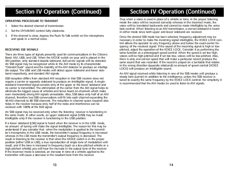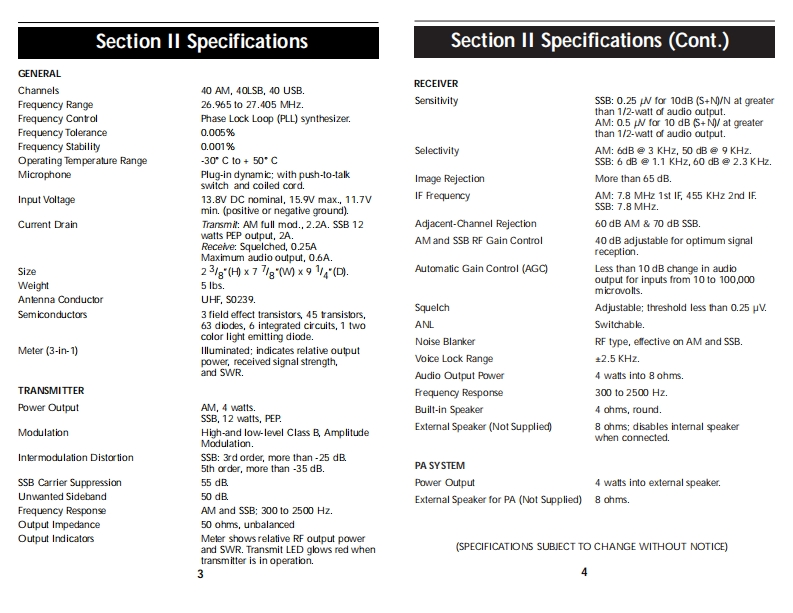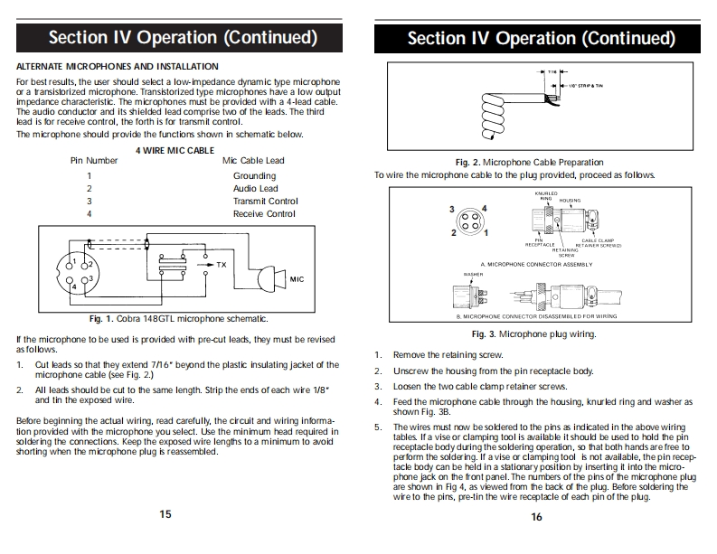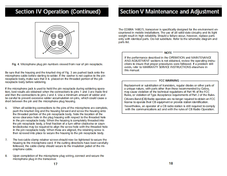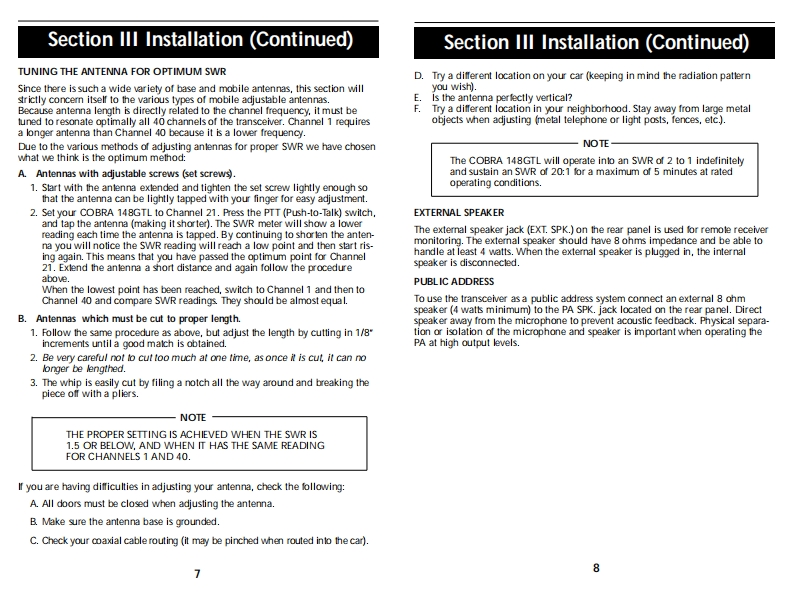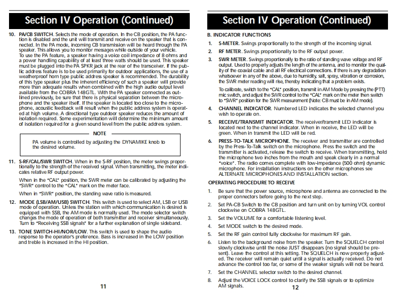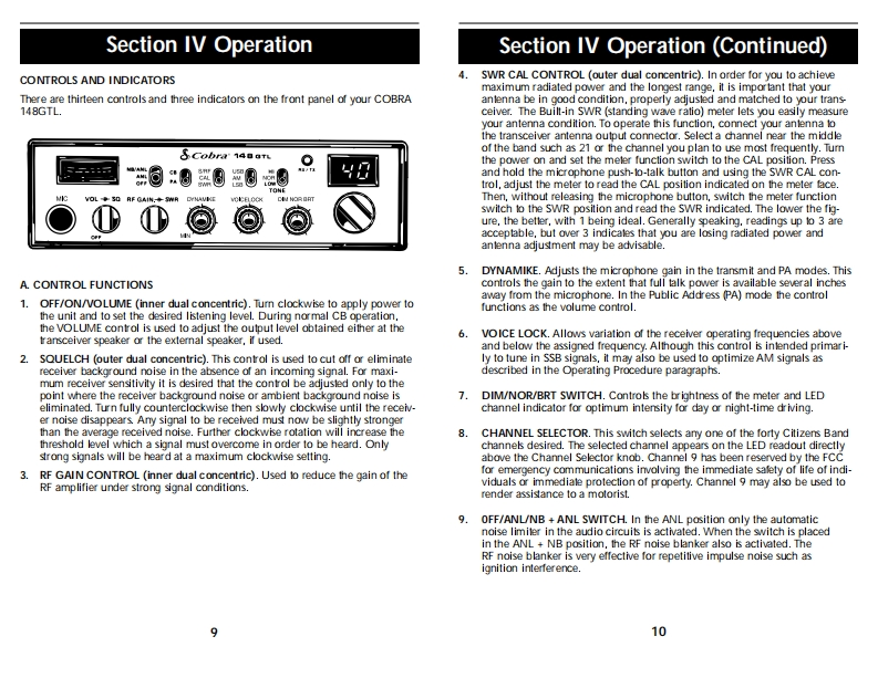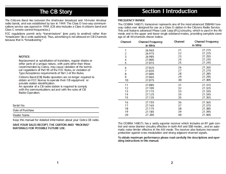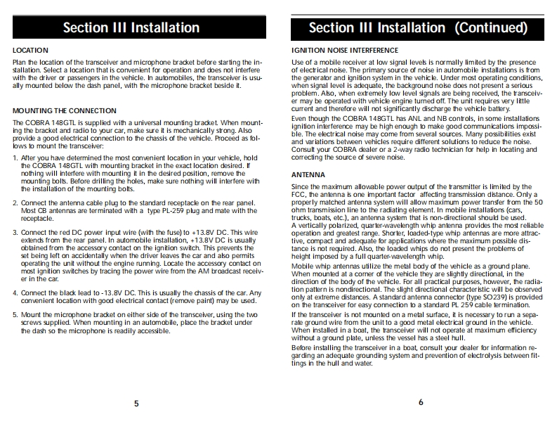 OPERATING INSTRUCTIONS FOR YOURHow To Use YourSCobraSCobra40-CHANNEL40 CHANNELCITIZENS BANDCITIZENS BANDSSB/AM 2-WAY MOBILE RADIOModel 148 GTLSSB/AM 2-WAYContentsPageMOBILE RADIOThe CB StorylSection I:Introduction....2Section I:Specifications..4Section II:Installation.5.6,7,8Model 148 GTLSection IV:Operation.....9.17Controls and Indicators..9A.Control Functions.9.10,11B.Indicator Functions.…….12Operating Procedure to Receive...............................................12Operating procedure to Transmit.....................13Receiving SSB Signals..........................................13,14Alternate Microphones and Installation ...................15,16,17Section V:Maintenance and Adjustment .............................18-21FCC Warning..181480Section VI:Appendix...19.20,21909840Ten Code.19A few Rules That Should Be Obeyed.20How Your CB Can Serve You ........20Use Channel 9 for Emergency Messages Only.21Warranty Service Instructions.22Limited Two Year Warranty....23Cobra CB Radio AccessoriesInside Back Cover