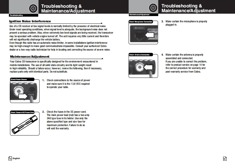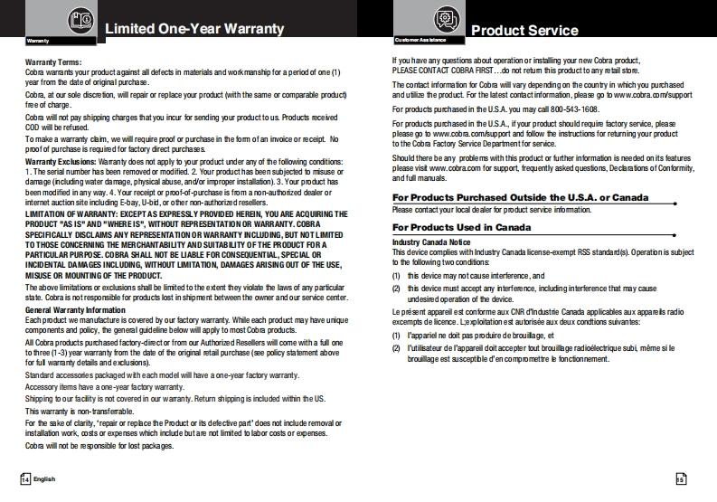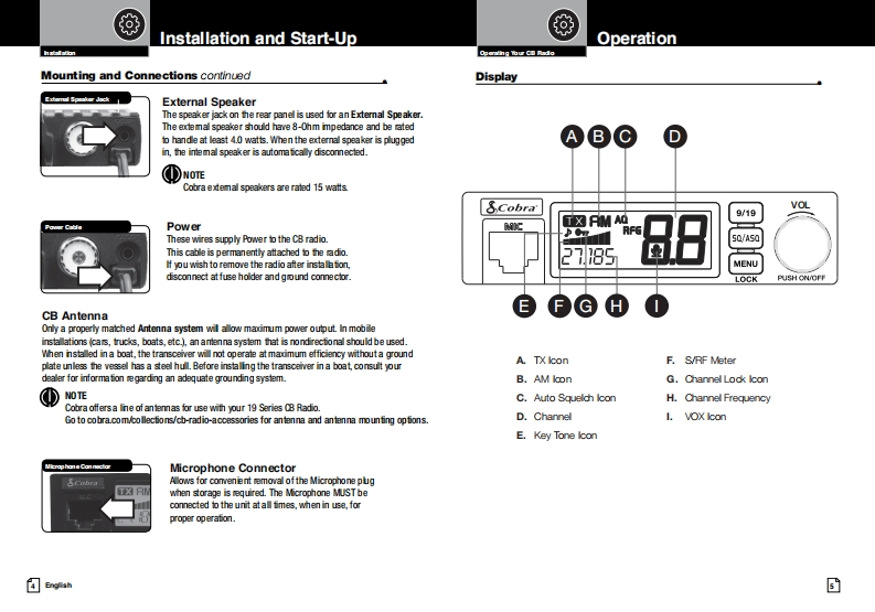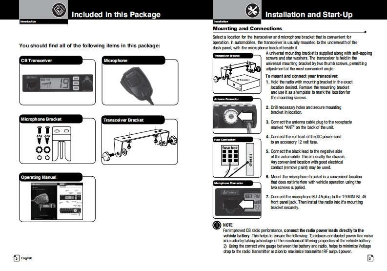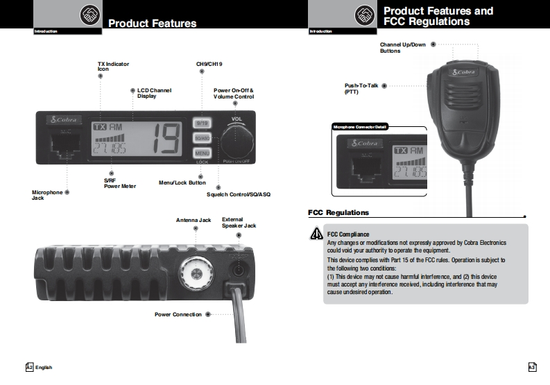 8CobraSCobraOur Thanks,The CB Story,and Customer Assistance19 MINIThanik you for purchasing the Cobra 19 MINl CB Radio Tnsceiver.Properly used,this Cobra product will ghve you many years ofCB Radio Transceiverscliable servce.The Citzens Band Storyhe CBand ks boton he shortave broudcst and 10-mter amteur radoband,ads山过d by lain19盟The Cis0o-y communic6sates年rdin1B2因l山dsa0 s A ci xon6dad0 C remote controlFexgxncKs)Custom or Assistanceodd you ancourter any prolos with地o线ud如aku线,uo irtalation plese rekr othe能orn's minuiL【you rexire山M送送a的t色雀nuL罐ehre to h年Hanve qusto6争0tt0r鱼日cfonics attp/m.cora.compigs恤tt-运o8053-160gM-F 900AM 5PM EST3 AMFor Assistanoe Outside the ULS_AComct Your Loe DeaerOwner's Manual回wh