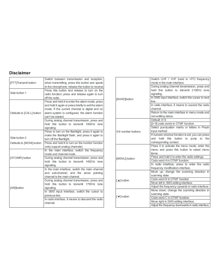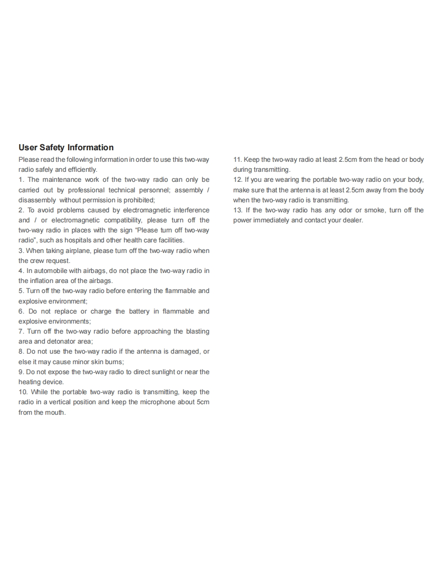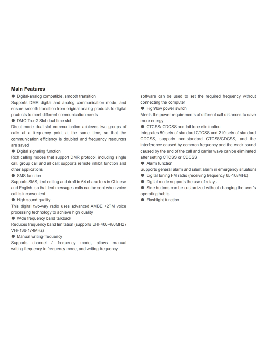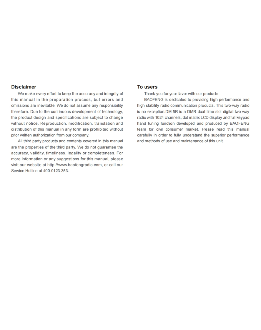 Baofeng_DM-5R_Manual操作说明书手册找手册网30天前发布关注私信12.43MB44页028Baofeng_DM-5R_Manual操作说明书手册此内容为付费资源,请付费后查看¥19¥21黄金会员免费钻石会员免费登录购买付费资源 第1页 / 共44页 第2页 / 共44页 第3页 / 共44页 第4页 / 共44页 第5页 / 共44页 第6页 / 共44页 第7页 / 共44页 第8页 / 共44页 第9页 / 共44页 第10页 / 共44页 试读已结束,还剩34页,您可下载完整版后进行离线阅读 THE END宝峰 文本预览 Baofeng DM-5RHP167.1275001187.18750A/BBAOFENG BADEXIT34B7溪日mDM-5RHandheld Digital TerminalUSER'S MANUALRECYCLED PACKAGING 查看更多 收起部分 喜欢就支持一下吧收藏