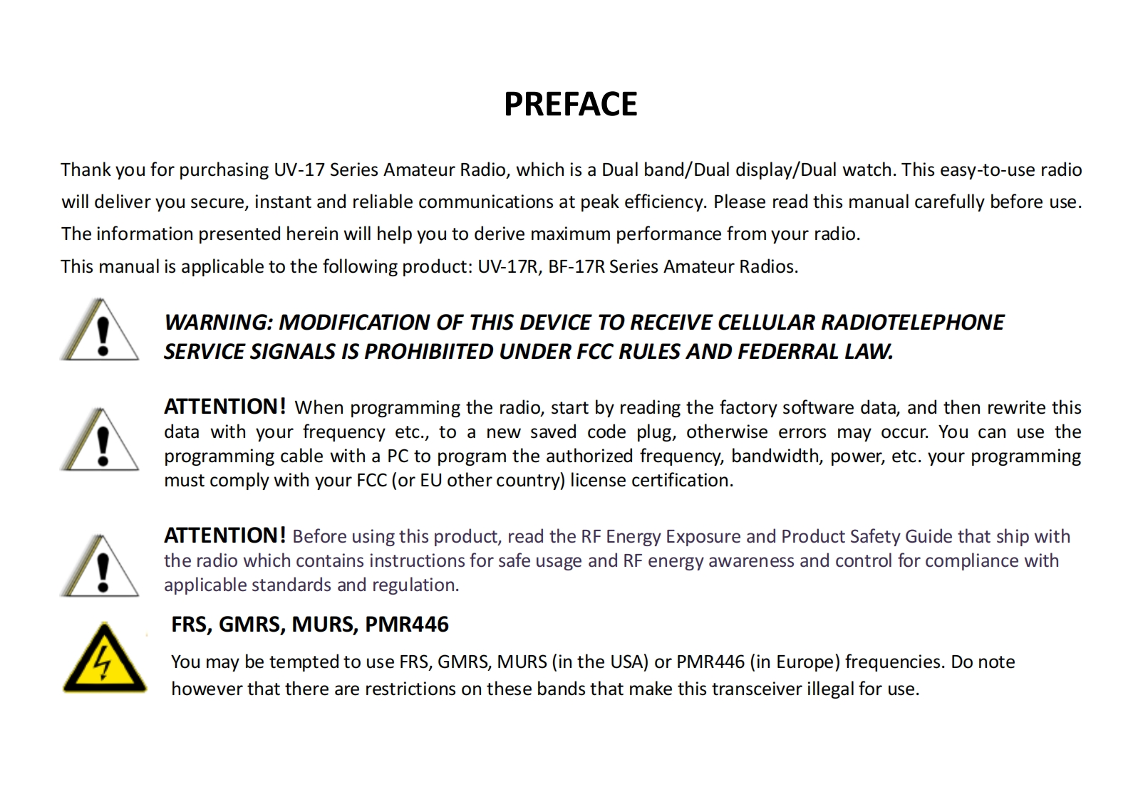 Baofeng_UV-17R_使用说明书手册_2023找手册网30天前发布关注私信3.54MB41页050Baofeng_UV-17R_使用说明书手册_2023此内容为付费资源,请付费后查看¥19¥21黄金会员免费钻石会员免费登录购买付费资源 第1页 / 共41页 第2页 / 共41页 第3页 / 共41页 第4页 / 共41页 第5页 / 共41页 第6页 / 共41页 第7页 / 共41页 第8页 / 共41页 第9页 / 共41页 第10页 / 共41页 试读已结束,还剩31页,您可下载完整版后进行离线阅读 THE END宝峰 文本预览 日AO=ENGTwo Way RadioUV-17R SERIESUser IManua 查看更多 收起部分 喜欢就支持一下吧收藏