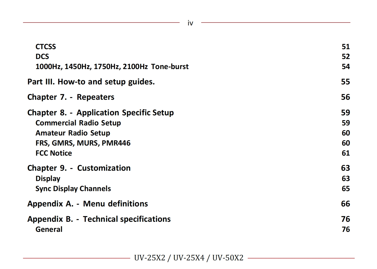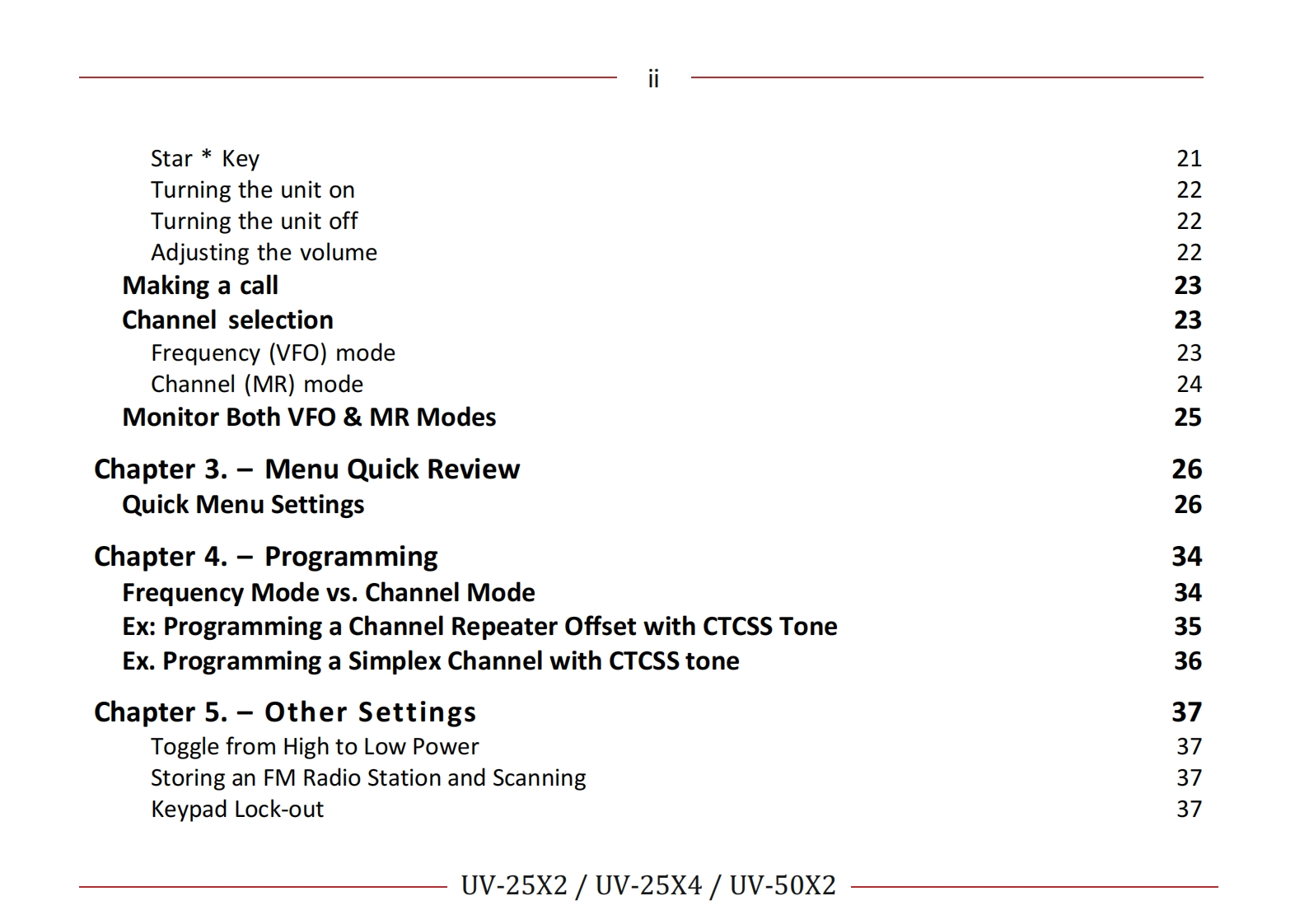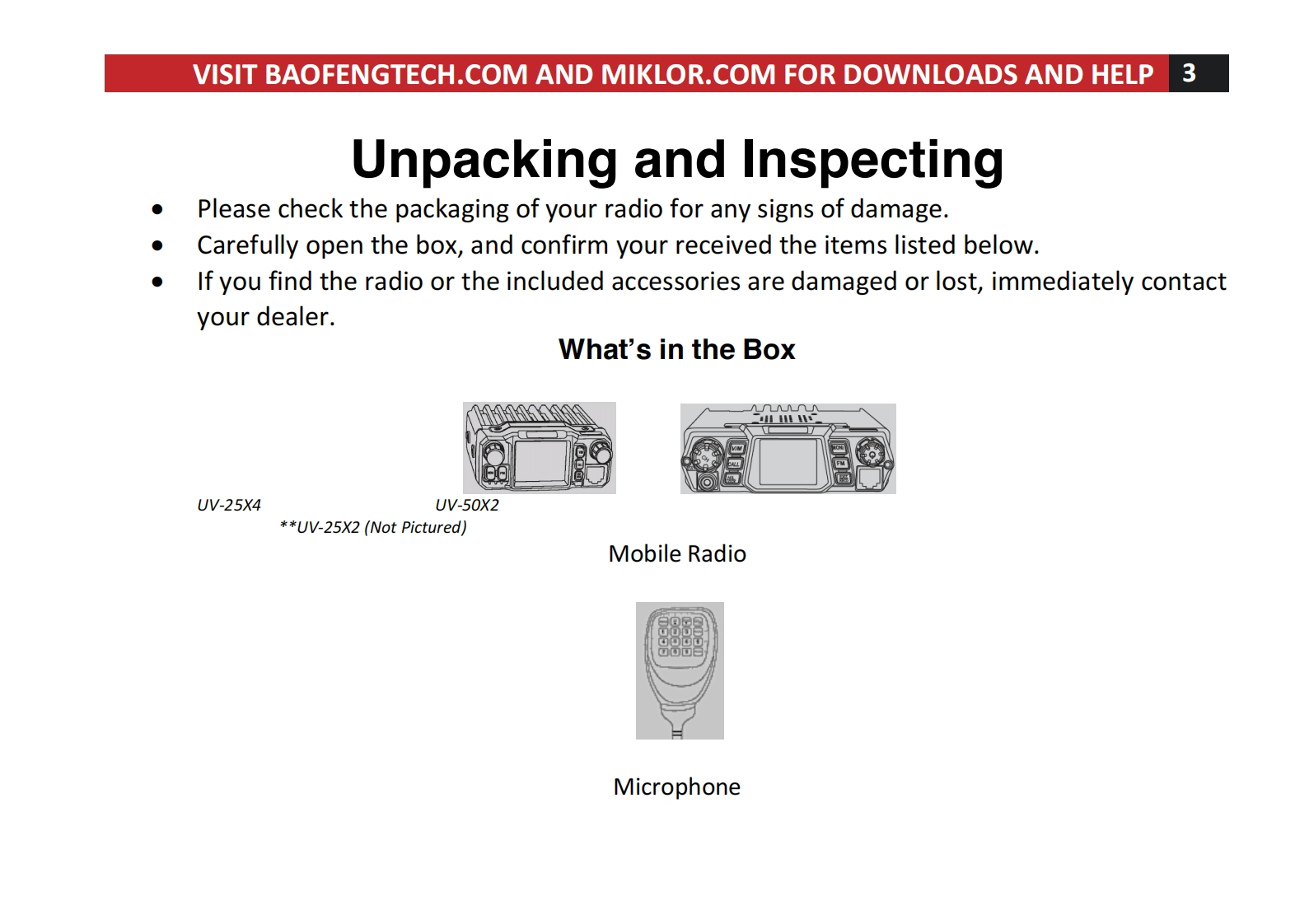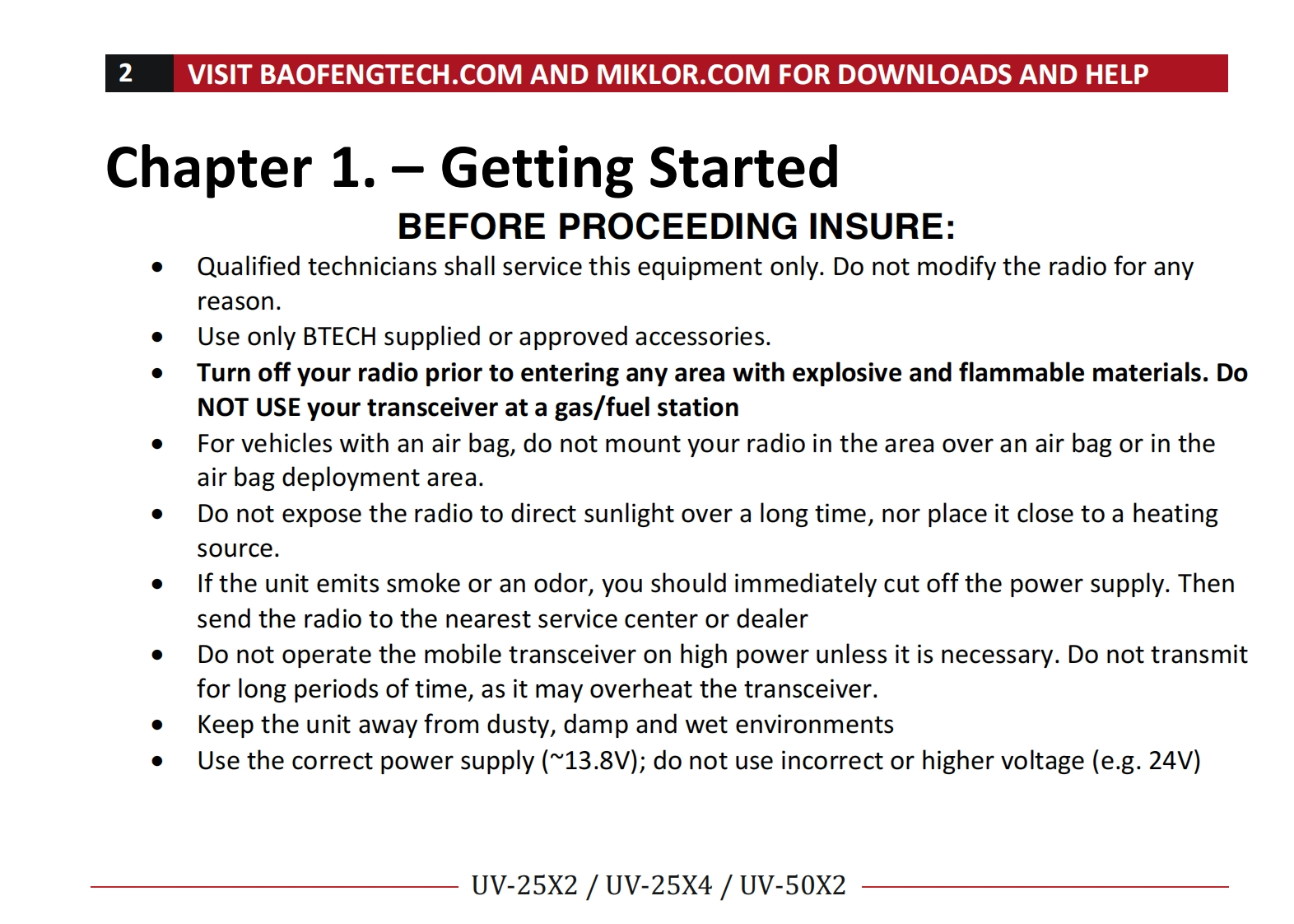 Copyright 2017 by BTECH;https://baofengtech.comAll rights reserved.No part of this publication may be reproduced,distributed,ortransmitted in any form or by any means,including photocopying,recording,orother electronic or mechanical methods,without the prior written permission of thepublisher,except in the case of brief quotations embodied in critical reviews andcertain other noncommercial uses permitted by copyright law.For permissionrequests,write to the publisher.Contributions taken from:Miklor.com Resource Site,and Jim Unroe,KC9HI.Used bypermission.All rights reserved.THANK YOU FOR YOUR PURCHASE OF THE BTECH:UV-25X2.UV-25X4,or UV-50X2.THIS MULTI-BAND RADIO WILL DELIVERINSTANT RELIABLE COMMUNICATION.PLEASE READ THIS MANUAL CAREFULLY BEFORE USE