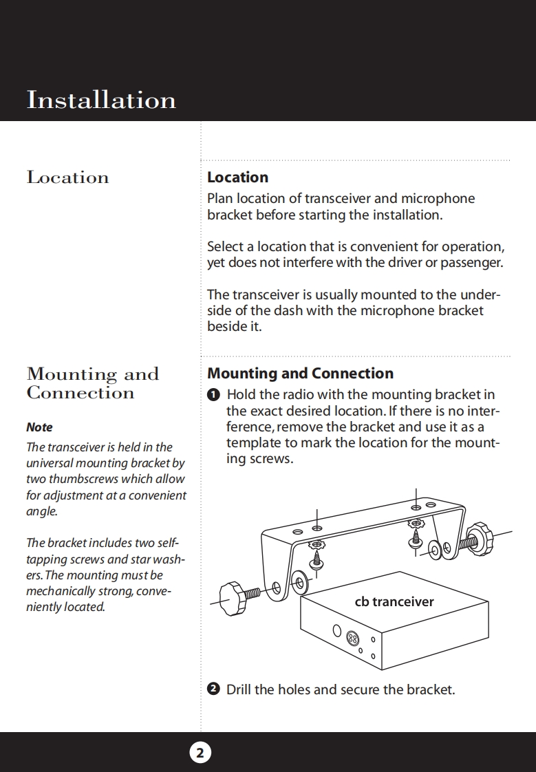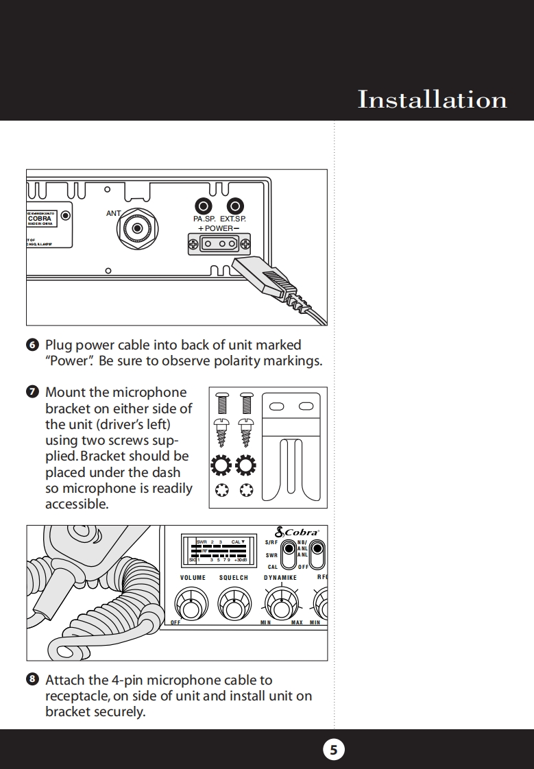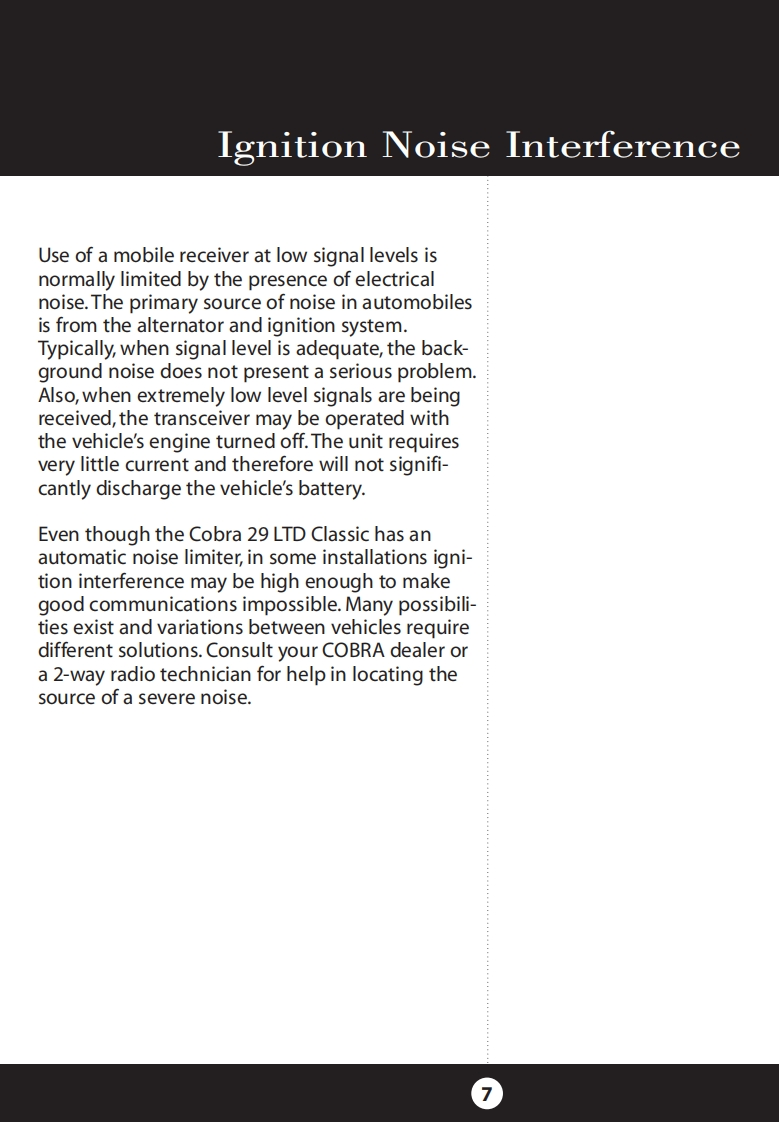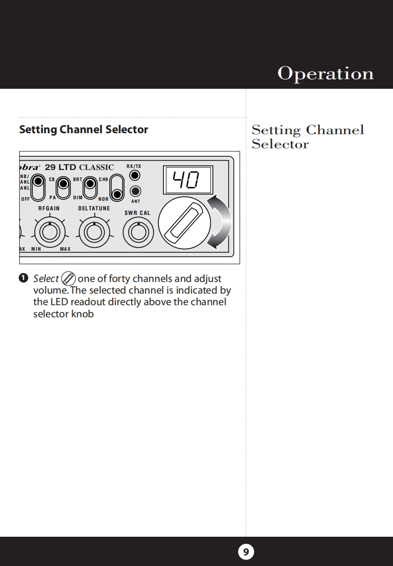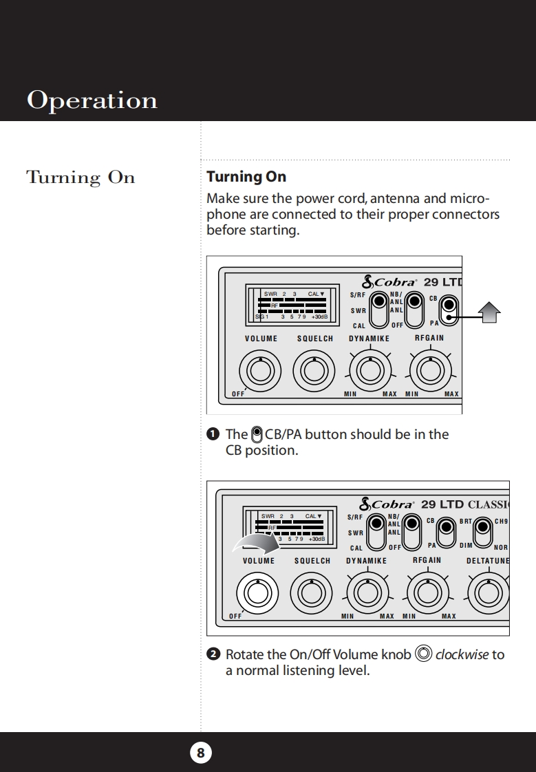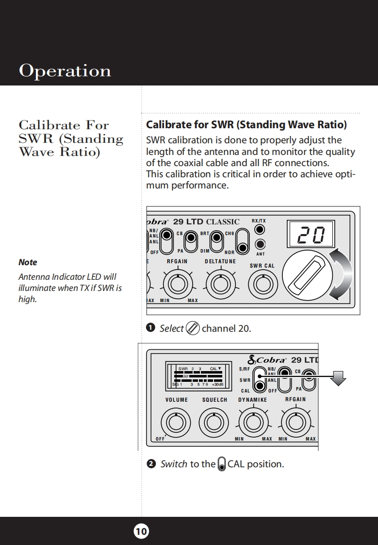 How to Use YourCobra 29 LTD ClassicFeatures.u…The CB Story........FCC RegulationsFCC WarningsIncluded AccessoriesControls Indicators.A2Our Thanks to You......A3Customer SupportInstallationLOCatiOn2Mounting and ConnectionFeatures of This ProductAntennas40 CB Radio ChannelsCB Antenna....6Marine Installation.......6Heavy-Duty DynamicIgnition Noise InterfaceOperating Your 29 LTD Classic7MicrophoneTurning On Your CB.....8Full 4 Watts AM RF Power OutputSetting Channel Selector......9Calibrate For SWR(Standing Wave Ratio).10SWR Calibration MeterTo Receive.......13Selecting a Channel........14Instant Channel 9S-Meter.…14NB-ANL/ANL/Off(Noise Blanker/Automatic..154-Pin Microphone ConnectorNoise Limiter Switch)Bright/Dim Switch.16Delta-TuneRF Gain Control......17Setting Delta-Tune.18Switchable Automatic NoiseSetting Squelch...18Limiter Noise BlankerTo Transmit.…20Setting Dynamike..20Adjustable Dynamike BoostTransmit.....21RF Meter.......22External Speaker.....23PA (Public Address).......24Home And Office Set-Up26Temporary Mobile Set-Up.How Your CB Can Serve You....2728A Few Rules You Should Know...28Channel 9 Emergency Messages28CB10C0deS.….30Frequency Ranges.…3229 LTD Classic Specifications....33CAUTIONWarranty Information ......34RISK OF ELECTRIC SHOCKNotes........35DO NOT OPENOptional Accessories.....38CAUTION:TO REDUCE THE RISK OF ELECTRICOrder Form....….40NLSER SERVICEABLE PARIS INSIDEIf You Think You Need Service........Back Cover