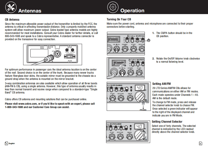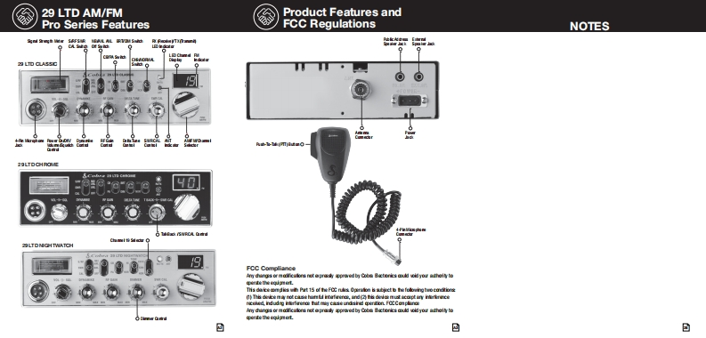 SCobraSCobraOur Thanks,The CB Story,and Customer AssistanceThanik you for purchasing the Cobra 2 LTD AMFM Pro Sees CBRadioTmsnseei.Properly used,tis Co边ra product will give yo阅many years29 LTD AM/FM SeriesProfessional CB Radiod山e包恤Lrha,0ce道ad由bo尚da血尚of cormurieslonor pirsonl ue and the四由swt线ss址bhid by las nthe返h19 It wsnt unlP¥n1⊙aded4W Power /40 Channelswnd适的ftck地等d年线and road ha由.Cisro Bard Rado Snic线d站d功durnl fegarcis hta维mah10地ptTsronthr ponr i it通b4d线inh区du球cin vary de年ding on the lmain andd与of the podet0 rsrth the Cisro Bard sric线比s not regieal比user年ration rigde适do然sfromPestion For FCCPan 65 Rule Changesh过i线0t适deF优torebe延运ds鱼e国da的u4roWWw.cbradio.ntafaino道,tih inprovs he stind山dd tuo-td立ad6鱼bineft to the aso.Though the dset dfats d Cobra Eldroics and he enfusiistc sppod fron loril cutorrs ande由tibtion netrork he F位tdeq丝nhai,过第ofid ally wis年dhd地clud A as n gptionfo tro尚td出丝Ta些husb0士mtte出'tiors toipore he qaly d the0 r Bind Radiogwt线drs can anjoy the binefts of四d金cormmnicalonin金pe of indotries08:8dd9Customer Support霜恩本本丙nko衡色he地onn's minusL If you squire futh时送过ut线键ag地Service.Orders Product QuestionsFor Assistance Outside the USACotict Your Loodl Deakr出an29LTD Cassc NightWatch/ChromeOWNERS MANUAL14-2TDTHH01回w