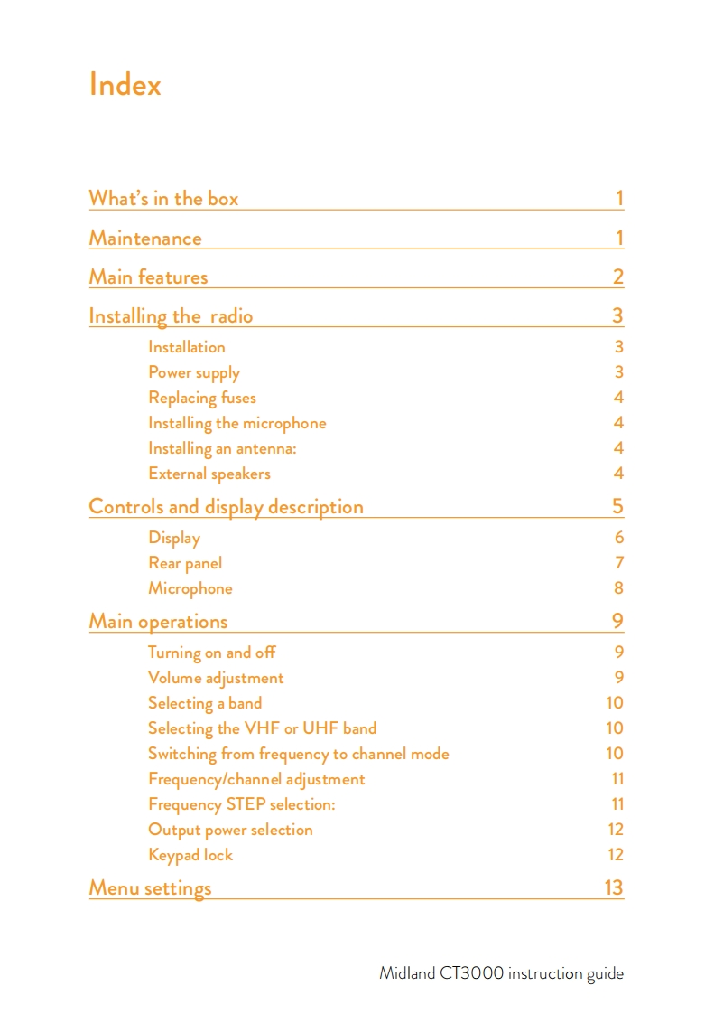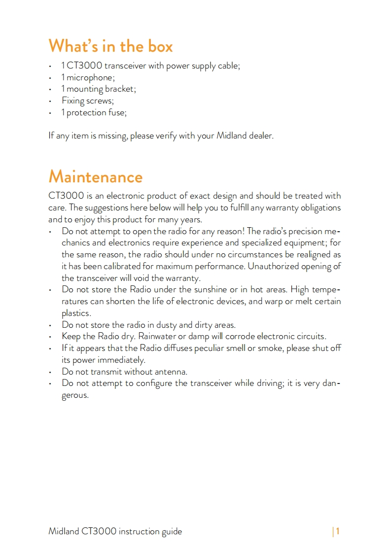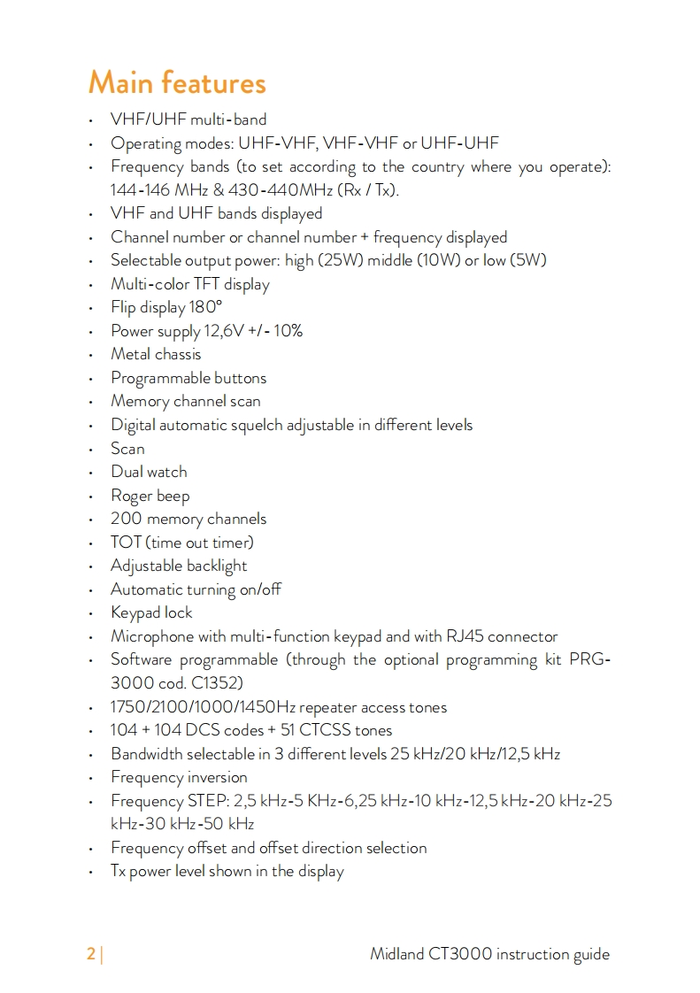 Midland-CT3000-UK使用说明书手册找手册网10小时前发布关注私信0.92MB36页025Midland-CT3000-UK使用说明书手册此内容为付费资源,请付费后查看¥19¥21黄金会员免费钻石会员免费立即购买您当前未登录!建议登陆后购买,可保存购买订单付费资源 第1页 / 共36页 第2页 / 共36页 第3页 / 共36页 第4页 / 共36页 第5页 / 共36页 第6页 / 共36页 第7页 / 共36页 第8页 / 共36页 第9页 / 共36页 第10页 / 共36页 试读已结束,还剩26页,您可下载完整版后进行离线阅读 THE ENDMidland 文本预览 CT3000DUAL BAND VHF/UHF MOBILE TRANSCEIVERINSTRUCTION GUIDE102MIDLAND308A/B88MAINCT3000P4P2P5midlandeurope.comP3P6FUNCMIDLANDSPECIAL FEATURES25W3WOutputFlip function Extra loudPower180°speakerMAIDLAND 查看更多 收起部分 喜欢就支持一下吧收藏
