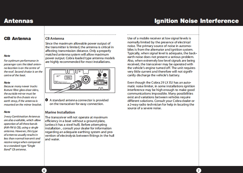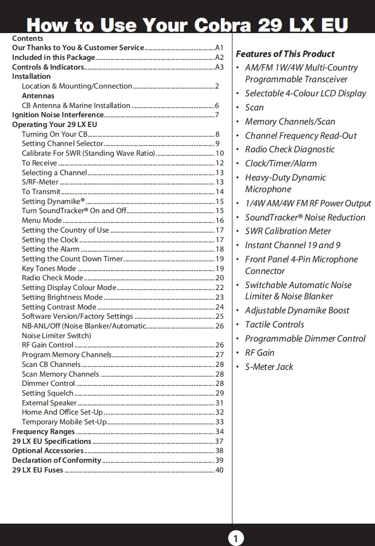 SCobra°29LxEUOur Thanks to You andCustomer ServiceOperating Instructions for yourThank you for punchasing the Cobra 29 LX EU CBRado Tamcdiver.Propedy used,this Coba productCobra 29 LX EUNOTICECB RadioBefore uing this tansceiver,plaase chec that the98e8a2arogula tionsvalidin the country where the productib四nd programming,asd0a他0 d in this ownersThe Cobra line of quality products includes:a学6a1W/40 CHFM4WLDownloaded from www.cbradio.nlCustomer AssistanceCB RadiosShouldyouencounter any problms wth thismicroTALK Radios器6Radar/Laser De tec torsa中级直wd指g格m9alPl0如级00mayour bocal daaler.Safety Alert"Traffic Warning SystemsThis equipment is intended for use inTruck-Specitia Navigation SystemsHighGeare Accessoriesm02C2O22Cobma MarineVHF RadiosPower InvertersU.S.Pabent Nos.D625279 D6307202&D830625LED LightsFor Warnty,Po duct Service andJumpstartersAcces sory InformasonPlease contact your locall dexler or distribuorAoaessoriesfamer ifaru业箱c化Soe the andosedlealet which provides contact011 Cobra Flectronia Corpoarion日国道Cr端恒图日Pirtedin Chinaindorm adion for the Cobra internationaldistbuPart Nio.410-70-PNothing Comes Cose toa Cobra①