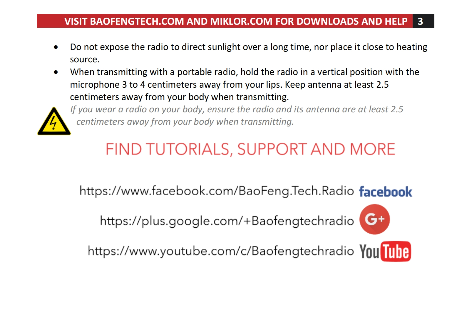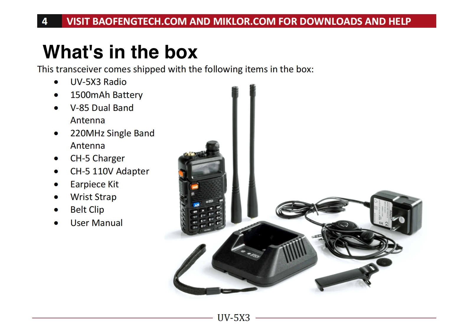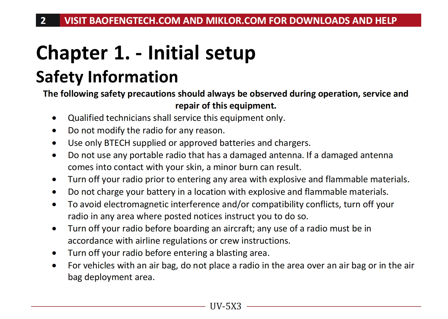 Copyright 2016 by BTECHAll rights reserved.No part of this publication may be reproduced,distributed,ortransmitted in any form or by any means,including photocopying,recording,orother electronic or mechanical methods,without the prior written permission of thepublisher,except in the case of brief quotations embodied in critical reviews andcertain other noncommercial uses permitted by copyright law.For permissionrequests,write to the publisher.Contributions taken from:"BaoFeng UV-5R User's Guide,"by The RadioDocumentation Project (radiodoc.github.io),Miklor.com Resource Site,and JimUnroe,KC9HI.Used by permission.All rights reserved.THANK YOU FOR YOUR PURCHASE OF THE UV-5X3.THISTRIBAND RADIO WILL DELIVER YOU SECURE INSTANTRELIABLE COMMUNICATION.PLEASE READ THIS MANUAL CAREFULLY BEFORE USE