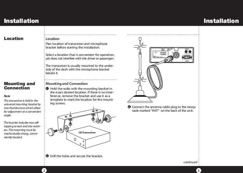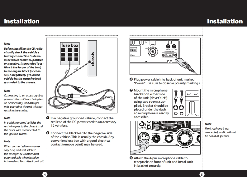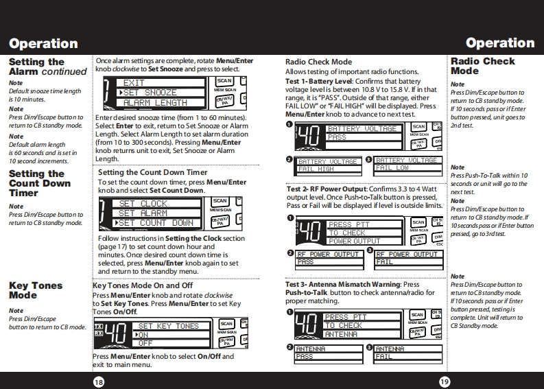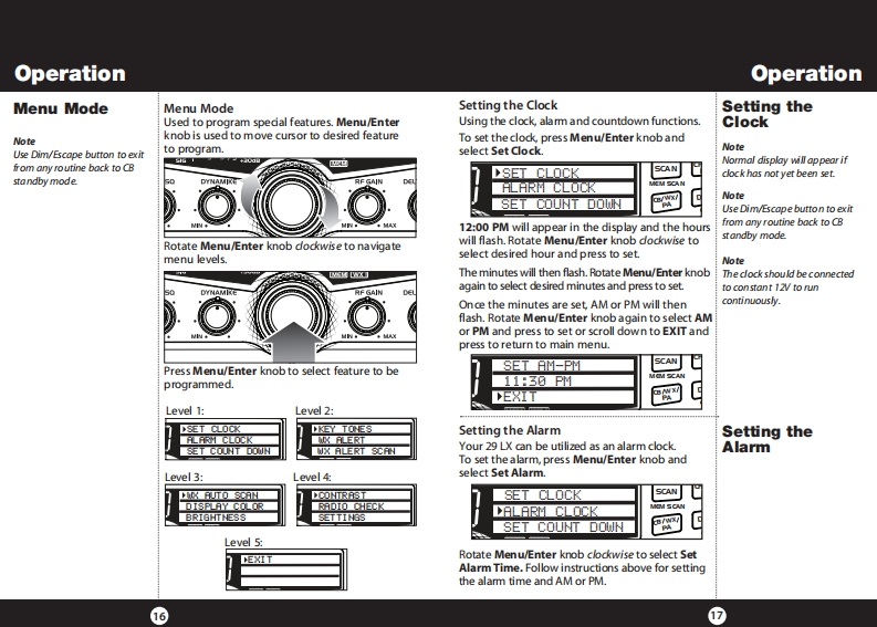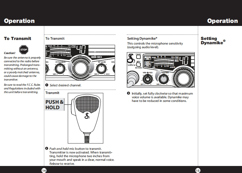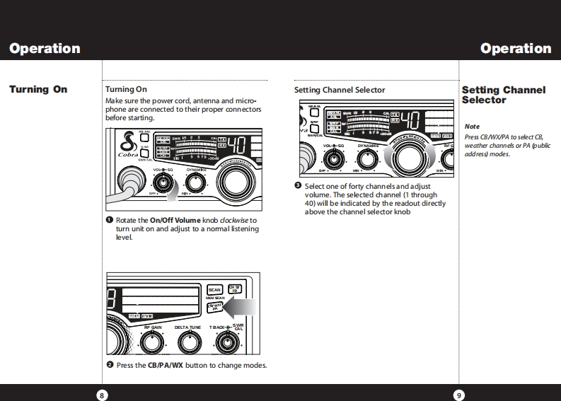 How to Use Your Cobra 29 LXContentsFeaturesFeatures of This ProductThe CB Story.FCC Regulations,FCC Warnings Included AccessoriesSelectable 4-Color LCD DisplayControls Indicators.......A2Our Thanks to You.....A310 Weather ChannelsCustomer SupportInstallationWeather ScanLocation Mounting/Connection....AntennasEmergency Weather AlertCB Antenna Marine Installation......640 CB Radio ChannelsIgnition Noise Interference................7Operating Your 29 LX40 Channel ScanTurning On Your CB..Setting Channel Selector....8.9Memory ChannelsCalibrate For SWR(Standing Wave Ratio)..10To Receive.......12Channel Frequency Read-OutSelecting a Channel...13Radio Check DiagnosticS-Meter........13To Transmit....14Clock/Timer/AlarmSetting DynamikeR.15Menu Mode....16Heavy-Duty DynamicSetting the Clock.…17Setting the Alarm.....17MicrophoneSetting the Count Down Timer.18Full 4 Watts AM RF Power OutputKey Tones Mode...........18Radio Check Mode......Setting Display Color Mode..19SWR Calibration Meter.20Setting Brightness Mode..21Instant Channel 19 and 9Setting Contrast Mode.......Weather Information.............22Front Panel 4-Pin MicrophoneWeather Channels.....23ConnectorWeather Alert Mode...Setting Weather Alert Scan....24.24Switchable Automatic NoiseSetting Weather Auto Scan....24Limiter Noise BlankerSoftware version/Factory Settings...25NB-ANL/Off(Noise Blanker/Automatic..26Adjustable Dynamike BoostNoise Limiter Switch)RF Gain Control......26Tactile ControlsProgram Memory Channels..27Scan/Memory Scan...279 Ft Mic CordScan CB Channels........Scan Memory Channels28Programmable Dimmer Control.28Dimmer Control....28RF GainSetting Squelch.....29S/RF Meter.……….30External Speaker....31PA (Public Address).....32Home And Office Set-Up......34Temporary Mobile Set-Up....35How Your CB Can Serve You...36A Few Rules You Should Know..36Channel 9 Emergency Messages.36CB 10 Codes........38Frequency Ranges....4029 LX Specifications....41Warranty Information.42Optional Accessories.....43Optional Accessories Order Info ...44If You Need Service/Trademark Info ................Back Cover