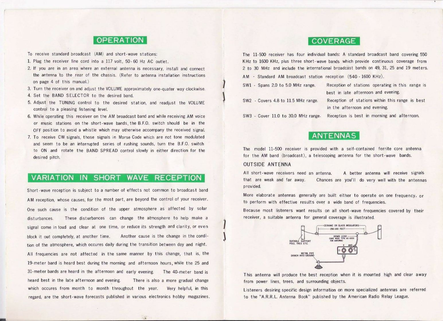 WARRANTY POLICYCourtesy KU3ERA以RINTERNATIONALInternational Corporation warrants each newproduct to be free from defects in material and workmanship under normaluse and service for a period of 90 days after delivery to the ultimate userand will replace or repair the product,at our option,at no charge shouldFOUR BANDit become defective and which our examination shall disclose to be defectiveand under warranty.AM/SHORT WAVECOMMUNICATION RECEIVERThis warranty shall not apply to any product which has beensubject to misuse,neglect,accident,incorrect wiring not of our own installation,MODEL 11-500or to use in violation of instructions furnished by us,nor exterded to unitswhich have been repaired or altered outside of our factory.This warranty does not cover carrying cases,earphones,batteries,antennas,broken or cracked cabinets,or any other accessory used in connectionwith this product.This warranty is in lieu of all other warranties expressed or implied andno representative or person is authorized to assume for us any otherliability in connection with the sale of our products.Sales receipt must accompany product to validate date of purchaseMIDLAND INTERNATIONAL CORPORATION1909 Vernon StreetNorth Kansas City,Missouri 64116OWNER'S GUIDE