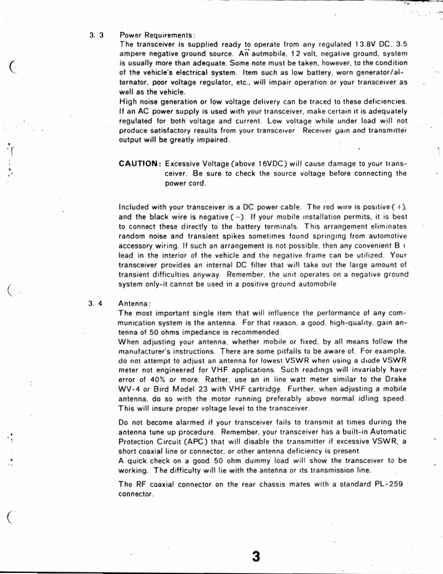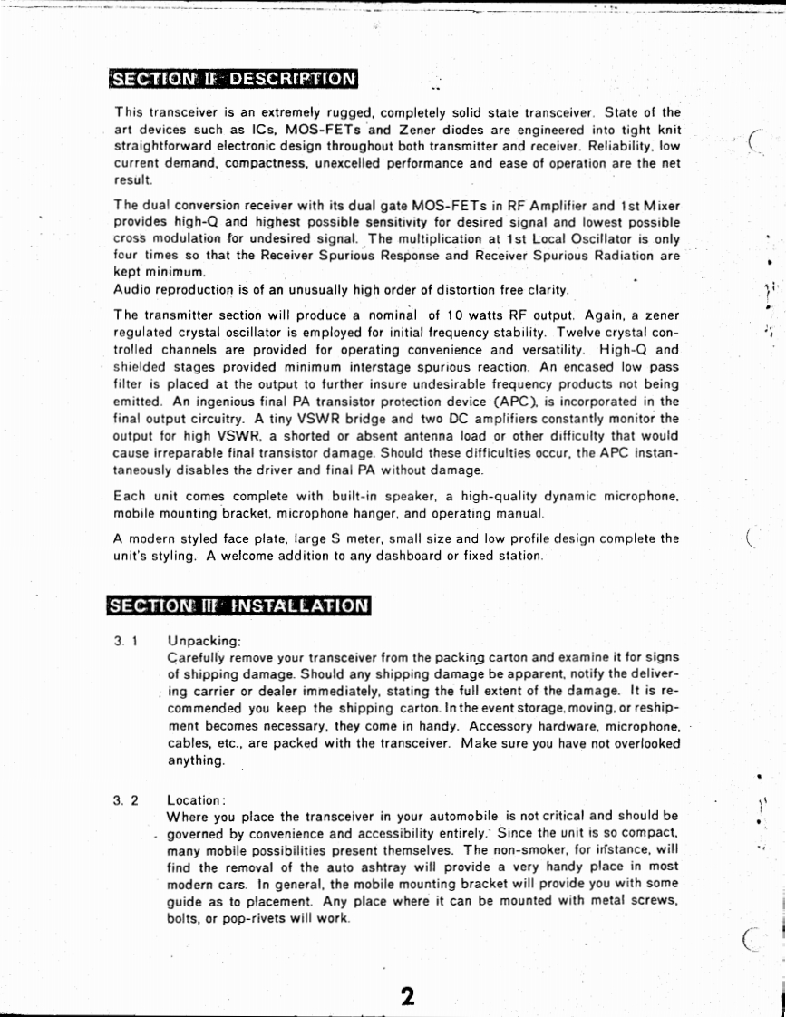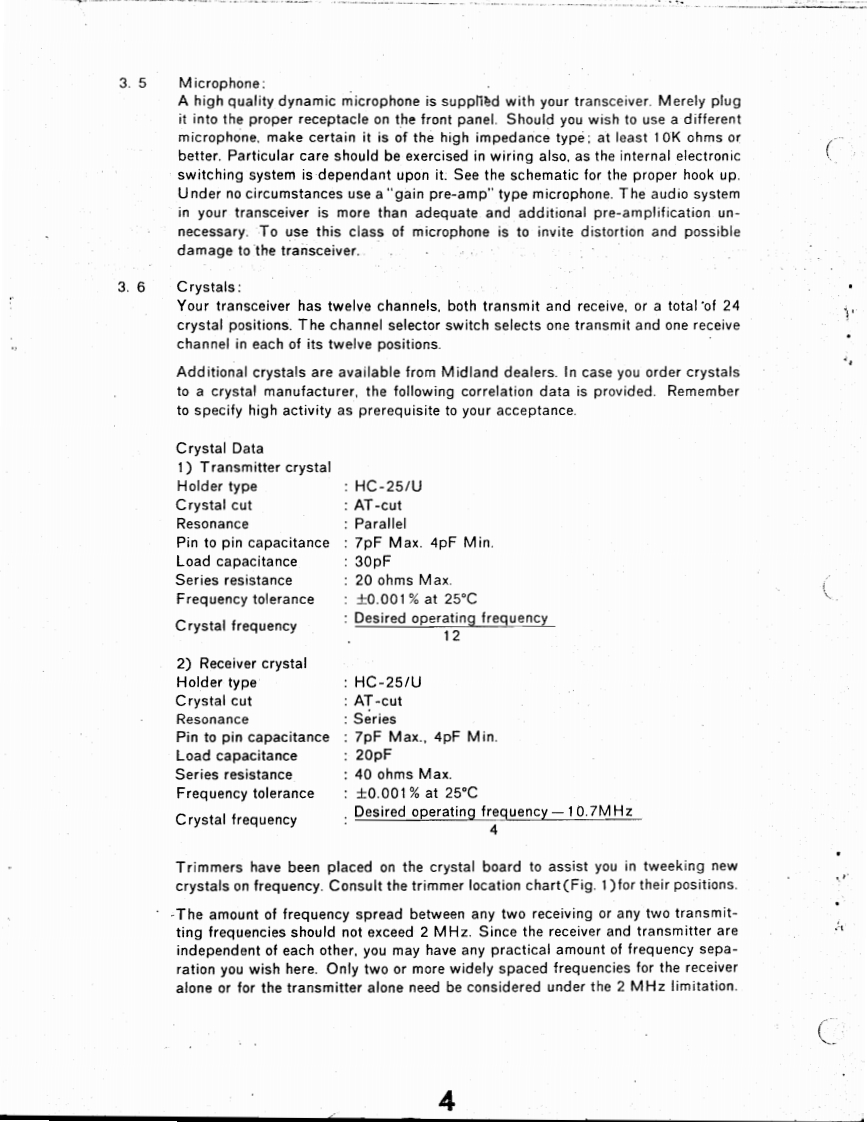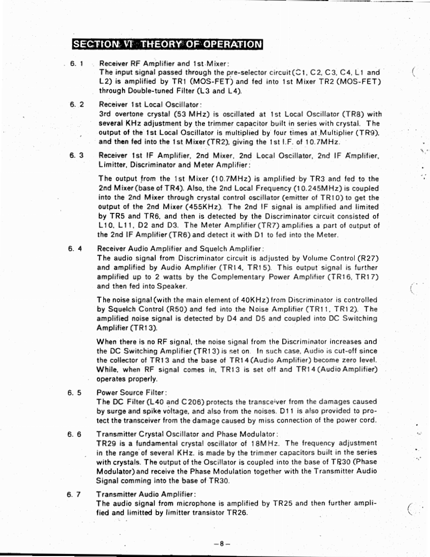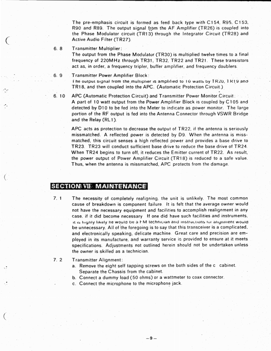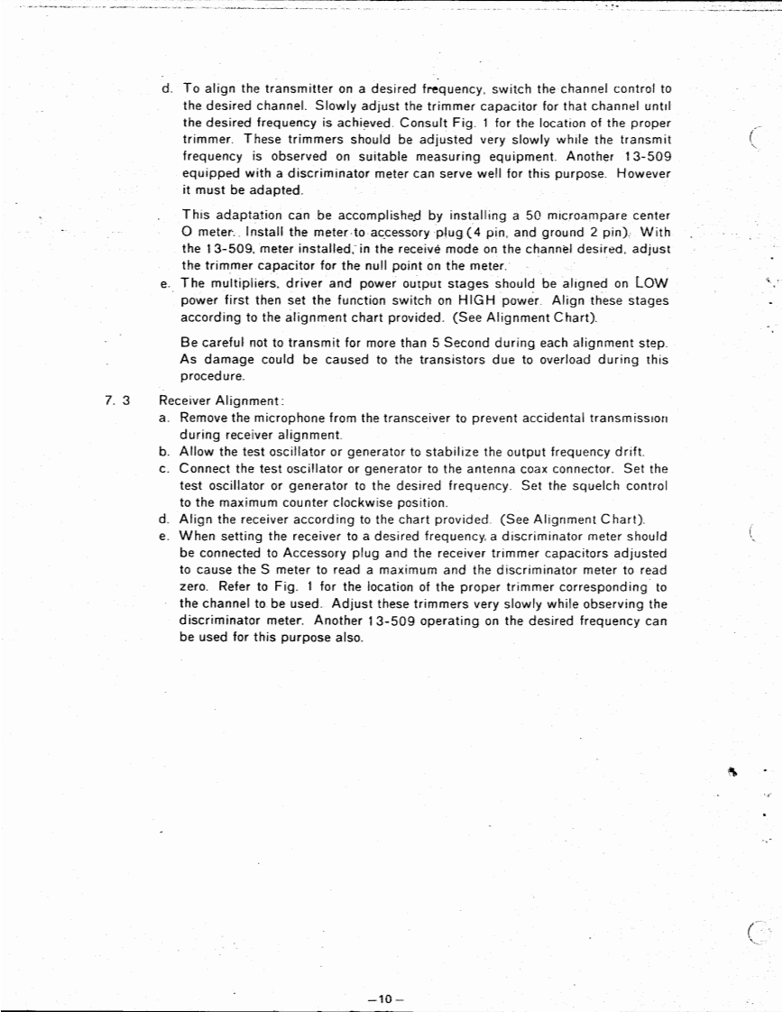 MANUAL PRICE 2.00图D是N13-509三L三○TRONICSCOMPANYVHF-FM 15 WATT 220 MHzMOBILE TRANSCEIVERMANUAL NO.13-220084DATE:JAN.5,1974PLEASE NOTE:THIS WAS SCANNED FROM A FADED XEROX COPY OF THE ORIGINALSPECIFICATIONS220.00o225.00MHFET小小444时(Dipdes302112Modulation Tyoe15P3Power VoitageDC 13.8V 15%negstive groundCurrent DrainTransmit.HI (IOW]average31ALOW (1W)average1.1aReceive.squelched220mAAnt体nna inp50h52.1f4(H2.6-330w)·B-7r9D)4-1/215saw0gm…10WLOWvo"8k。s -Dynamic mcrophone with push button swchRECEIVER:Recepton Freguencis12 channels for 223 MHz bandBui-in crystal units lor 1 channelsReceo!on SystemDouble SuperheterodyneIntermediate FrequenciesIst LF.F07M州22nd I F.455 KHz.Sensitivitya.Better than 0 5V 20 dB quetisgb.S+Audio outout poAudip oulaut impedanceFrequenty controlCrrstal (53 MHa)multphied 4ACCESSOHIESMahe sure the foewing accessories for the model 13-503CI】Microphone(namic type】(2)Microphone hanger1(8)Warranty cand(3)5 pare lu34(3A)2C9)Enternal5B◆ake向ug(4)Mounting bracket.1(10)4 peang plug for Toae Boest Geperatar(5)Gimp nuts......and Diseriminator Mater(Channel Ireguency rD card............AIDLANDELECTRONICB COMPANYP.0.Bo×19032◆Kan5a5City.M15s0ur164141Phone B16-474-5080Cable MIDELECTe1ex.42.6344