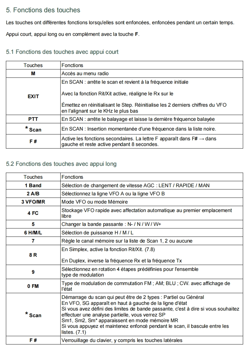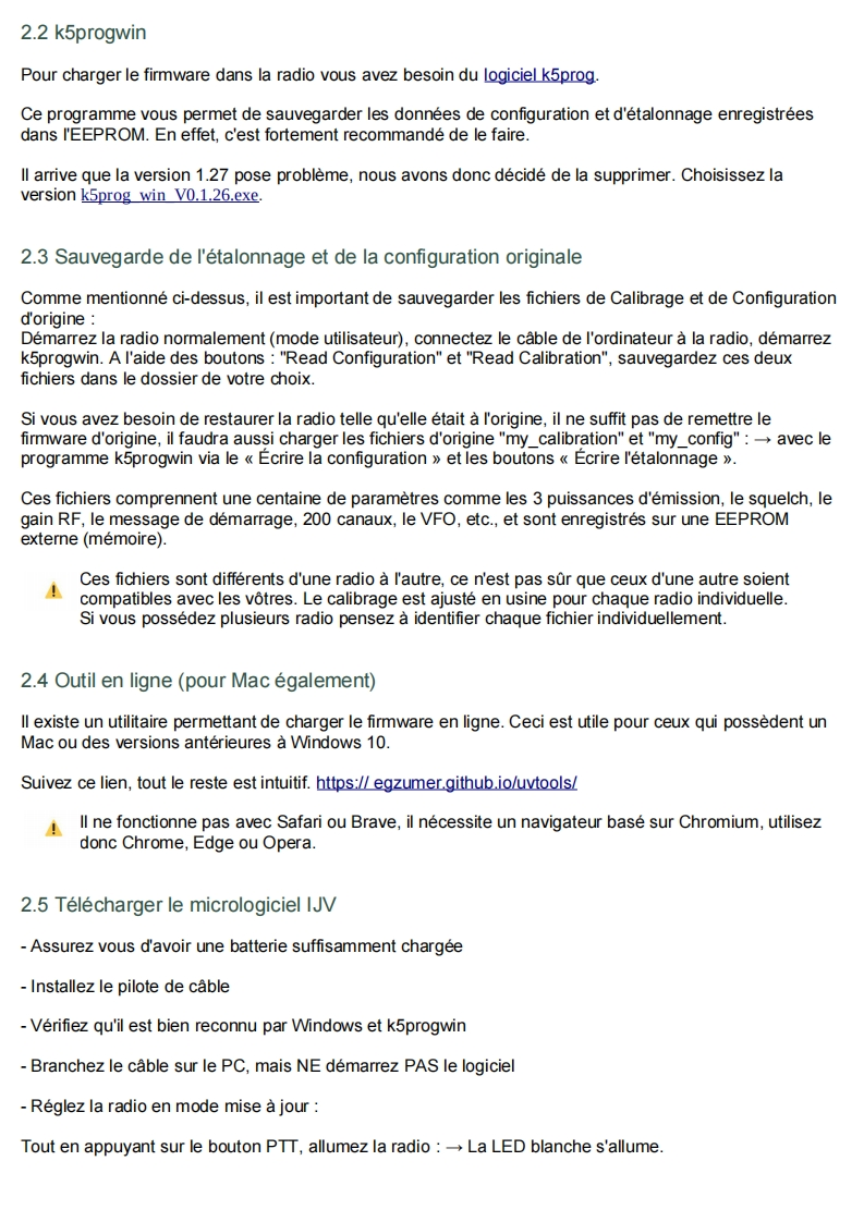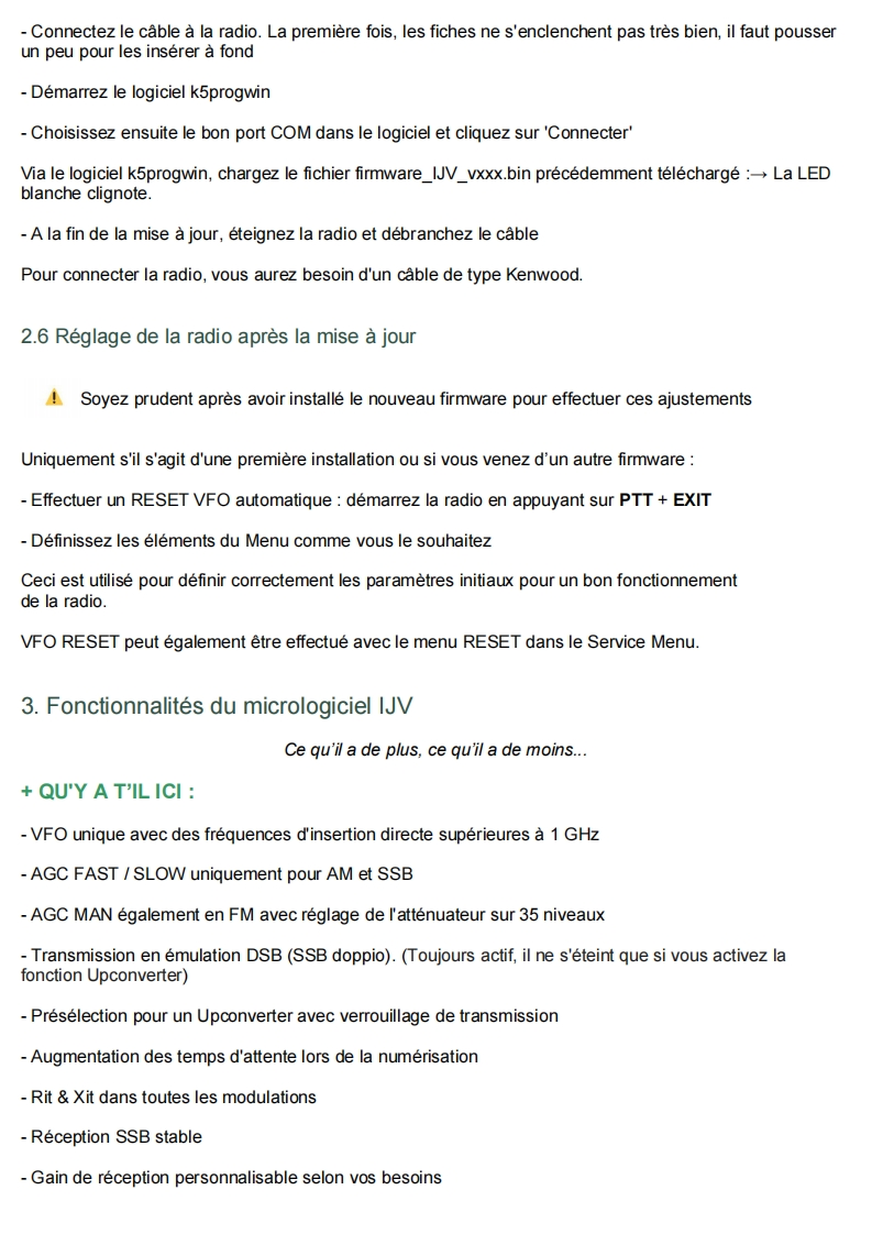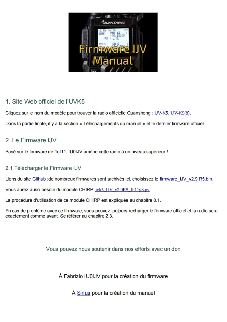 Quansheng UVK5-Manuel du Firmware IJVDerniere mise a jour V 2.9R5 01/02/24Les radios Quansheng UV-K5,UV-K5(8)=UV-K6,et UV-5R Plus ont la possibilite d'etre mises a niveauavec un Firmware non officiel.Par consequent,je decline toute responsabilite en cas de transmission en dehors des bandes autoriseespar le fabricant.Ce que vous faites avec votre radio depend de vous a vos propres risques.Ces mises a jour sont importantes au point qu'il a fallu reecrire le manuel,car le menu et les fonctions sontdifferents.Veuillez noter que I'utilisation de cette radio necessite une licence radio HAM.SOMMAIRE:1.Site Web officiel2.Firmware IJV3.Fonctionnalites4.Affichage5.Fonctions des touches6.Menus7.Operations communes8.Connectez-vous