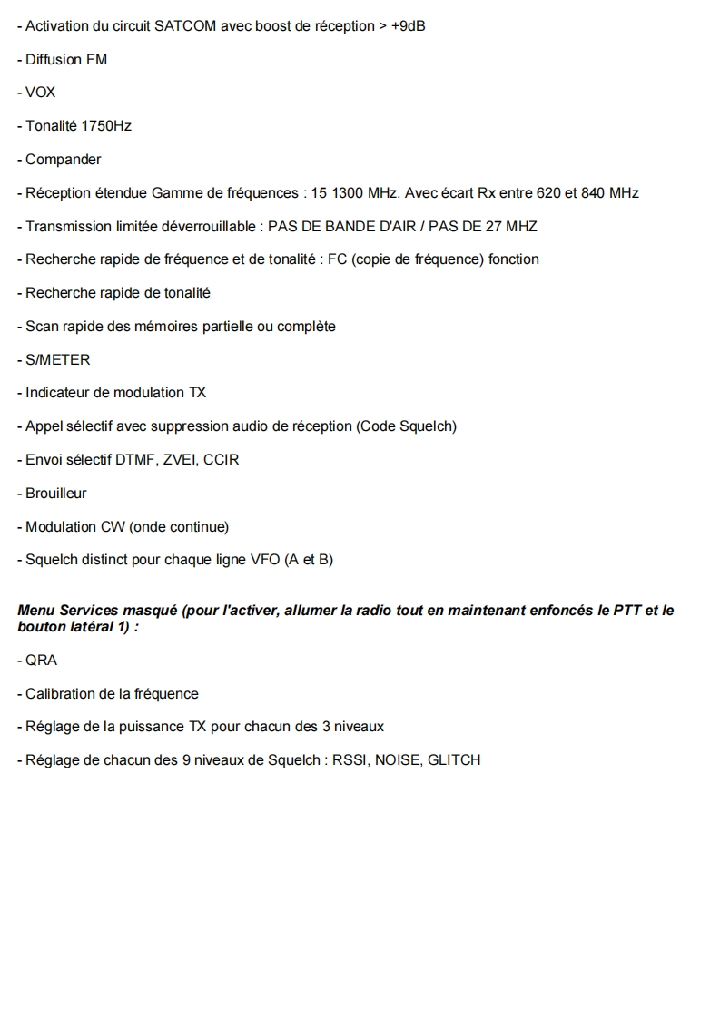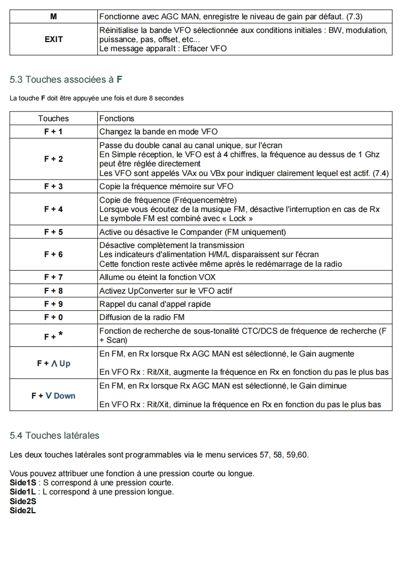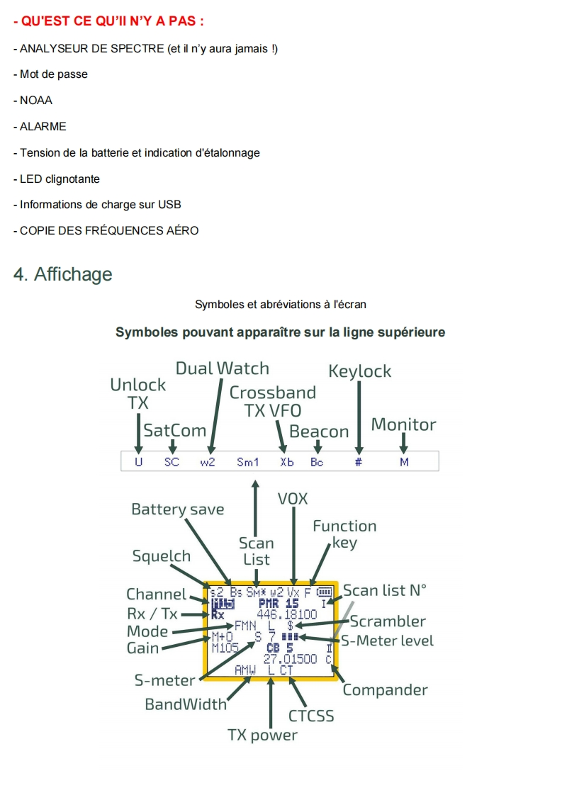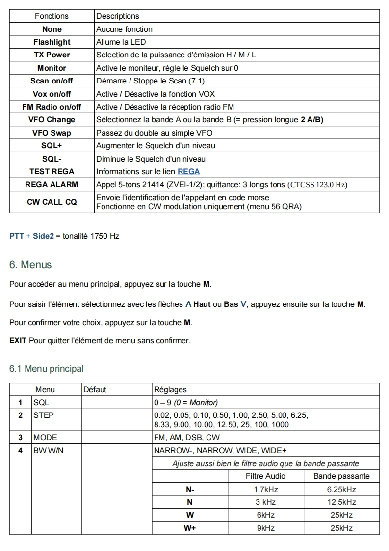 Quansheng UVK5-Manuel du Firmware IJVDerniere mise a jour V 2.9R5 01/02/24Les radios Quansheng UV-K5,UV-K5(8)=UV-K6,et UV-5R Plus ont la possibilite d'etre mises a niveauavec un Firmware non officiel.Par consequent,je decline toute responsabilite en cas de transmission en dehors des bandes autoriseespar le fabricant.Ce que vous faites avec votre radio depend de vous a vos propres risques.Ces mises a jour sont importantes au point qu'il a fallu reecrire le manuel,car le menu et les fonctions sontdifferents.Veuillez noter que I'utilisation de cette radio necessite une licence radio HAM.SOMMAIRE:1.Site Web officiel2.Firmware IJV3.Fonctionnalites4.Affichage5.Fonctions des touches6.Menus7.Operations communes8.Connectez-vous