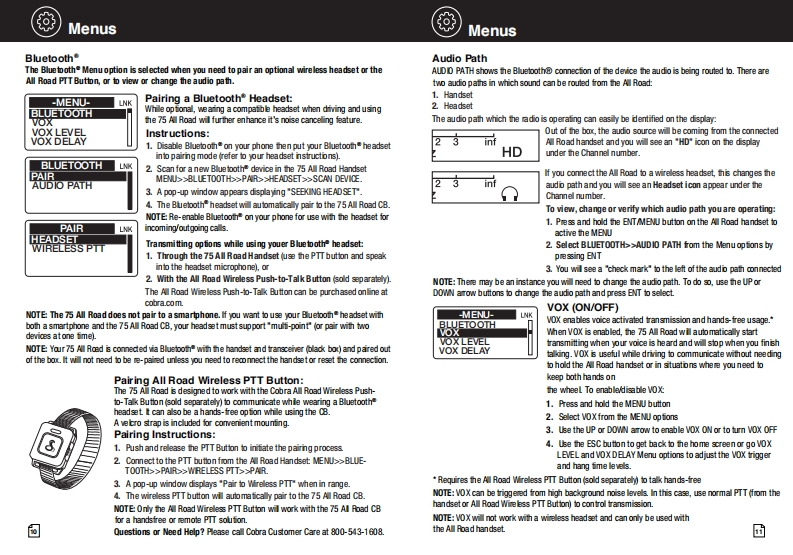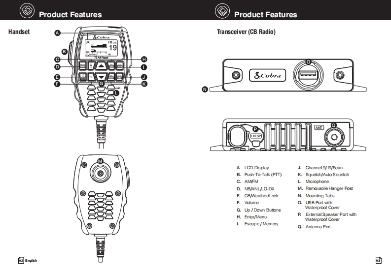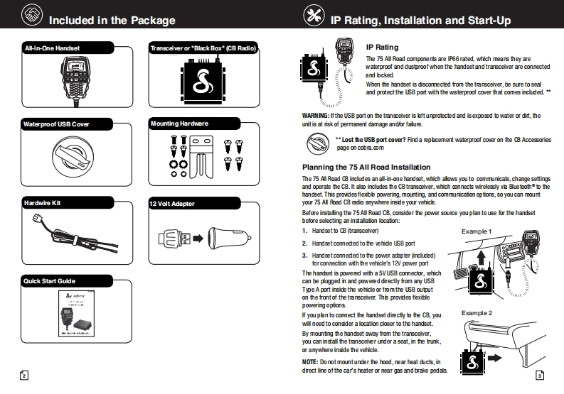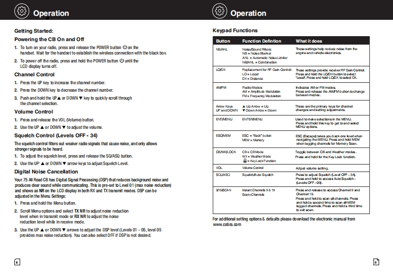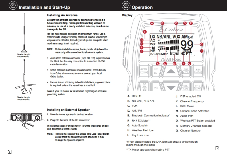 SCobraSCobra°Our Thanks,The CB Story,and Customer Assistance75 All Road8g28a50va88Wireless Recreational CB Radiorelable servicewith Digital Noise CancellationCitzens Band Radio Historymenfed by Al06sh19线e图金oridnally servd雀odofcoutonforoo8孟aa2rae19达mt tednology adanoed and heC8雀rlet caudt on s鱼w国dcu雀nn性b鲜ort pdice sped04dod达The Band Pado Savice coiss of 40 dhunndfrencics hat are moty 10kH apurtTrarartter porer&limi td to4 ats in heu线ard range can崎depending on the tarrain an国19quy of he product0 menty the Ci6 Band sroe在str4eak坐rc年dnfg适do%slong is the rks of operalon estallished by he Fedkesl Cormunic tion Commision (FCC anePesson For FOC Pan 65 Rule Changesintertreree,uhich improves he sdard of tuo-y sdios andis a berefit to the custorerth山e FM ano年4atao-ydo坐.Tdus鱼0 bra Blcror雀s4ia6 mprave the9ydeC色国9l鱼运scan enoy he bonefis0C8itu童nin鱼球dtds@Customer Assistancetdg销suu以ea色deor go to ws.cxbra.com.Owners Manual回h