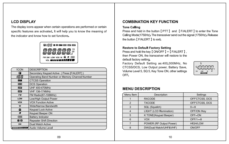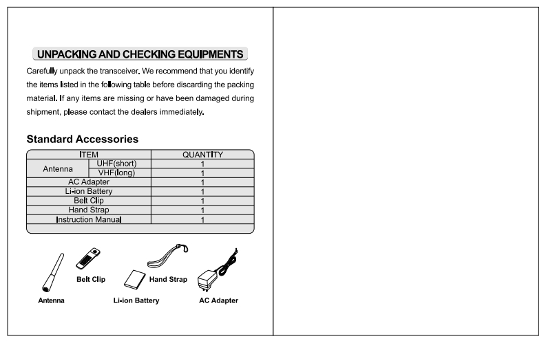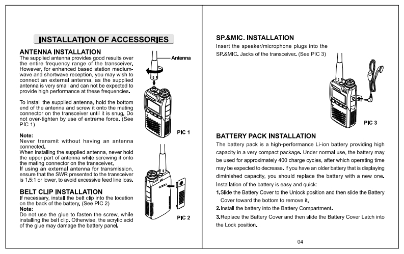 GENERAL DESCRIPTIONThe transceiver is a micro-miniature multibandFM transceiver with extensive receive frequencycoverage,providing local-area two-wayamateur communications along with unmatchedmonitoring capability.We appreciate your purchase of our transceiver,and encourage you to read this manualthoroughly,and learn about many excitingfeatures.