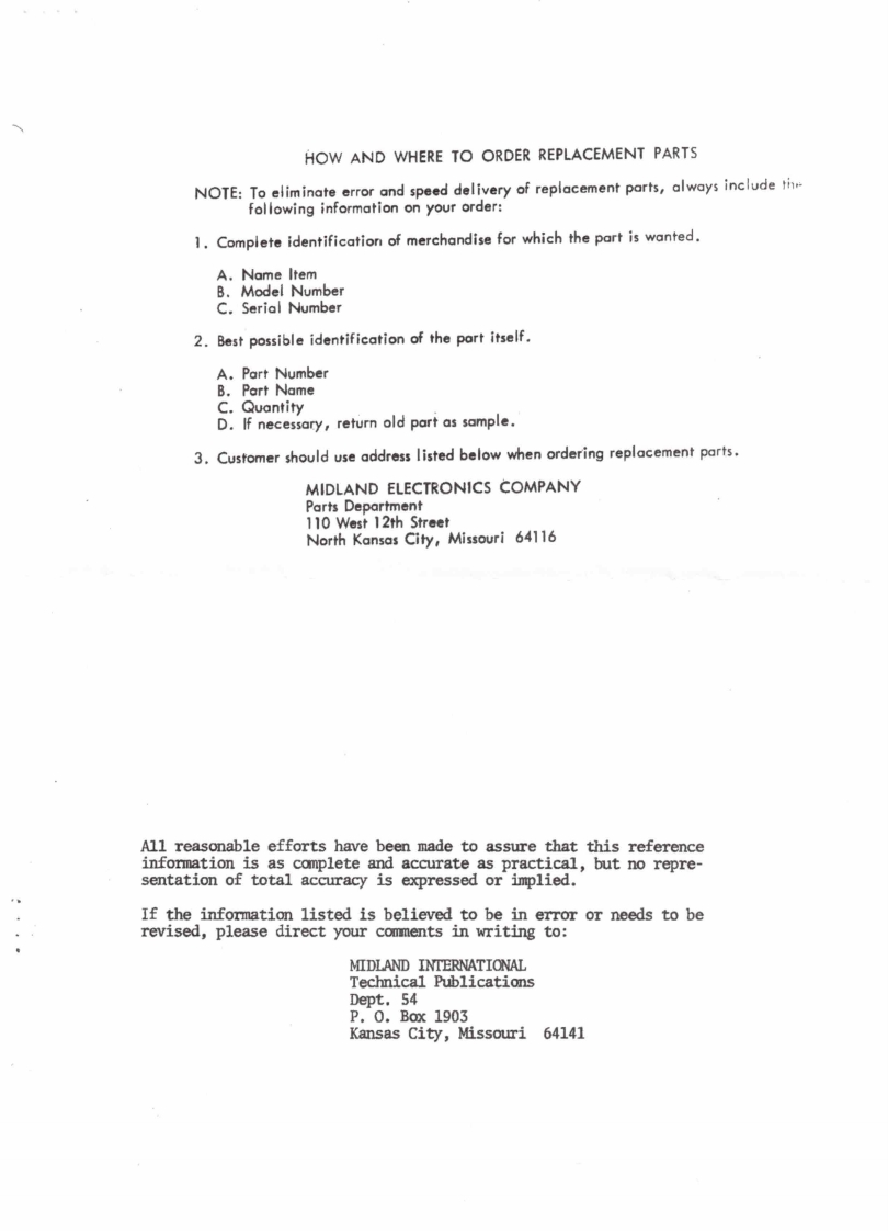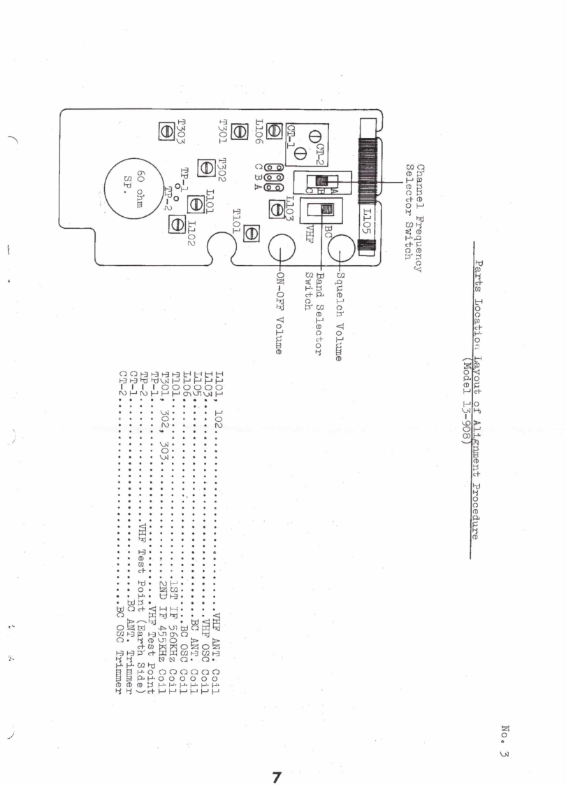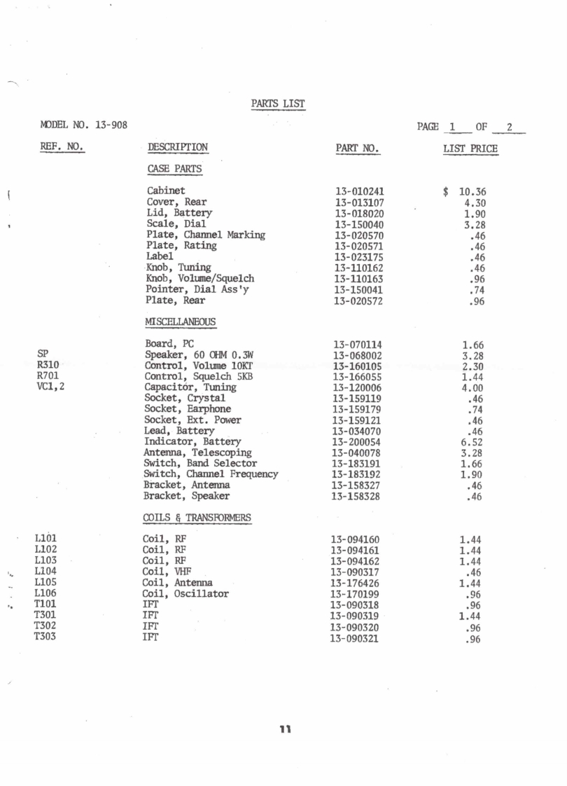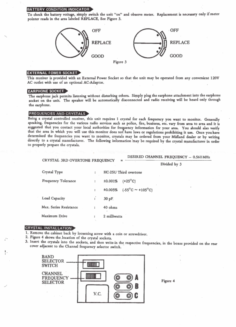 13-908AIDLANDHighVHFBandELECTRONICS COMPANYFM MONITOR RECEIVERWith A M RadioMANUAL NO.13-220101DATE:AUGUST 1,1974MANUAL PRICE $2.00SPECIFICATIONSSTANDARD BROADCAST AM RECEIVERTuning range:AM broadcast band 530-1605KHzIntermediate frequency:455KHzMaximum audio power output:260mW at 400HzAudio power output for 10%distortion:150mW at 400HzDistortion at 50mW output:5%at 400HzIF rejection:28 db at 600KHzImage rejection:30 db at 1400KHzBattery drain:9mA at no signalOscillator drops out at:5 voltsVHF RECEIVERSensitivity for 50mW output:12μVOscillator drops out at:5 voltsBattery.drain:15mA at no signalAntenna length extended:25 inches overallEarphone socket:Battery type:NEDA 1604 9 voltsSpeaker size:2%"Case size:6"(high)x2-5/8"(wide)x1"(deep)Crystal Data:Crystal Freq._Desired channel freq.-0.560MHzDivided by 3Crystal holder:HC-25UMAIDLANDELECTRONICB COMPANYPO Box 19032.Kansas City Missoun 64141