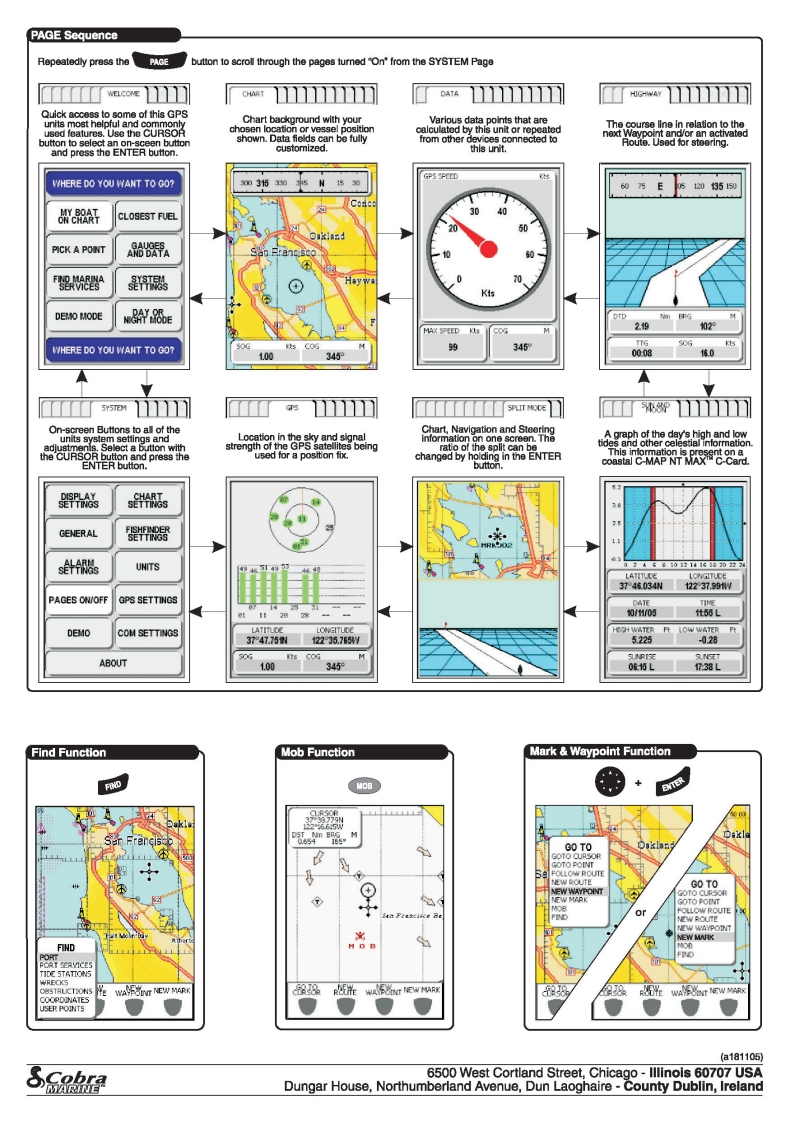 SCobraMC 600Ci MC 600CxMARINEwww.cobra.comQUIC K RE FER E N CE GUIDEButtons Functlons(-)Zoom OUT-Change the scale to showImmediately search for Ports,Port Services,ZOOHess details of a larger area.Tide Stations,Wrecks,Obstructions,Etc.(+)Zoom IN-Change the scale to showmore details of a smaller area.PAGECycle through the available pages insequence.CURSOR BUTTONMoves the Pointer on the Chart screen andExits from Menus and acts as a Back buttonvery quickly pans/slides the charts location.ESCAlso,scrolls the selected option in the menuContinuously pressing will show the boat onthe chart.page(s).Switches power ON or OFF.A quick pressW佩Displays a Menu of available options fromallows adjusting of backlighting and othersettings.each of the pages.M08Activates the MOB (Man OverBoard)Selects the highlighted menu option or otherposition in emergency situations.item on the screen.Software Buttons have different functionsaccording to the modes of operation.TheirSelects the Goto function.labels for the current function are shown onthe screen right above the buttons.Start-Up SequencePower OFF FunctlonPWRENTERPress and hold the GR buttonSCobraWARNINGWHERE DO YOU WANT TO GO?30315305N530MARINECLOSEST FUELe to be acourate.xAether verified norPOWYERING DOWN INPICK A POINTAD DATA2 Secondsbe reled upon as aout rather a backup to是思TDEM1O MODEu688EThe navipator shal..4WHERE DO YOU WANT TO GO?100345SImulatlon FunctlonBacklight Contrast FunctionQuick press the FuR button0SETTRes0SETTNeS303530N50GENERALSETTHOSGENERAL圈ands微UNITS针UNITS+PAGES ON/OFFPALETTE SUNLIGHTGPS SETTINGSCUSTOM DEMOTINGS45ERIGHTNESSCONTRAST0006tDEMOCOM SETTINGSTINGSCURSOR CONTROLPOWER TO CHANGE PALETTEBRIGHT-BRIGHT+CONTR-CONTR+ABOUTCUSTOM DEMO