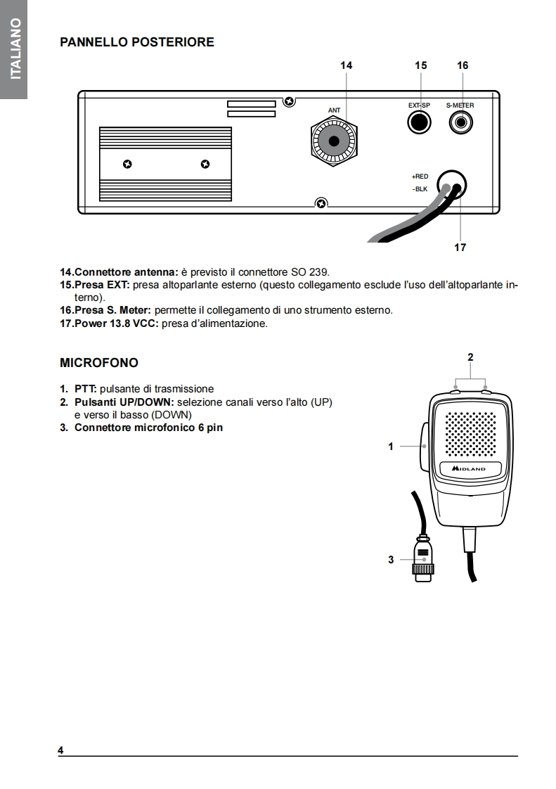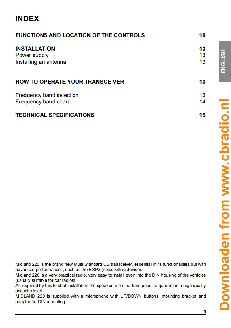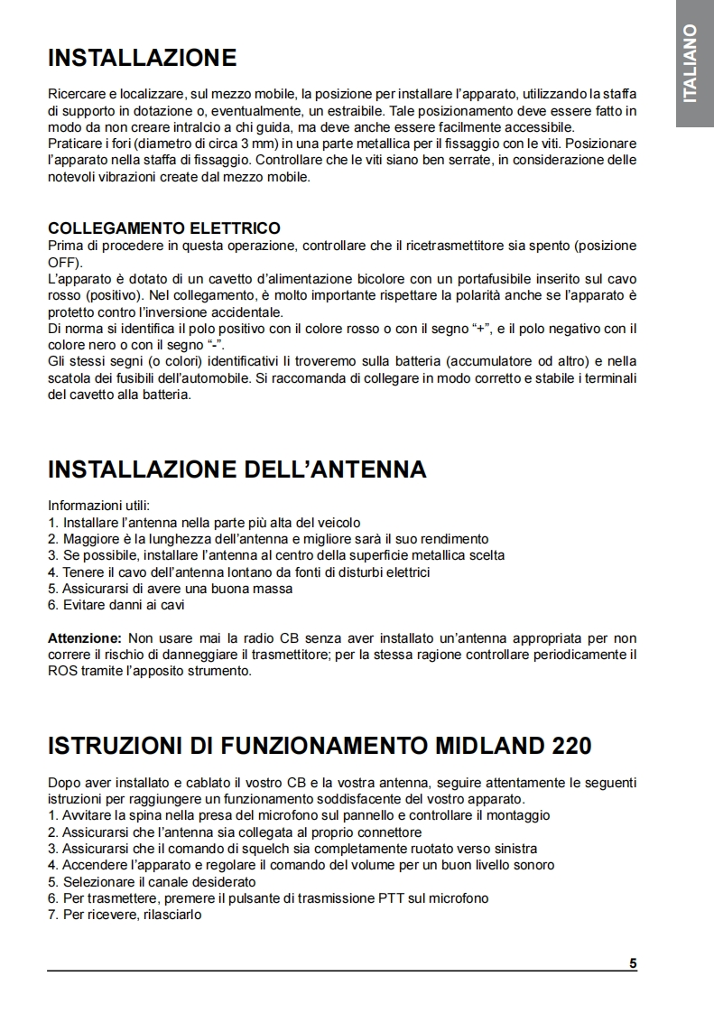 INDICEDESCRIZIONE COMANDI2INSTALLAZIONE5Collegamento elettricoISTRUZIONI DI FUNZIONAMENTO MIDLAND 2205SELEZIONE BANDE DI FREQUENZA6Tabella bande di frequenzaCARATTERISTICHE TECNICHE7Midland 220 e un nuovo CB mobile Multi Standard,essenziale nelle sue funzionalita ma nellostesso tempo con caratteristiche tecniche all'avanguardia,come il filtro per la soppressione delrumore ESP2】Grazie al Midland 220 ora e possibile soddisfare le richieste di un apparato da installare in modosemplice e "pulito"negli alloggiamenti DIN gia presenti sui veicoli (tipicamente dedicati alleautoradio).Come richiesto da questa modalita di installazione l'altoparlante e posizionato sul frontale del CBper garantire una resa acustica ottimale.Nella confezione e fornito il microfono con pulsanti up/down e sia la staffa per il fissaggio orizzontalesia I'adattatore per I'alloggiamento DIN