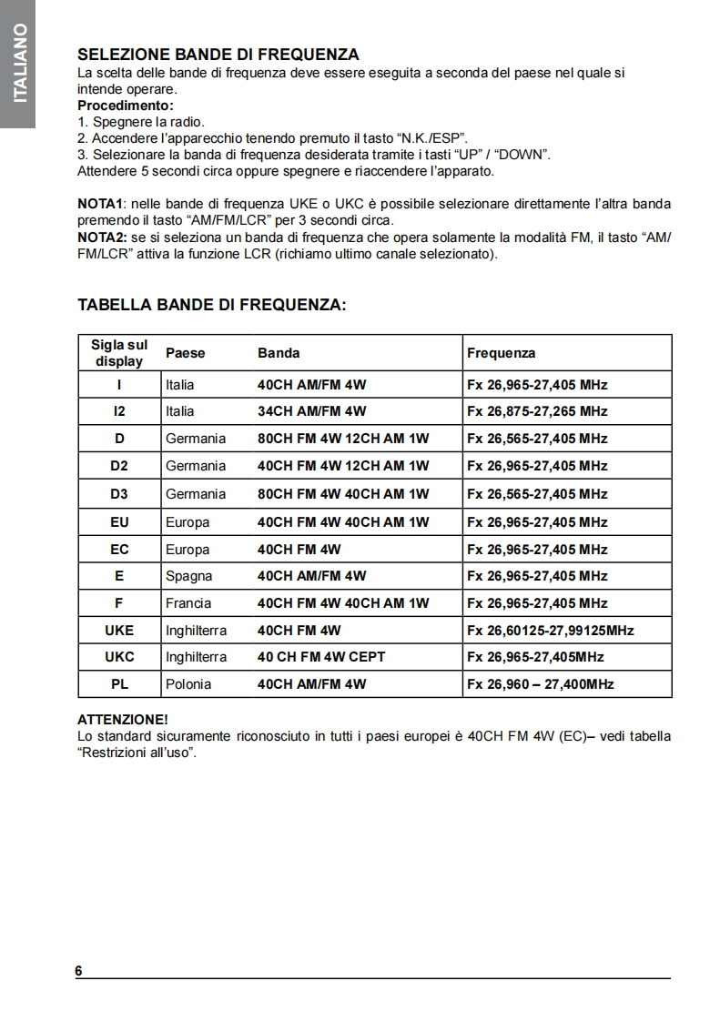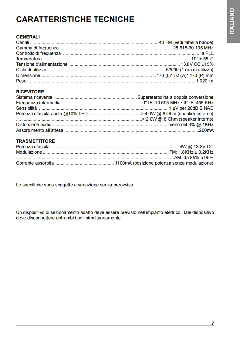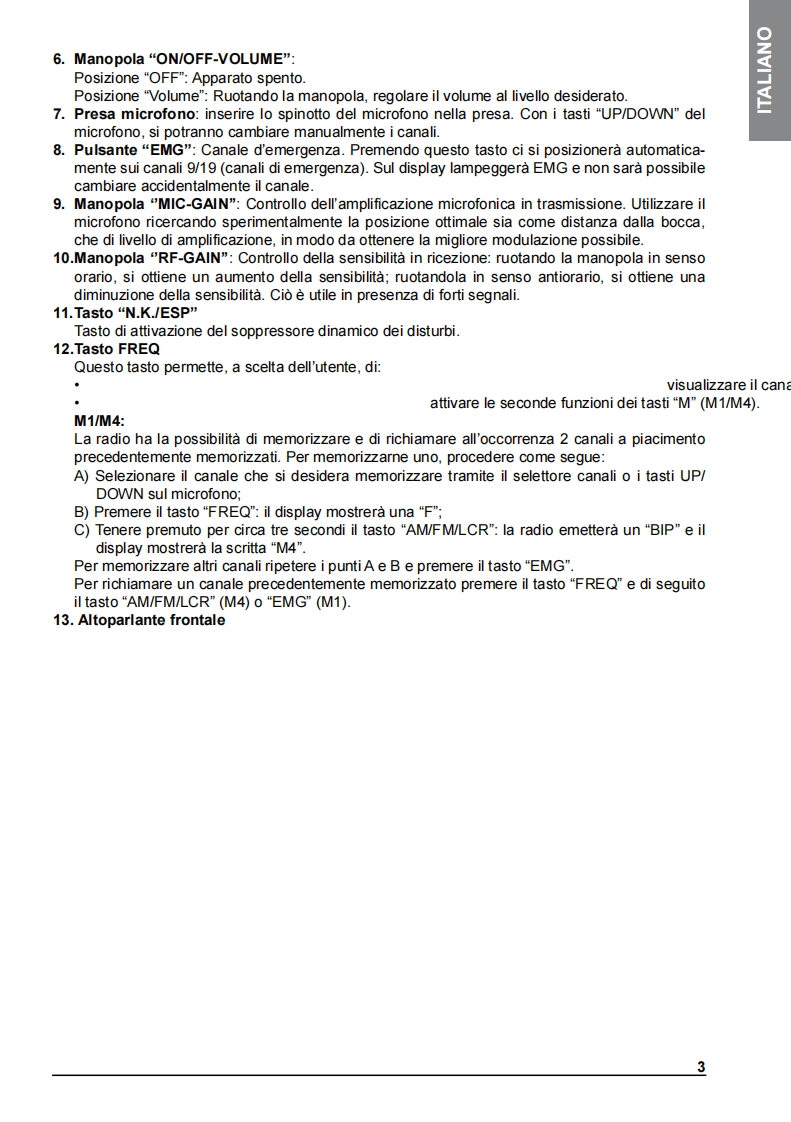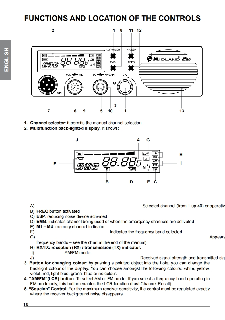 INDICEDESCRIZIONE COMANDI2INSTALLAZIONE5Collegamento elettricoISTRUZIONI DI FUNZIONAMENTO MIDLAND 2205SELEZIONE BANDE DI FREQUENZA6Tabella bande di frequenzaCARATTERISTICHE TECNICHE7Midland 220 e un nuovo CB mobile Multi Standard,essenziale nelle sue funzionalita ma nellostesso tempo con caratteristiche tecniche all'avanguardia,come il filtro per la soppressione delrumore ESP2】Grazie al Midland 220 ora e possibile soddisfare le richieste di un apparato da installare in modosemplice e "pulito"negli alloggiamenti DIN gia presenti sui veicoli (tipicamente dedicati alleautoradio).Come richiesto da questa modalita di installazione l'altoparlante e posizionato sul frontale del CBper garantire una resa acustica ottimale.Nella confezione e fornito il microfono con pulsanti up/down e sia la staffa per il fissaggio orizzontalesia I'adattatore per I'alloggiamento DIN