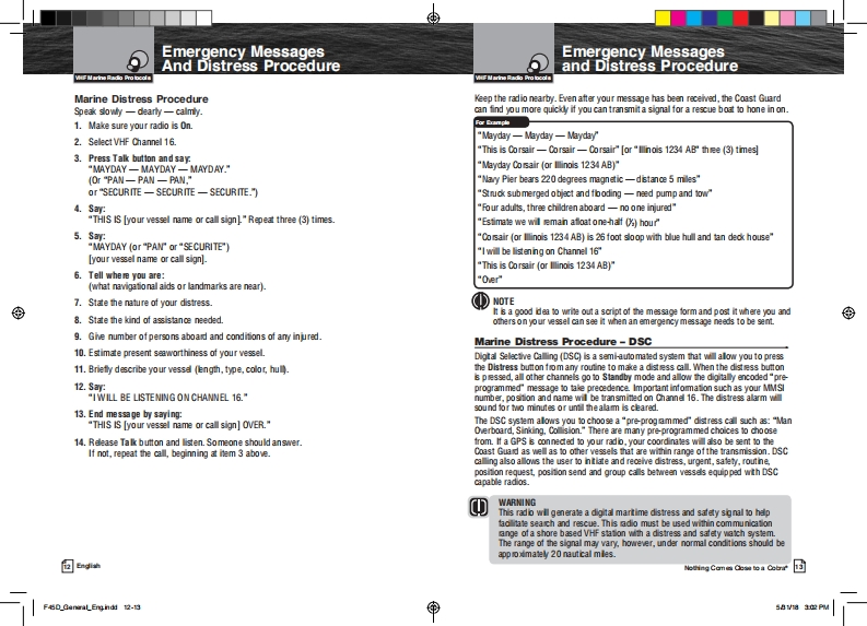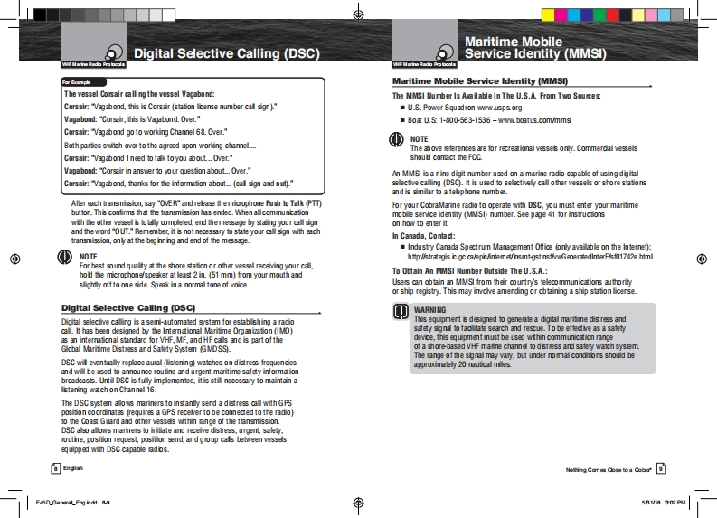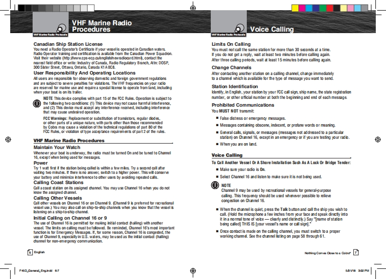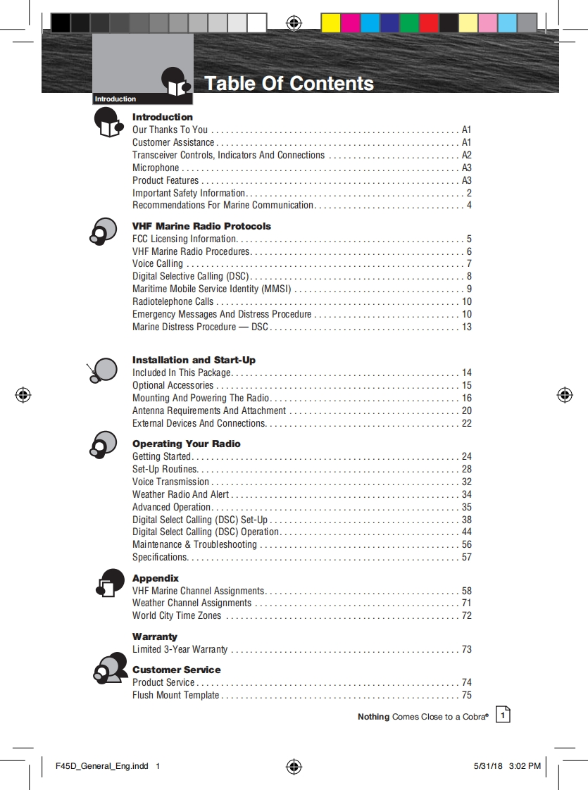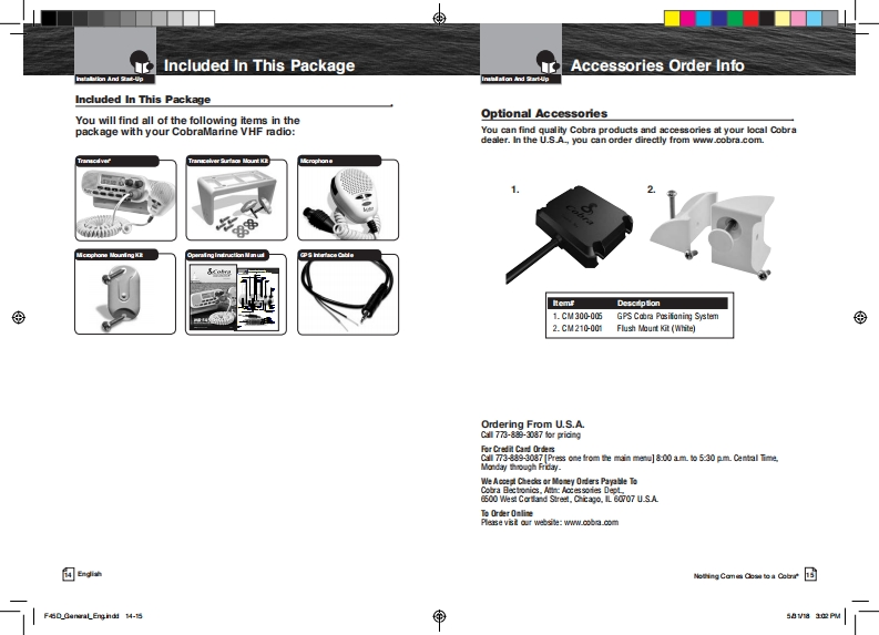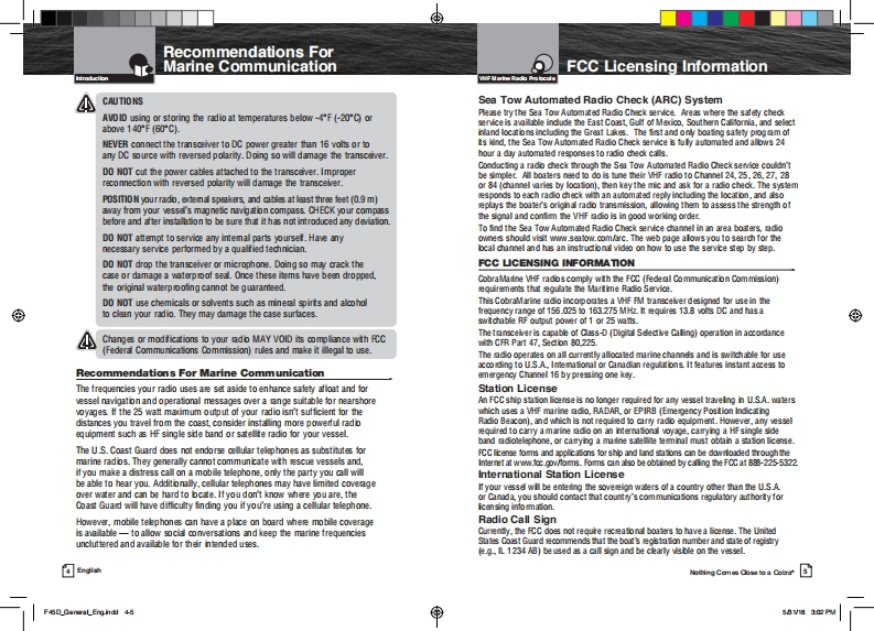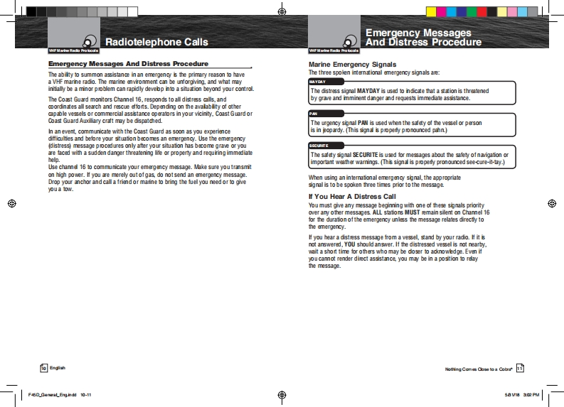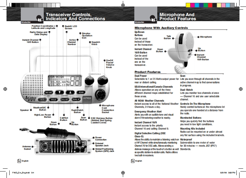 Our Thanks To YouSCobraThank you for purchasing a CobraMarine VHF radio.Properly used,this Cobra product will give youMARINEmany years of reliable service.How Your CobraMarine VHF Radio Works0wner's ManualThis radio is a VHF transcaver for fbed mouming on your boat It gives you 2-wayvessel-to-vessel and vesse-to-shore station communications,primarily for satety andsecondarily for navigation and operational purposes.With it,you can cal for help,getinformation from other boaters,tak to bck or bridge tenders and male radioteephonecallis to anywhere in the word trough a marine operato.Besides 2-way communicatios,in the USA this rado can provide quickaccess to receive seven NOAA (Natonal Oceanographic and Atmospheric Administration)and two Canadian weather channels for aerting you to weather emergendes wit a toneon a weater channd you can select for your area.SAHICHCustomer Assistance。Shouid you encoumter any problems wit this product,ornot understand®ts mary features,please reter to this owner's manual.If you require turther assistanceafter reading this manual Cobra Bectronics offers the tollowingoustomer assistance services:For Assistance in the U.S.A.Au tomated Help Desk Engish ony.24 tous a day.7 das a week 773-889-3087 (ptong.Customer Assistance Operators English and Spanish.B:00 am.to 5.30 pum.Central Time Mon.through Frl.(except holidays)773-889-30870m4Questions Erolshand Spanish.Faxes can be recelved 773-622-2269Technical Assistance Endish only.www.cobracom/supportags/marine-radiosMR F45-DFor Assistance Outside The U.S.A.Contact Your Local Cobra DealerClass-D Fixed Mount VHF RadiNtih的Les×oa Cobr3'E欧团hF60LCwn4n出12