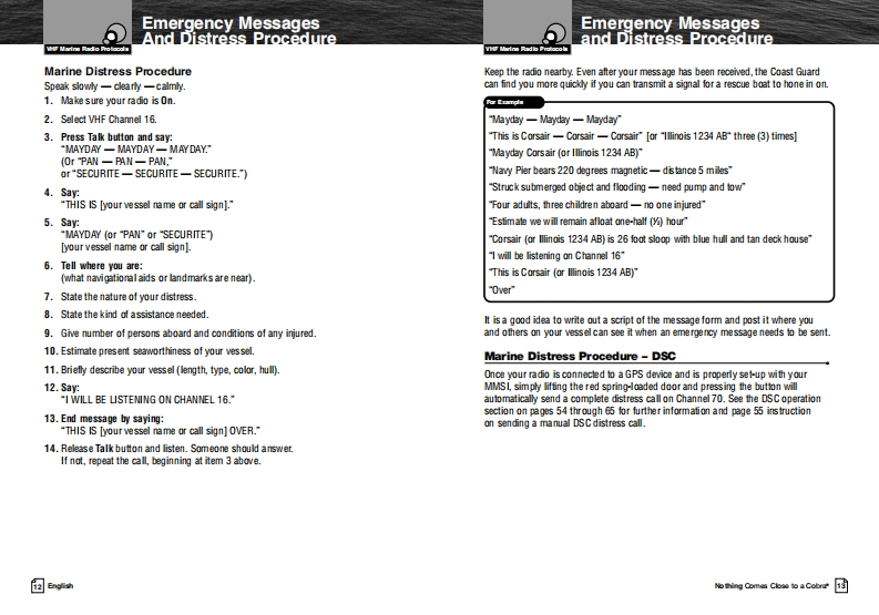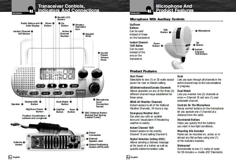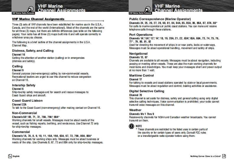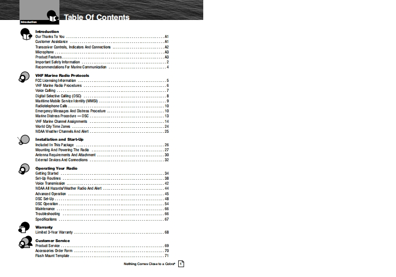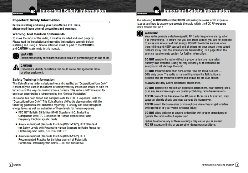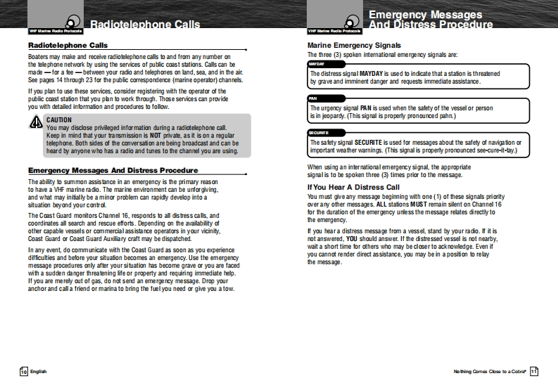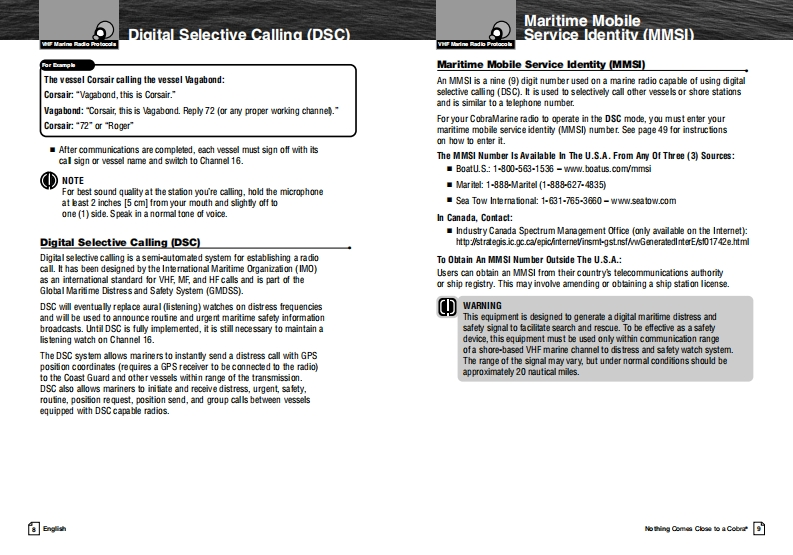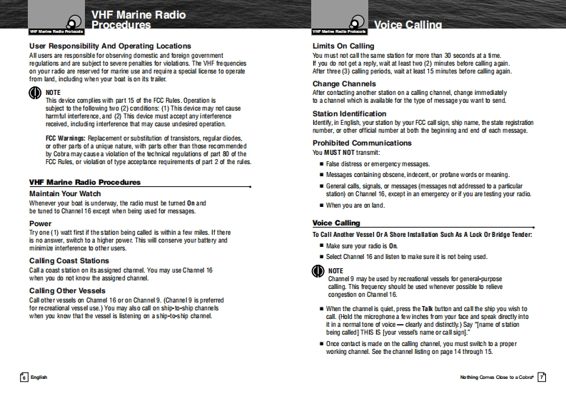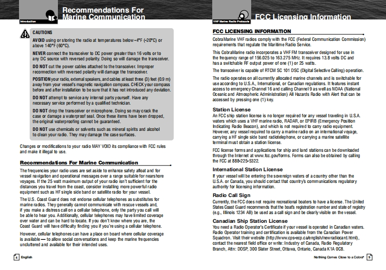 SCobraOur Thanks To YouThank you for purchasing a CobraMarine VHF radio.MARINEProperly used,this Cobra product will give youmany years of reliable service.How Your CobraMarine VHF Radio WorksThis radio is a VHF transceiver for foxed mounting on your boat.It gives you 2-wayvessel-to-essel and vessel-to-shore station communications,primarily for safe tyOwner's Manualand secondarily for navigation and ope rational purposes.With it,you can call forhelp,get information from other boaters,talk to lock or bridge tenders and makeradiotelephone calls to anywhere in the world through a marine ope rator.Besides 2-way communications,in the U.SA.,the radio can provide quickaooess to receive seven NOAA (National Oceanographic and AtmosphericAdministrafion)and two Canadian weather channels for alerfing you to weatheremergencies with a tone on a weather channel you can select for your area.Customer AssistanceCobrShould you encounter any problems with this product,or not understandits many features,please refer to this owner's manual.If you require furtherassistance after reading this manual,Cobra Blectronics offers the followingcu5加m3r25sis电ne3sri085For Assistance In The U.S.A.Automated Help Desk English only.24 hours a day,7 days a week 773-889-3087 (phone).Customer Assistance Operators English and Spanish.8:00 a.m.to 6:00 p.m.Central Time Mon.through Fri.(except holidays)773-g89-3087(h0n3).Questions Eng ish and Spanish.Faxes can be received at 773-622-2269 (fax).Technical Assistance English onl.www.cobra.com (on-line:Frequently Asked Questions).VHF MARINE RADIOEnglish and Spanish.productinfocobra.com (e-mail).MR F45For Assistance Outside The U.S.A.Contact Your Local Dealer00060边a口emlaCarportan6500 Wast Corfand StmetChi ago,IInols 60707 USANothing Comes Close to a CobraEnglsh因gh