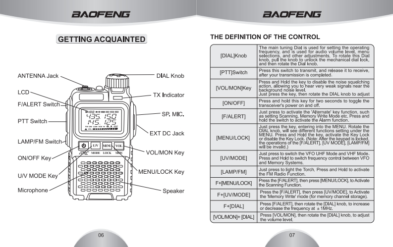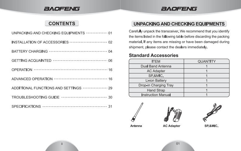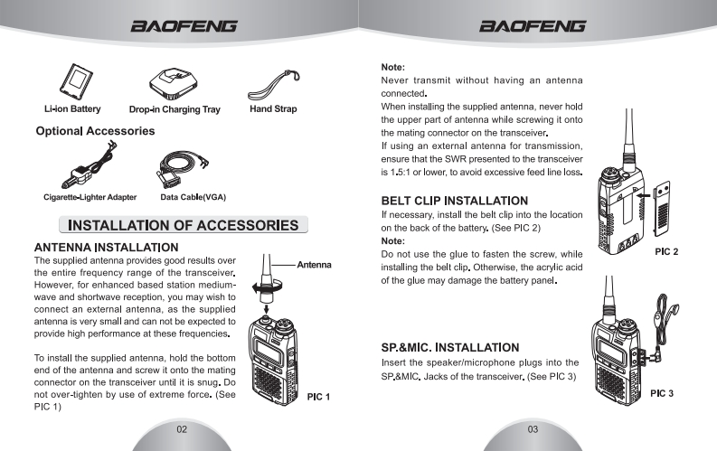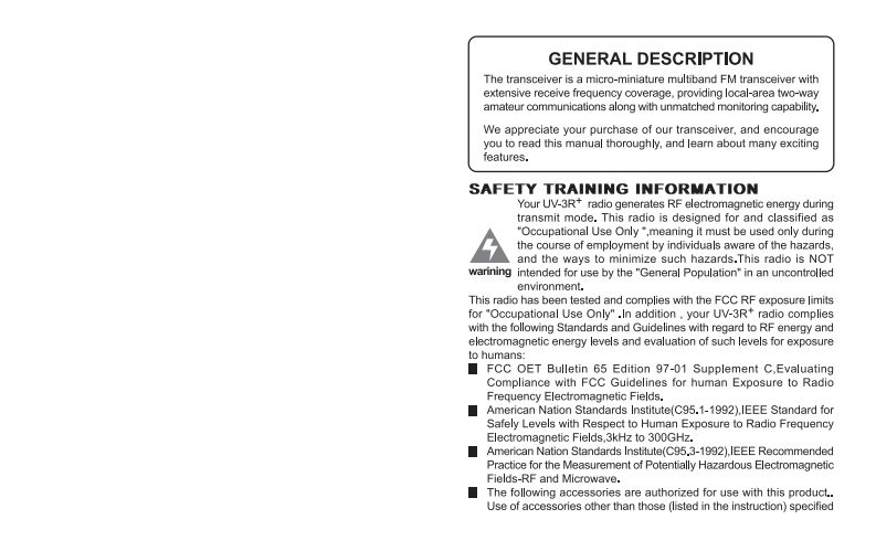=A■=三ΛGPORTABLE TWO-WAY RADIOVHFIUHFULTRA-COMPACT DUAL-BAND TRANSCEIVERWITH WIDE BAND COVERAGEHIGH ILLUMINATION FLASHLIGHTLCD Menu Operations·Dual Band/Dual Watch·Wide/Narrow Bandwidth·FM Radio Built-.in。Emergency Alarm。PC Programming·VOX。99 Channels·CTCSS/CDCSS。Battery Saver。FCCE0678①RoHSCMIIT ID:2010FP6535AAww.pwphoe.m.USER'S MANUAL