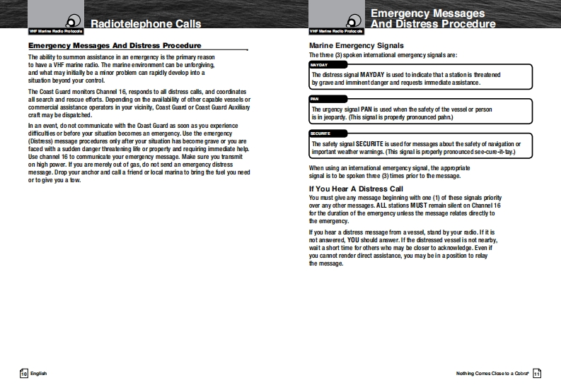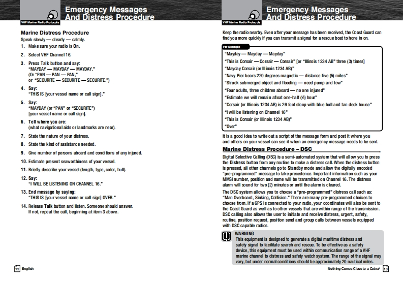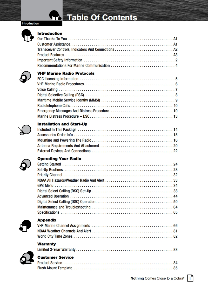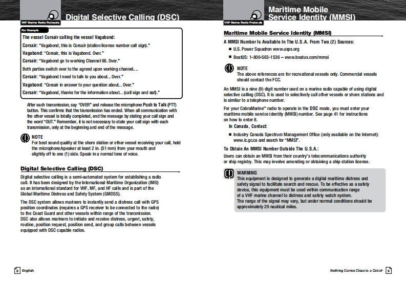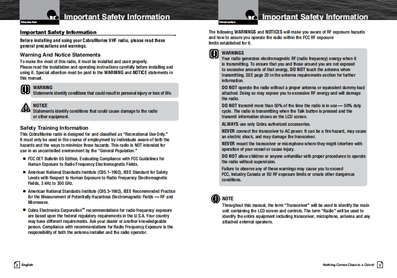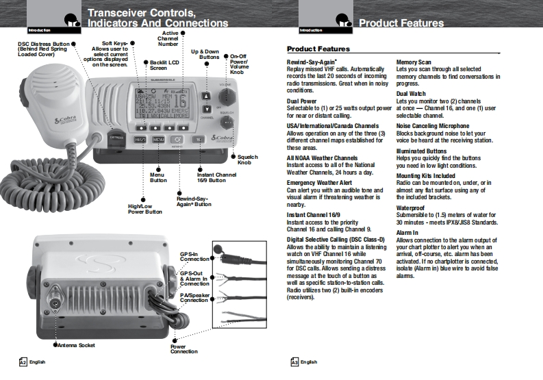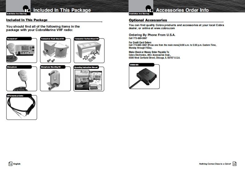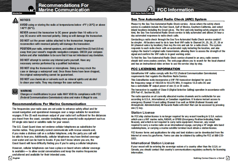 Our Thanks To You AndSCobraCustomer AssistanceMARINEThank you for purchasing a CobraMarine VHF radio.Properly used,this Cobra product will give youmany years of reliable service.Owner's ManualHow Your CobraMarine VHF Radio WorksThis radio is a VHF transceiver for fied mounfing on your boat It gives you 2-wayvessel-to-vessel and vessel-to-shore station communications,primarily for safety andsecondarily for navigation and operafional purposes.With it you can call for help,getinformation from other boaters,talk to lock or bridge tenders and make radiotelephonecalls to amywhere in the world through a marine operator.Besides 2-way communications,in the U.SA.,the radio can provide quickaccess to receive eight NOAA (Nationall Oceanographic and AtmosphericAdministrafion)and two Canadian weather channels for alerting you to weatheremergencies with a tone on a weather channel you can tune in for your area.Customer AssistanceShould you encounter any problems with this product,or not understand飞many features,pleas朗阳月r to this own阳r's manual.four阳quire furthassistance after reading this manual,Cobra Electronics offers the followingH/LOcustomer assistance services:For Assistance In The U.S.A.English only.automated.24 hours a day.7days a week 773-889-3087ng fish and Spansh800am.b30卫.mEas由mTim阳Mam.through Fn.(eceptholidays)773-889-3087(phone).English and Spanish.Faxes can be sent to 773-622-2269MRF范WEnglish only.www.cobra.com/supportEnglish and Spanish.produc finfoecobra.comMR F57BFor Assistance Outside The U.S.A.Contact your local authorized Cobra Blectronics DealerClass-D Fixed Mount VHF Radio6500 Weat Cortand StreatChea4■nau07aw5ANothing Comes Cose to a CobraEnglsh☒ghhwww.cobra.com