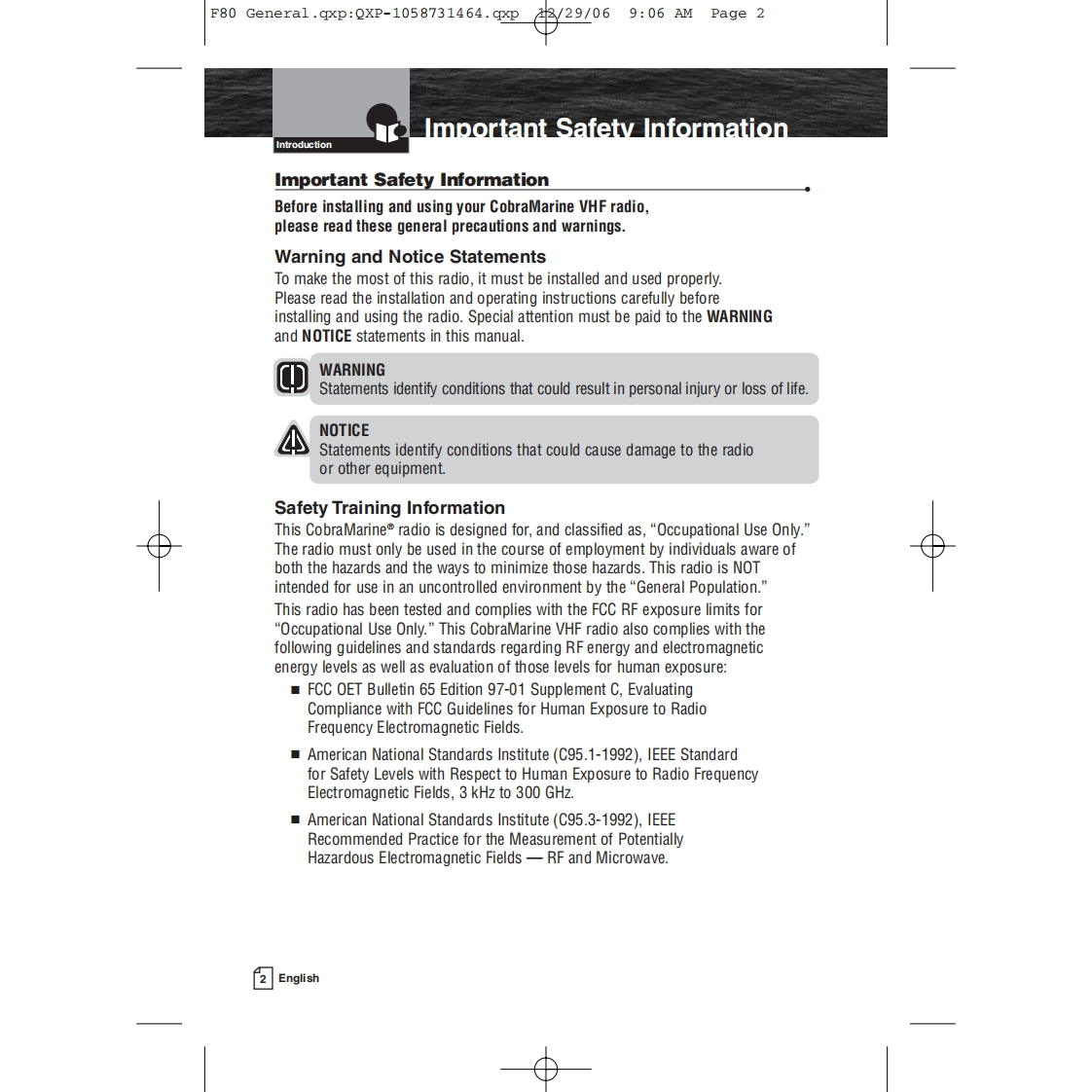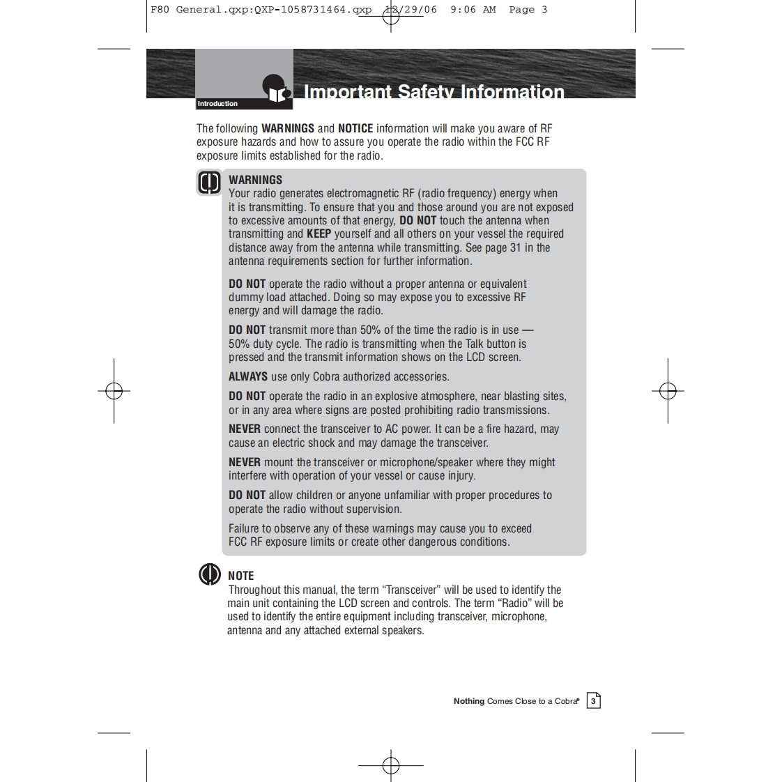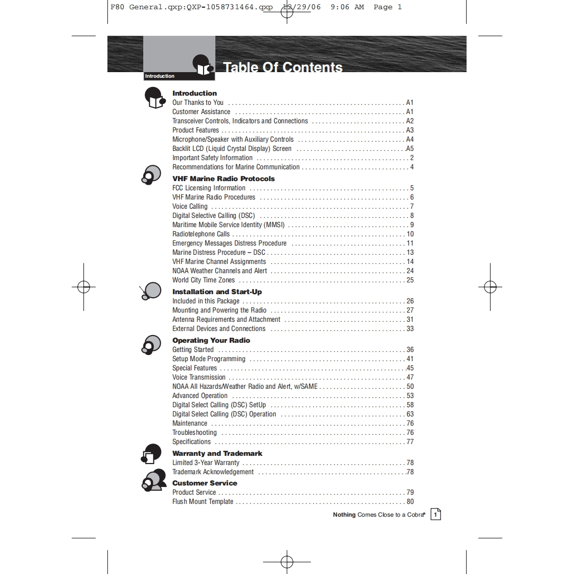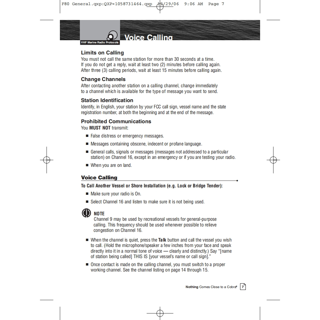 Nothing Comes Close to a CobraMR F80BVHF MARINE RADIODISTRESSSETUP415.450N76909.180128299000:357POC775-130:28#12583 FOwner's ManualMARINECobraA1 EnglishContact Your Local DealerFor Assistance Outside the U.S.A.English and Spanish.productinfo@cobra.com (e-mailwww.cobra.com (online:Frequently Asked Questions)Technical Assistance English only.Faxes can be received at 773-622-2269 (fax)Questions English and Spanish.773-889-3087()778:00 a.m.to 6:00 p.m.Central Time Mon.through Fri.(except holidays)Customer Assistance Operators English and Spanish.24 hours a day,seven (7)days a week 773-889-3087 (phone).Automated Help Desk English only.For Assistance in the U.S.A.电电VMCs.CL CLassistance after reading this manual,Cobra Electronics offers the followingits many features,please refer to this owner's manual.If you require furtherShould you encounter any problems with this product,or not understandCustomer Assistanceweather emergencies with a tone on a weather channel you can select for your areaAdministration),including two Canadian weather channels for alerting yo u toaccess to receive all NOAA(National Oceanographic and AtmosphericBesides 2-way communications,in the U.S.A.,the radio can provide quickradiotelephone calls to anywhere in the world through a marine operator.help,get information from other boaters,talk to lock or bridge tenders and makeand secondarily for navigation and operational purposes.With it,you can call forvessel-to-vessel and vessel-to-shore station communications,primarily for safetyThis radio is a VHF transceiver for fixed mounting on your boat.It gives you 2-wayHow Your CobraMarine VHF Radio Worksmany years of reliable service.Properly used,this Cobrae product will give youThank you for purchasing a CobraMarine VHF radio.Customer AssistanceOur Thanks to you andChicago,inols 60707 USA
