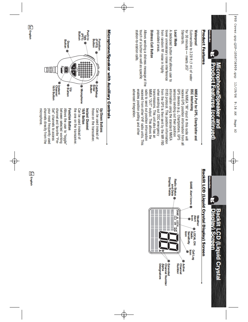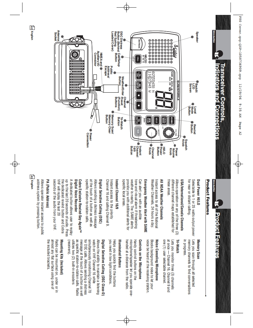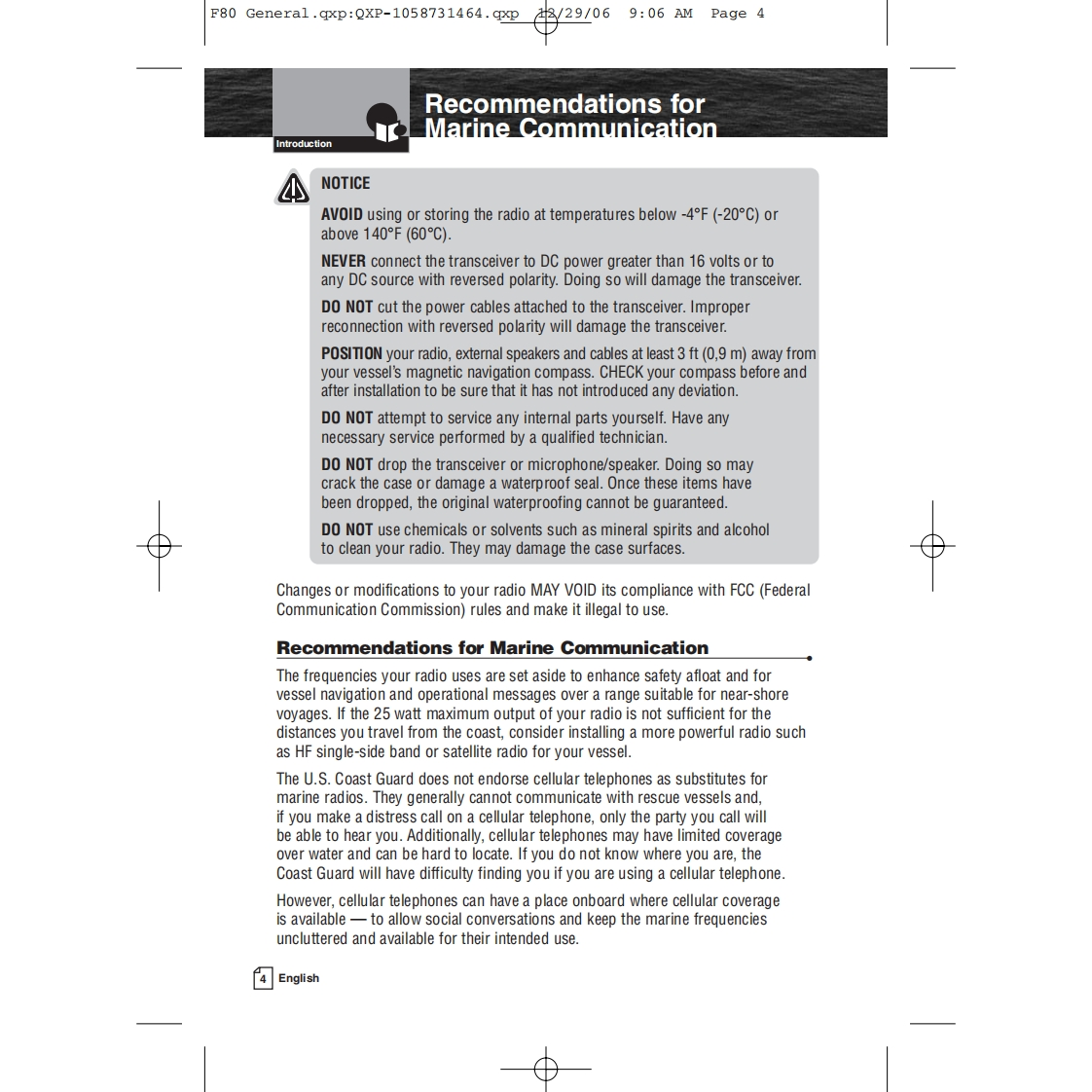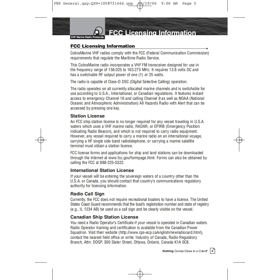 Nothing Comes Close to a CobraMR F80BVHF MARINE RADIODISTRESSSETUP415.450N76909.180128299000:357POC775-130:28#12583 FOwner's ManualMARINECobraA1 EnglishContact Your Local DealerFor Assistance Outside the U.S.A.English and Spanish.productinfo@cobra.com (e-mailwww.cobra.com (online:Frequently Asked Questions)Technical Assistance English only.Faxes can be received at 773-622-2269 (fax)Questions English and Spanish.773-889-3087()778:00 a.m.to 6:00 p.m.Central Time Mon.through Fri.(except holidays)Customer Assistance Operators English and Spanish.24 hours a day,seven (7)days a week 773-889-3087 (phone).Automated Help Desk English only.For Assistance in the U.S.A.电电VMCs.CL CLassistance after reading this manual,Cobra Electronics offers the followingits many features,please refer to this owner's manual.If you require furtherShould you encounter any problems with this product,or not understandCustomer Assistanceweather emergencies with a tone on a weather channel you can select for your areaAdministration),including two Canadian weather channels for alerting yo u toaccess to receive all NOAA(National Oceanographic and AtmosphericBesides 2-way communications,in the U.S.A.,the radio can provide quickradiotelephone calls to anywhere in the world through a marine operator.help,get information from other boaters,talk to lock or bridge tenders and makeand secondarily for navigation and operational purposes.With it,you can call forvessel-to-vessel and vessel-to-shore station communications,primarily for safetyThis radio is a VHF transceiver for fixed mounting on your boat.It gives you 2-wayHow Your CobraMarine VHF Radio Worksmany years of reliable service.Properly used,this Cobrae product will give youThank you for purchasing a CobraMarine VHF radio.Customer AssistanceOur Thanks to you andChicago,inols 60707 USA