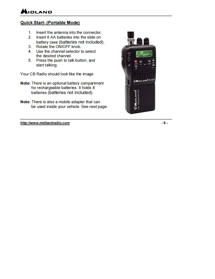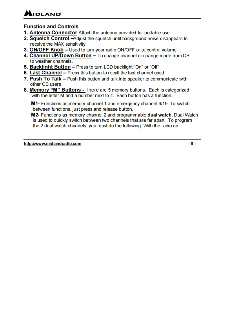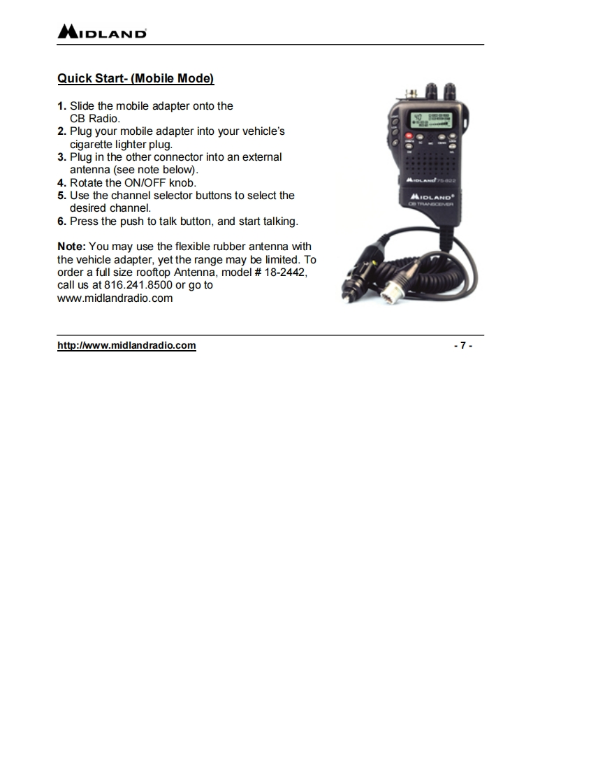 MIDLANDOwner's ManualModel Number 75-822Features Include:40 CB Channels10 Weather Channels5 Memory ChannelsIDLAND 75-828Memory ScanDual/WatchPortable and Mobile CB(2-in1)HI/LOW PowerAuto Power SaveInstant Ch 9.and 19●Backlit LCDhttp://www.midlandradio.com.1Downloaded from wwww.cbradio.nl
