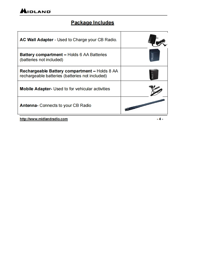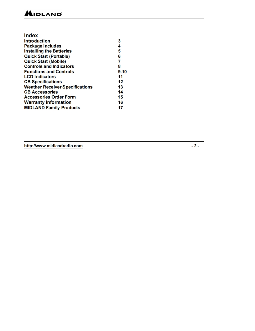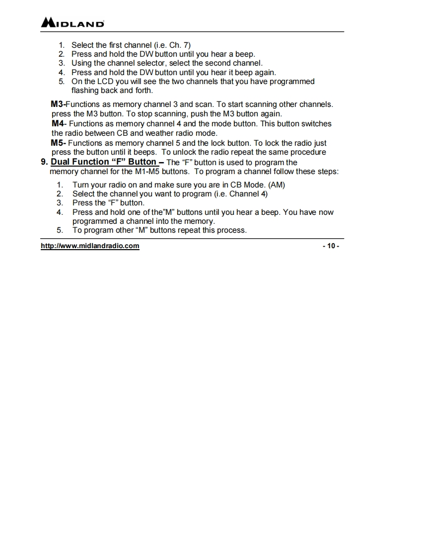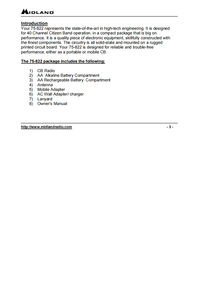MIDLANDOwner's ManualModel Number 75-822Features Include:40 CB Channels10 Weather Channels5 Memory ChannelsIDLAND 75-828Memory ScanDual/WatchPortable and Mobile CB(2-in1)HI/LOW PowerAuto Power SaveInstant Ch 9.and 19●Backlit LCDhttp://www.midlandradio.com.1Downloaded from wwww.cbradio.nl