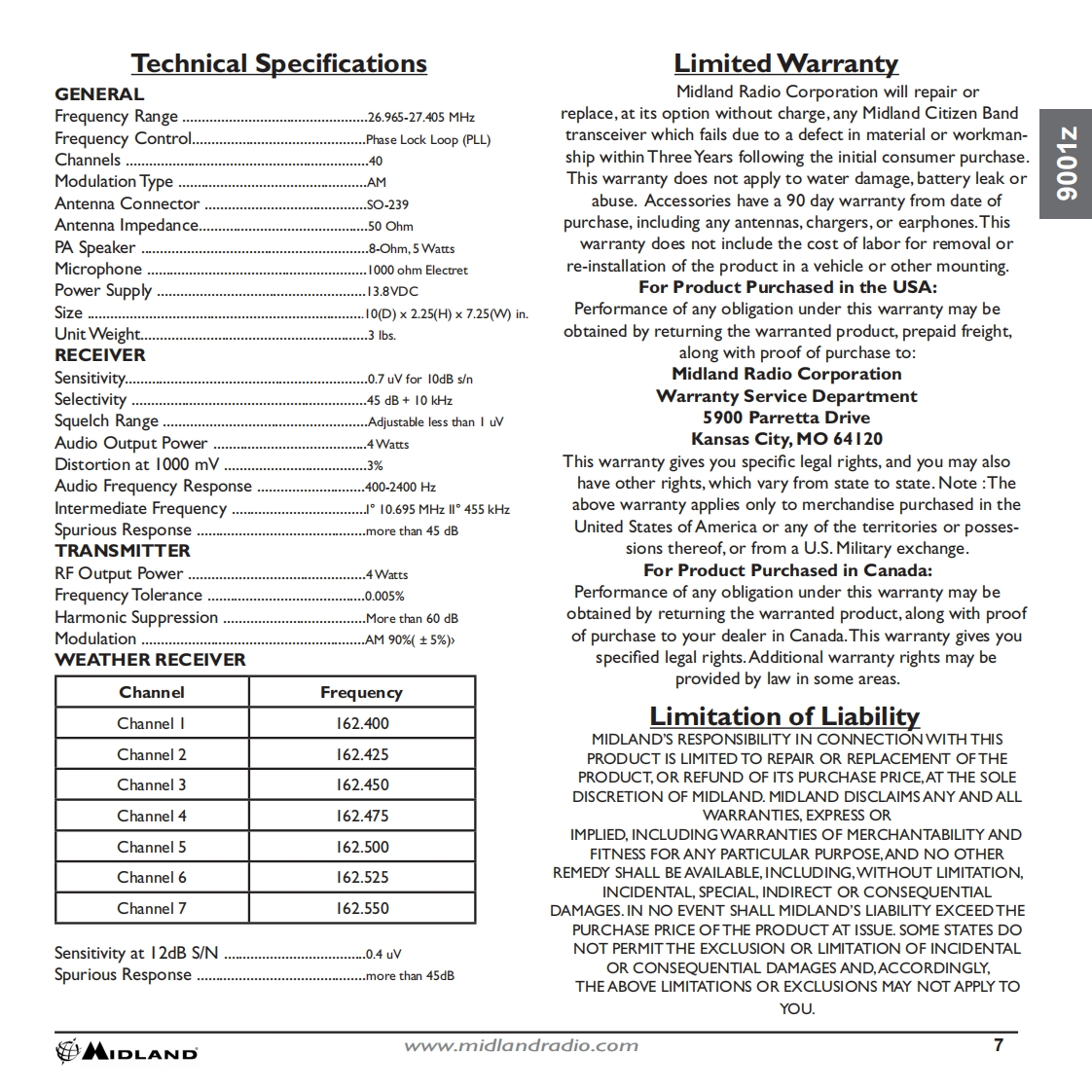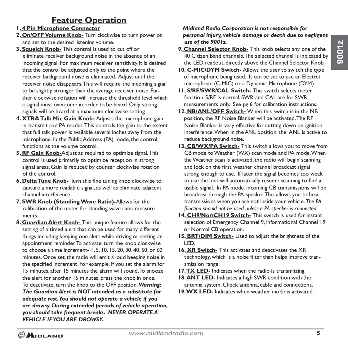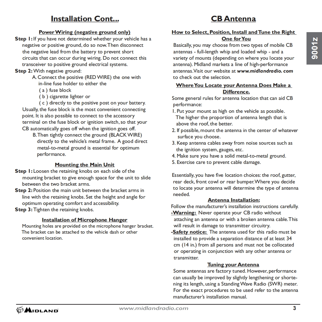 INDEXThank You.2Major 900Iz Features........2Installation.2-3Z100GCB Antenna..3900Iz Features and Controls.....4Feature Operation............5How to Operate Your CB......6Technical Specifications......7Limited Warranty.….7Limitation of Liability..7Service and Technical Support..8Accessories..8Accessories Order Form........9Other Midland Products....10蹈MIDLANDwww.midlandradio.com1