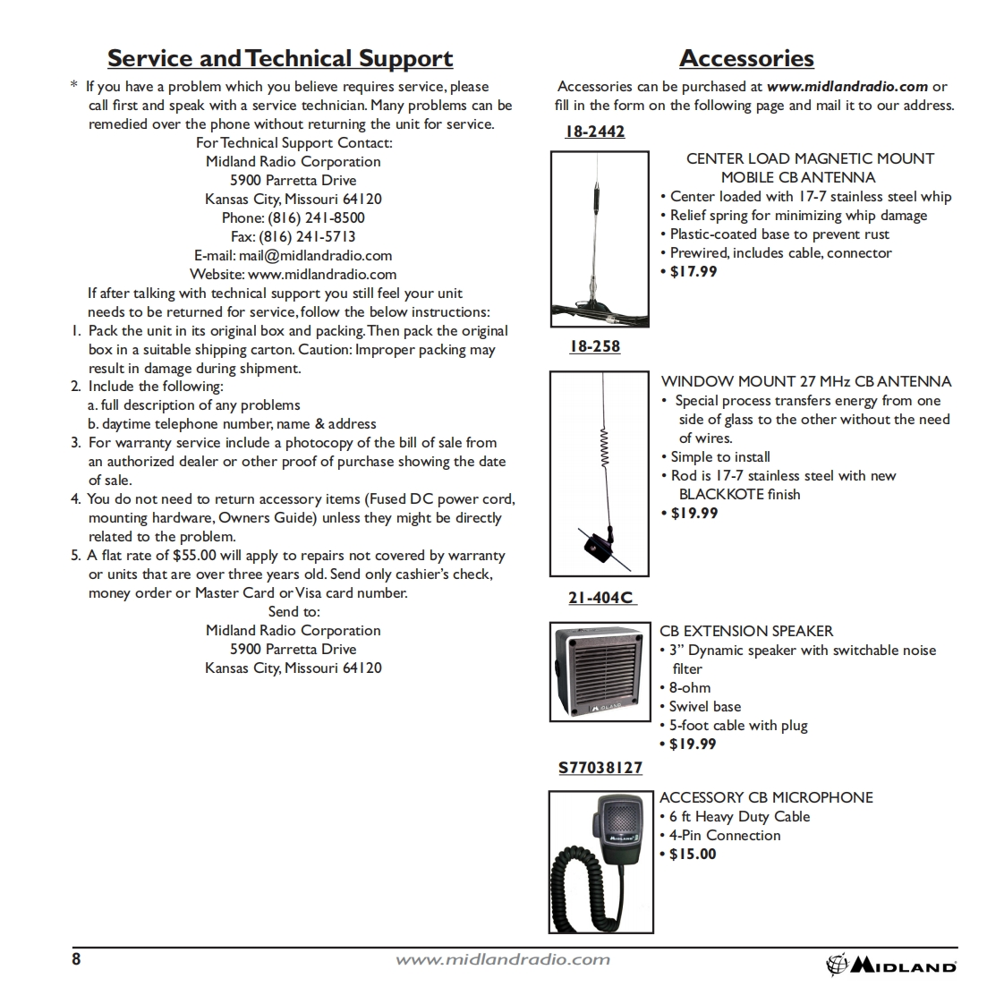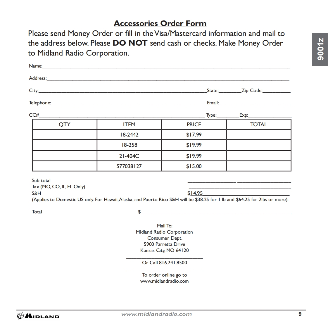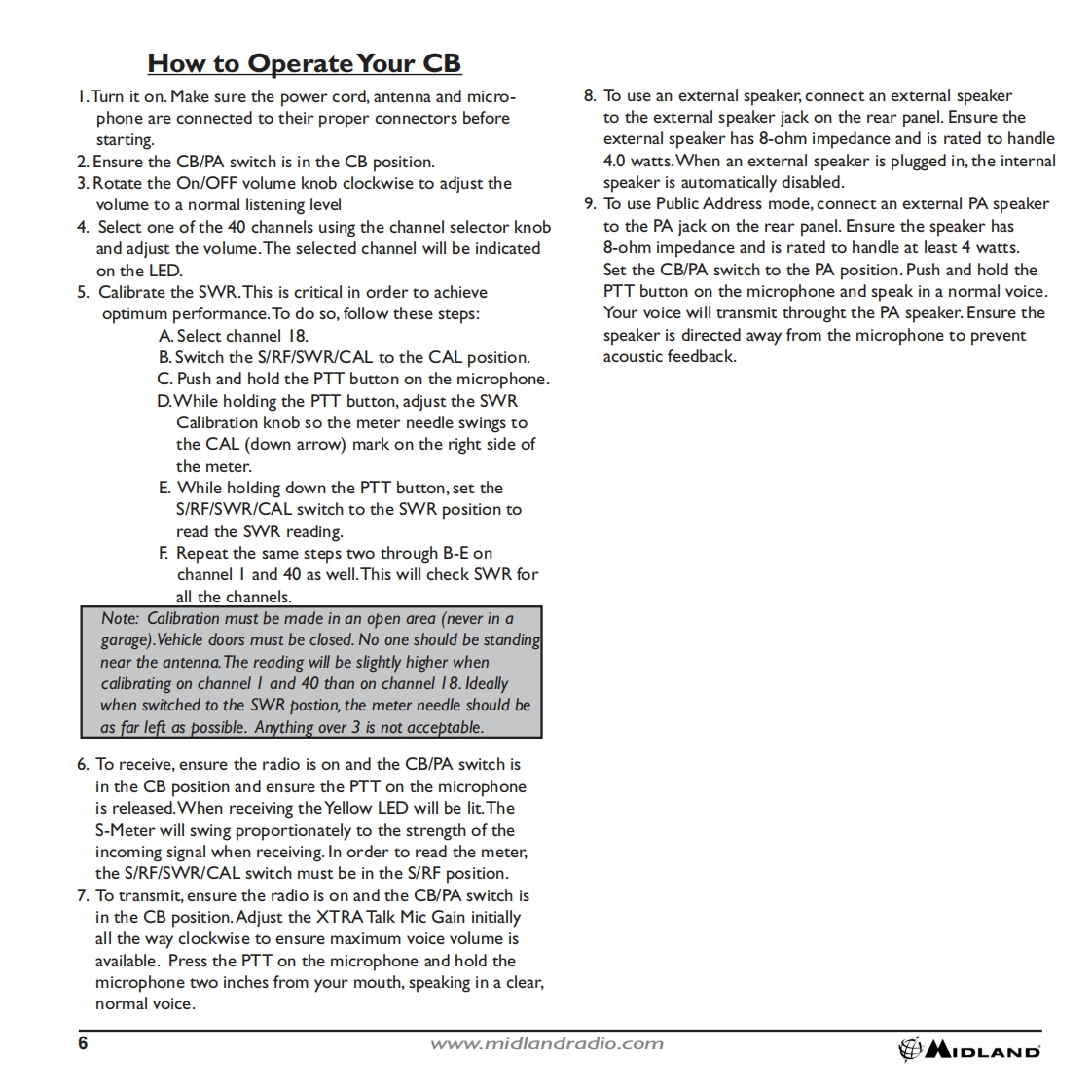 INDEXThank You.2Major 900Iz Features........2Installation.2-3Z100GCB Antenna..3900Iz Features and Controls.....4Feature Operation............5How to Operate Your CB......6Technical Specifications......7Limited Warranty.….7Limitation of Liability..7Service and Technical Support..8Accessories..8Accessories Order Form........9Other Midland Products....10蹈MIDLANDwww.midlandradio.com1