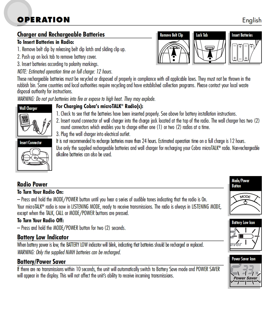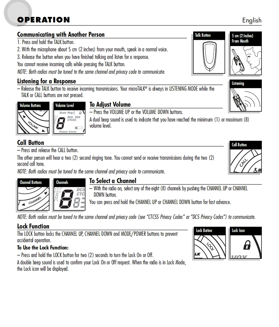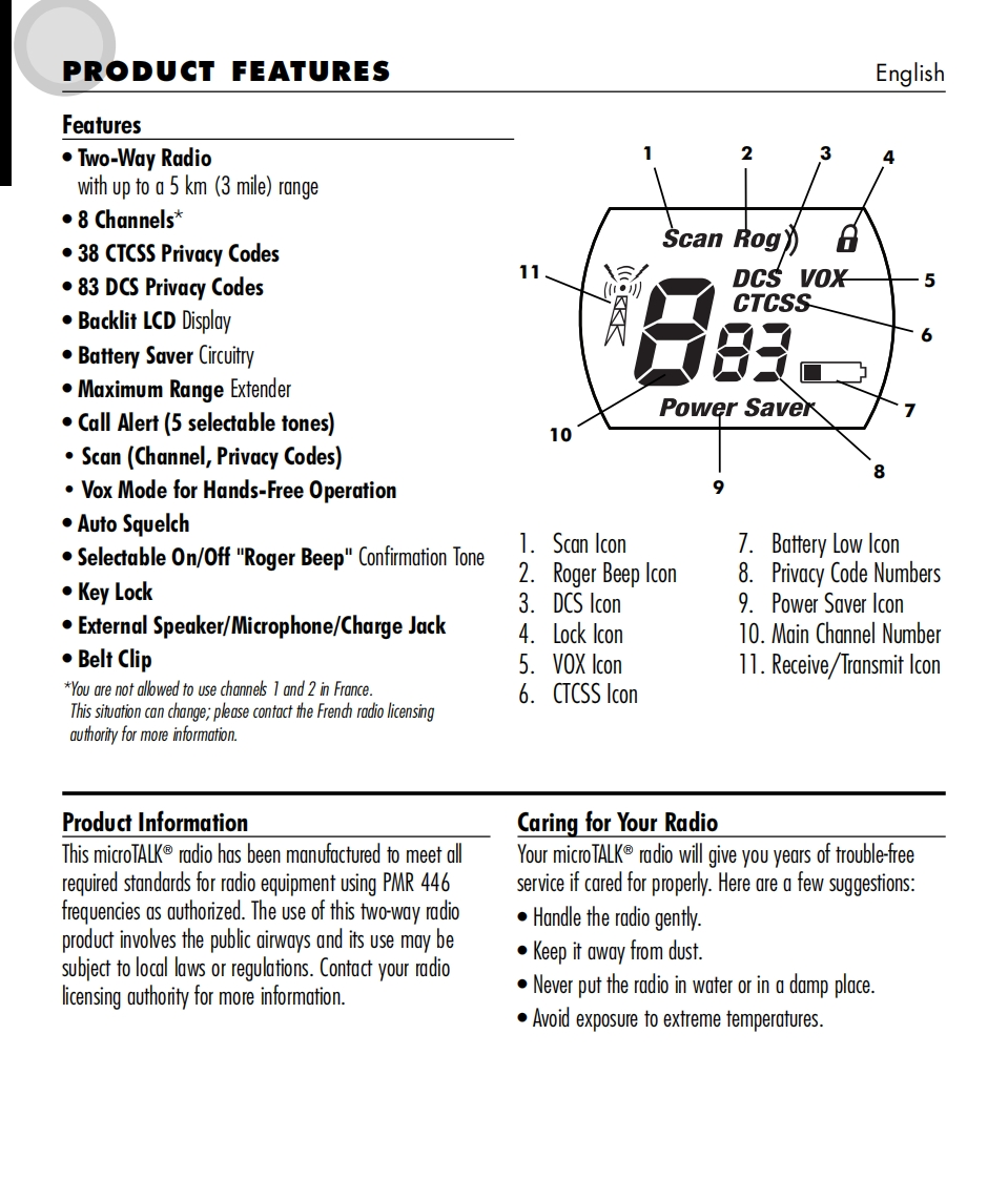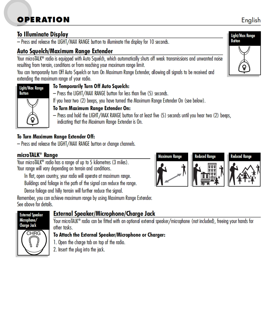 SmicrOTALKTwo-Way Radio Model MT 600ENGLISH1.Antenna2.Extemal Speaker/Microphone/Charge Jack3.Mode/Power Button624.Lock Button5.Channel Select Buttons6.Speaker/MicrophoneCHRG7.Light/Max Range Button8.Volume Control Buttons3109.Talk Button10.Call Button11.Belt Clip12.Battery ComparimentMOD∈13.Lock TabCALLSMiEFOTALKScan Rog?)日56VOLUMEPower Saver110000000g600▣001213