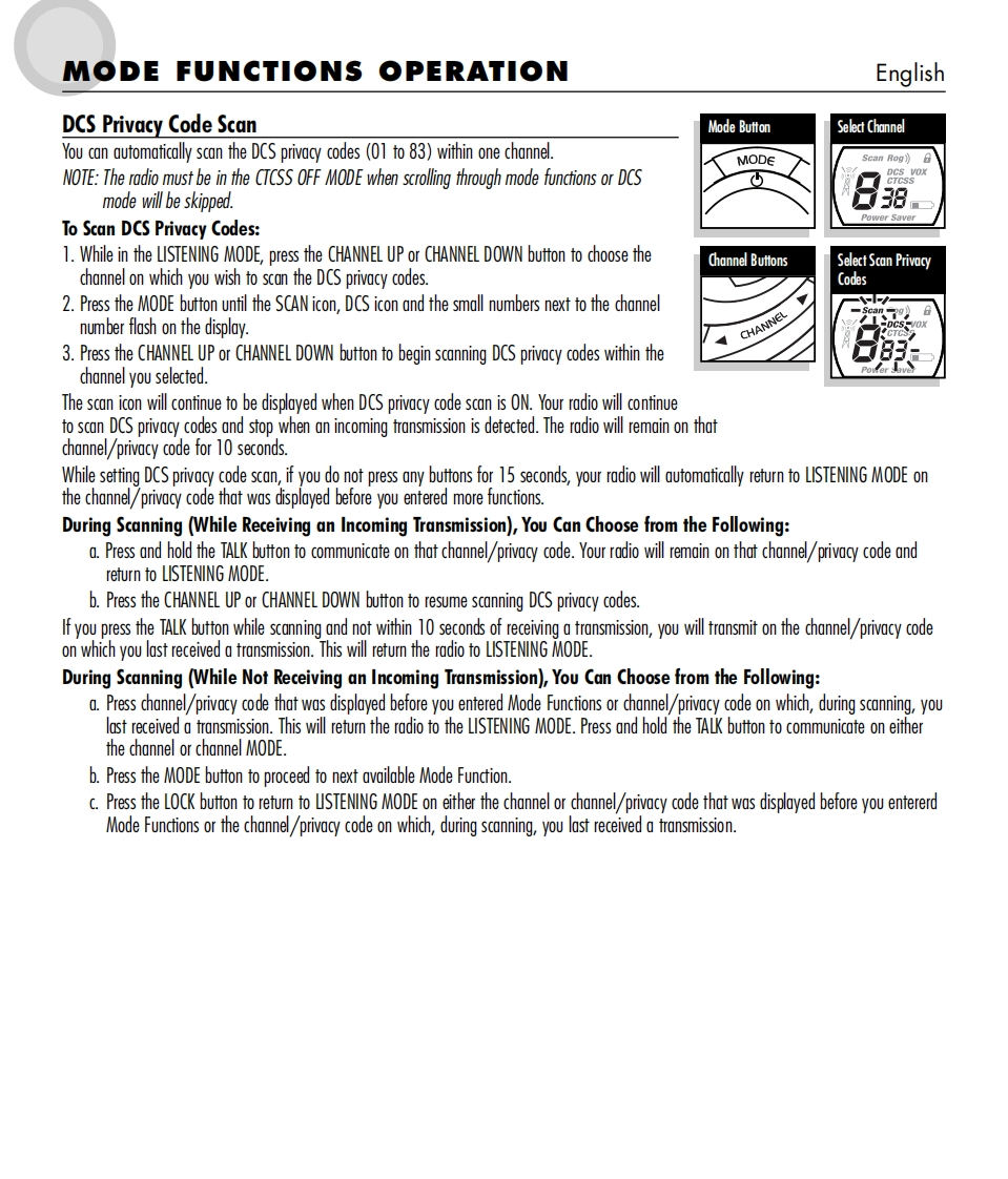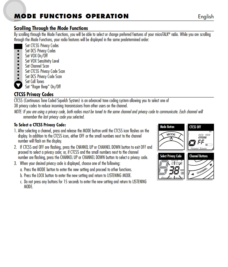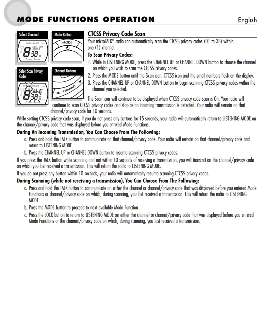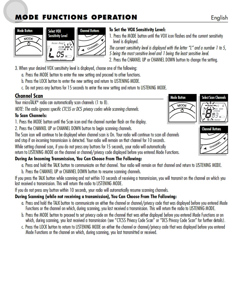 SmicrOTALKTwo-Way Radio Model MT 600ENGLISH1.Antenna2.Extemal Speaker/Microphone/Charge Jack3.Mode/Power Button624.Lock Button5.Channel Select Buttons6.Speaker/MicrophoneCHRG7.Light/Max Range Button8.Volume Control Buttons3109.Talk Button10.Call Button11.Belt Clip12.Battery ComparimentMOD∈13.Lock TabCALLSMiEFOTALKScan Rog?)日56VOLUMEPower Saver110000000g600▣001213