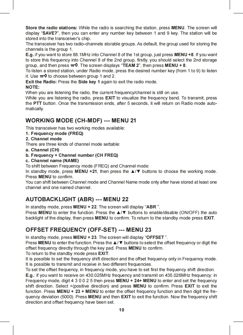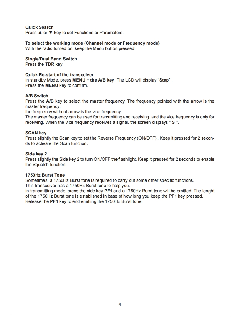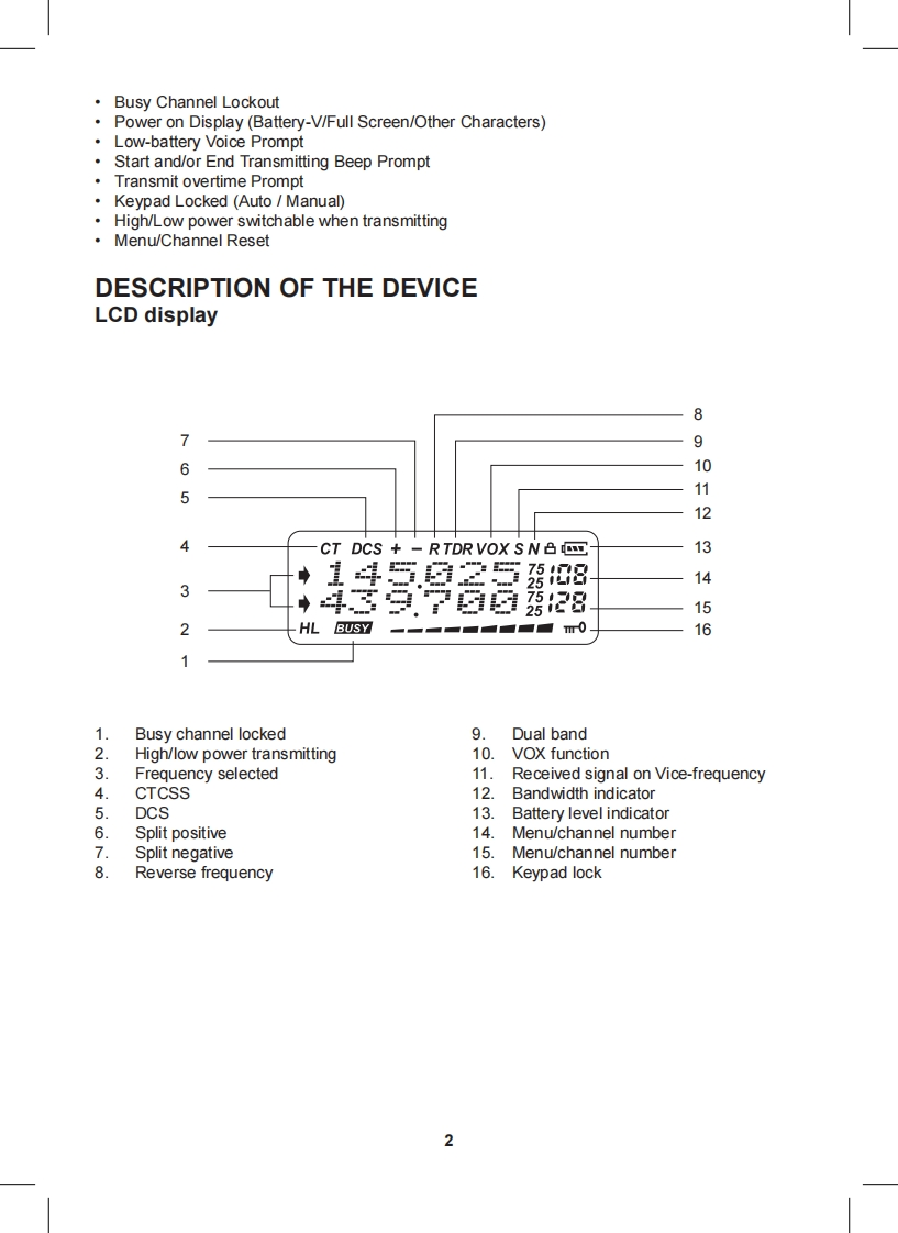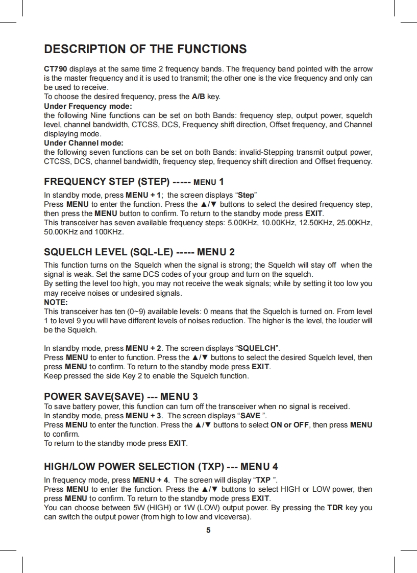 Content·1CT790 transceiver·1 high gain antenna·1i-ion battery pack·1 desktop charger·1 belt clip·1 hand strapIf any item is missing or have been damaged during the shipment,please notify your MIDLANDdealer.MaintenanceYour Two Way Radio is an electronic product of exact design and should be treated with care.The suggestions below will help you to fulfill any warranty obligations and to enjoy this product formany years.Do not attempt to open the unit.Non-expert handling of the unit may damage it.Do not store the Radio under the sunshine or in hot areas.High temperatures can shorten the life of electronic devices,and warp or melt certain plasticsDo not store the radio in dusty and dirty areasKeep the Radio dry.Rainwater or damp will corrode electronic circuits.If it appears that the Radio diffuses peculiar smell or smoke,please shut off its power immedia-tely and take off the charger or battery from the Radio.Do not transmit without antenna.Main functionsDual Band,Dual Frequency,Dual Display and Dual StandbyFrequency Range:144-146MHz 430-440MHz (Rx Tx).Working mode:U-V,V-V or U-U availableSame channel:VHF Tx UHF Rx or UHF Tx VHF Rx available·DTMF Encoding·Digital FM Radio(76-108MHz)CTCSS/DCS Frequency ScanOutput power:5W VHF /4W UHFMemory Channel:128 channels·VOX Function·Stopwatch Function105 groups DCS and 50 groups CTCSS·Voice Prompt·SOS FunctionWide/Narrow Bandwidth selection (25KHz 12.5KHz)Channel number,Channel Frequency or Channel name display mode availableMulti-functional ScanBright Flashlight illumination·Step(5/6.25/10/12.5/25KHz/50KHz/100KHz)High/Low Power selection (5W/1W)High Capacity Li-ion Battery·Intelligent ChargerOffset Frequency setting (0-69.950MHz)Frequency shift Direction Setting