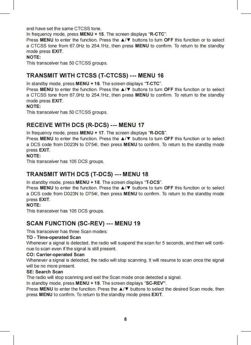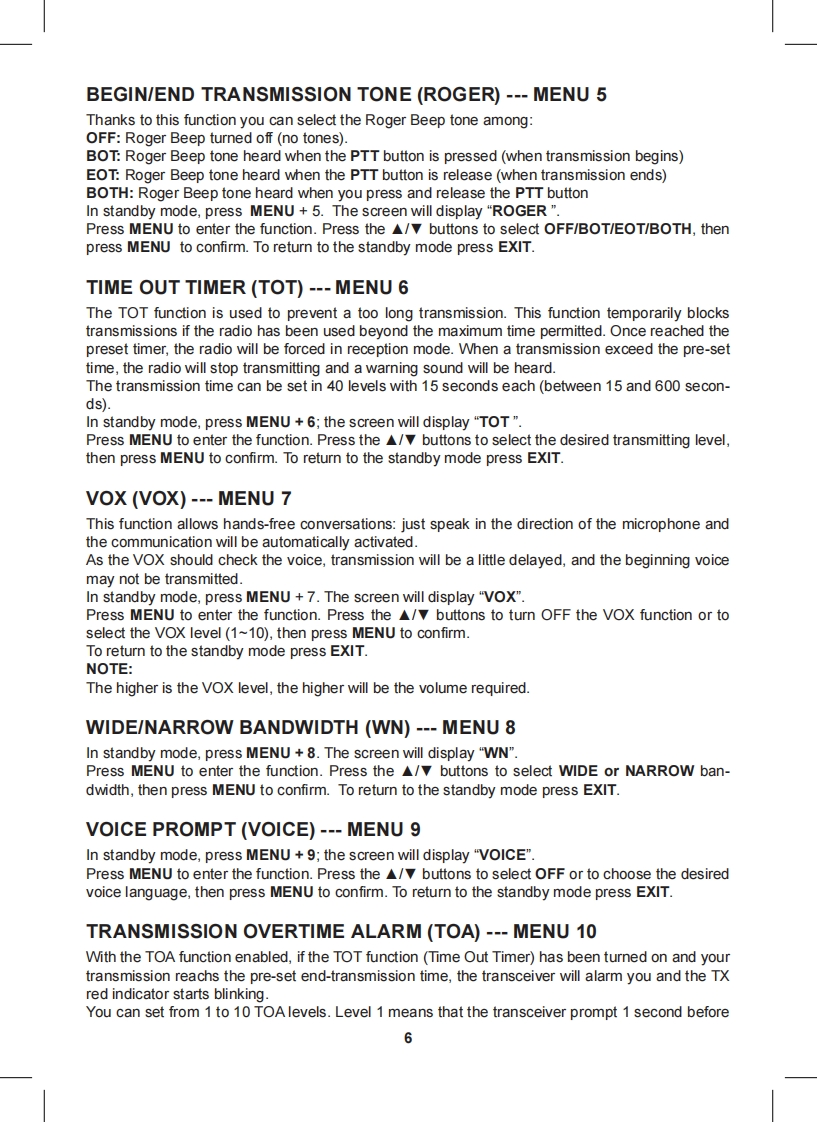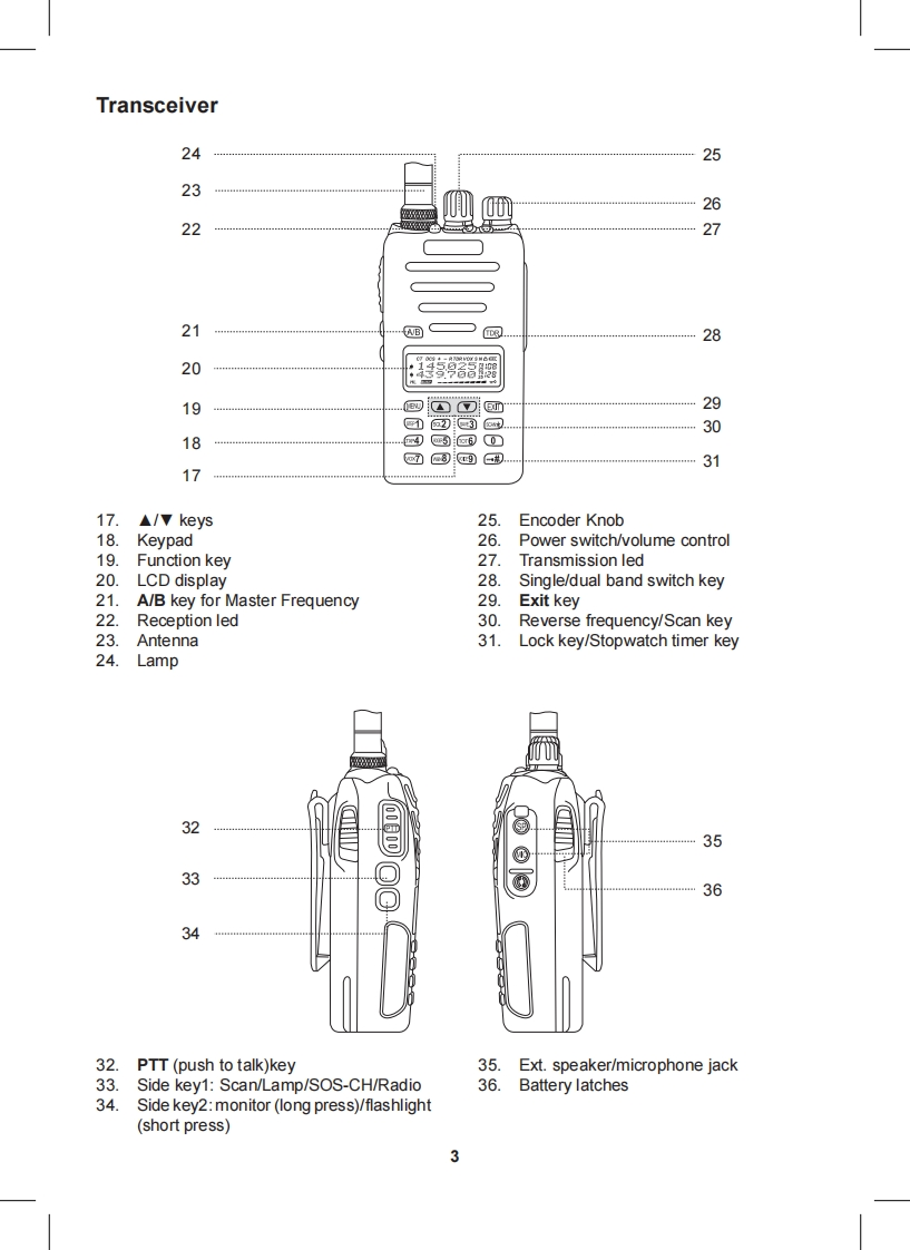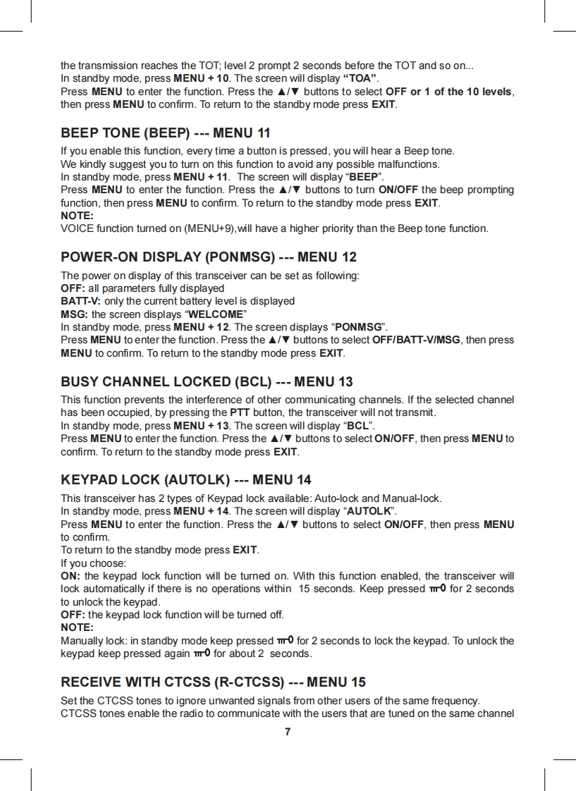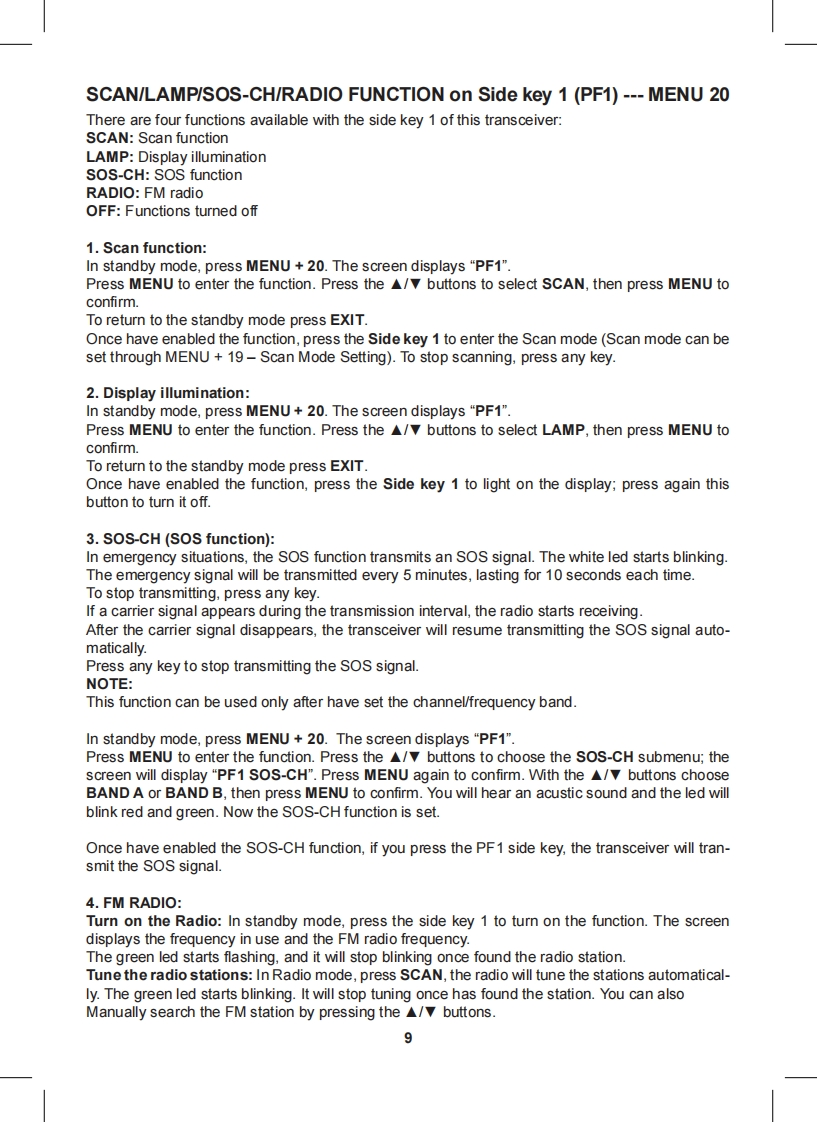 Content·1CT790 transceiver·1 high gain antenna·1i-ion battery pack·1 desktop charger·1 belt clip·1 hand strapIf any item is missing or have been damaged during the shipment,please notify your MIDLANDdealer.MaintenanceYour Two Way Radio is an electronic product of exact design and should be treated with care.The suggestions below will help you to fulfill any warranty obligations and to enjoy this product formany years.Do not attempt to open the unit.Non-expert handling of the unit may damage it.Do not store the Radio under the sunshine or in hot areas.High temperatures can shorten the life of electronic devices,and warp or melt certain plasticsDo not store the radio in dusty and dirty areasKeep the Radio dry.Rainwater or damp will corrode electronic circuits.If it appears that the Radio diffuses peculiar smell or smoke,please shut off its power immedia-tely and take off the charger or battery from the Radio.Do not transmit without antenna.Main functionsDual Band,Dual Frequency,Dual Display and Dual StandbyFrequency Range:144-146MHz 430-440MHz (Rx Tx).Working mode:U-V,V-V or U-U availableSame channel:VHF Tx UHF Rx or UHF Tx VHF Rx available·DTMF Encoding·Digital FM Radio(76-108MHz)CTCSS/DCS Frequency ScanOutput power:5W VHF /4W UHFMemory Channel:128 channels·VOX Function·Stopwatch Function105 groups DCS and 50 groups CTCSS·Voice Prompt·SOS FunctionWide/Narrow Bandwidth selection (25KHz 12.5KHz)Channel number,Channel Frequency or Channel name display mode availableMulti-functional ScanBright Flashlight illumination·Step(5/6.25/10/12.5/25KHz/50KHz/100KHz)High/Low Power selection (5W/1W)High Capacity Li-ion Battery·Intelligent ChargerOffset Frequency setting (0-69.950MHz)Frequency shift Direction Setting