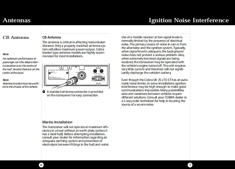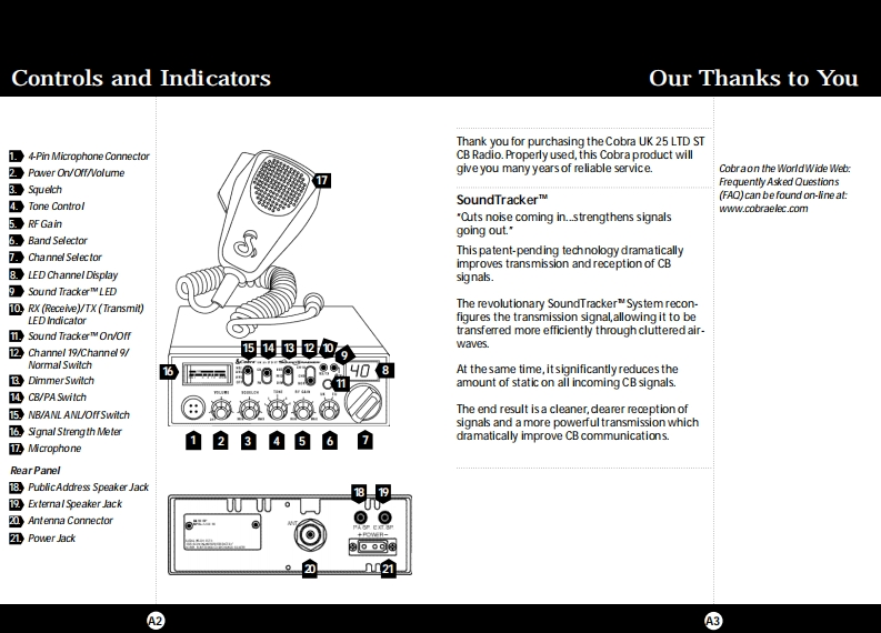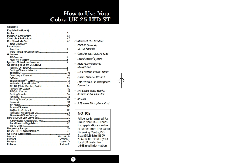 SCobraSCobrauK25 LTDsSTOperating Instructions for your Cobra UK 25 LTD ST CBRadioBedienungsanleitung fur Ihr Modell Cobra UK 25 LTD STCB-FunkgeratInstructivo de uso de la radio de banda ciudadana (CB)Cobra UK 25 LTD STInstructions d'utilisation du poste de radio CB UK 25 LTD STde CobraIstruzioni per I'uso del modello Cobra UK 25 LTD STCobra Electronics Corporation6500 West Cortland StreetChicago,IL 60707 USAwww.cobraelec.com99992340月南道清南南7DATT COAIANYCobra Electonics Corp 1999"Ingenious Products tor Easer Communca tion"