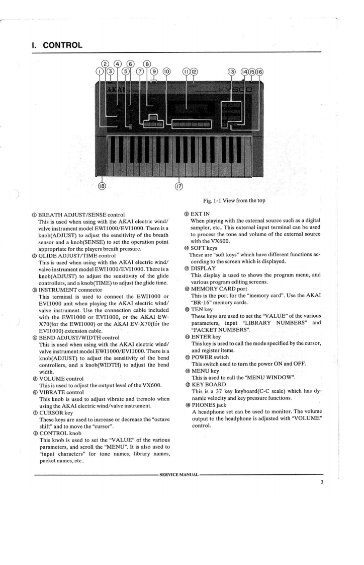 AKAI SERUICE MANUALPROGRAMMABLE MATRIX SYNTHESIZERMODELVX600CAUTION:Before servicing,to protect customer's program data from being damaged,saveall data to IC memory card.SPECIFICATIONSModel.…Programmable matrix analog synPOWER SWITCHthesizerMEMORY PROTECTKey board…37-keyC-Cscale(with dynamies vel-SWITCHocity and key pressure funetions)CONTRASTSimultaneous sounds....:..6 voicesConnection terminalsSound souceINSTRUMENTDisplay..................graphic displayEXTERNAL INStandard phone jack x2Internal memory...........Battery back up typeLINE OUT ....Standard phone jackPacket....10x20 programsPHONESStandard stereo phone jackLibrary50 tonesProgram...............40 programsVOICE OUT .........monaural)DIN/13 pinChord ...............20 patternsPROGRAMExternal memoryCompatible withUP/DOWNIC memory cardStandard stereo phone jack(for foot(AKAI BR-16/16K'bytes)switch)PEDAL1.............Standard stereo phone jack(for pedalPacket................10x20 programs x2switch)Library...50 tones×2PEDAL2Standard stereo phone jack(for pedalProgram ..............40 programs x2Chord2MIDI IN/OUT/THRU...DIN/5pinFunetion ................BEND ADJUST/WIDTH1/O PORTFor expansion.(cover is currentry in-GLIDE ADJUST/TIMEstalled)BREATH ADJUST/SENSEPower requiamentVIBRATEVOLUMEAC 220V,50Hz for europe exceptCONTROL KNOBUKCURSOR KEY(△VAP)AC 240V,50Hz for UK and australiaTEN KEYPower consumption21WMENU KEYal dimensions602(Wx116(Hx305(D)mENTER KEYWeight.……·…8.2kgSOFT KEYFor improvement purposes,specifications and design are subject to change without notice.