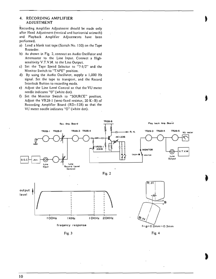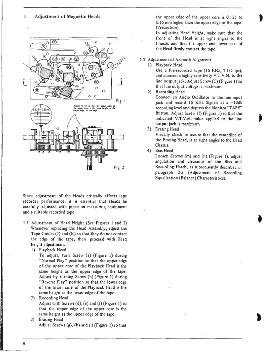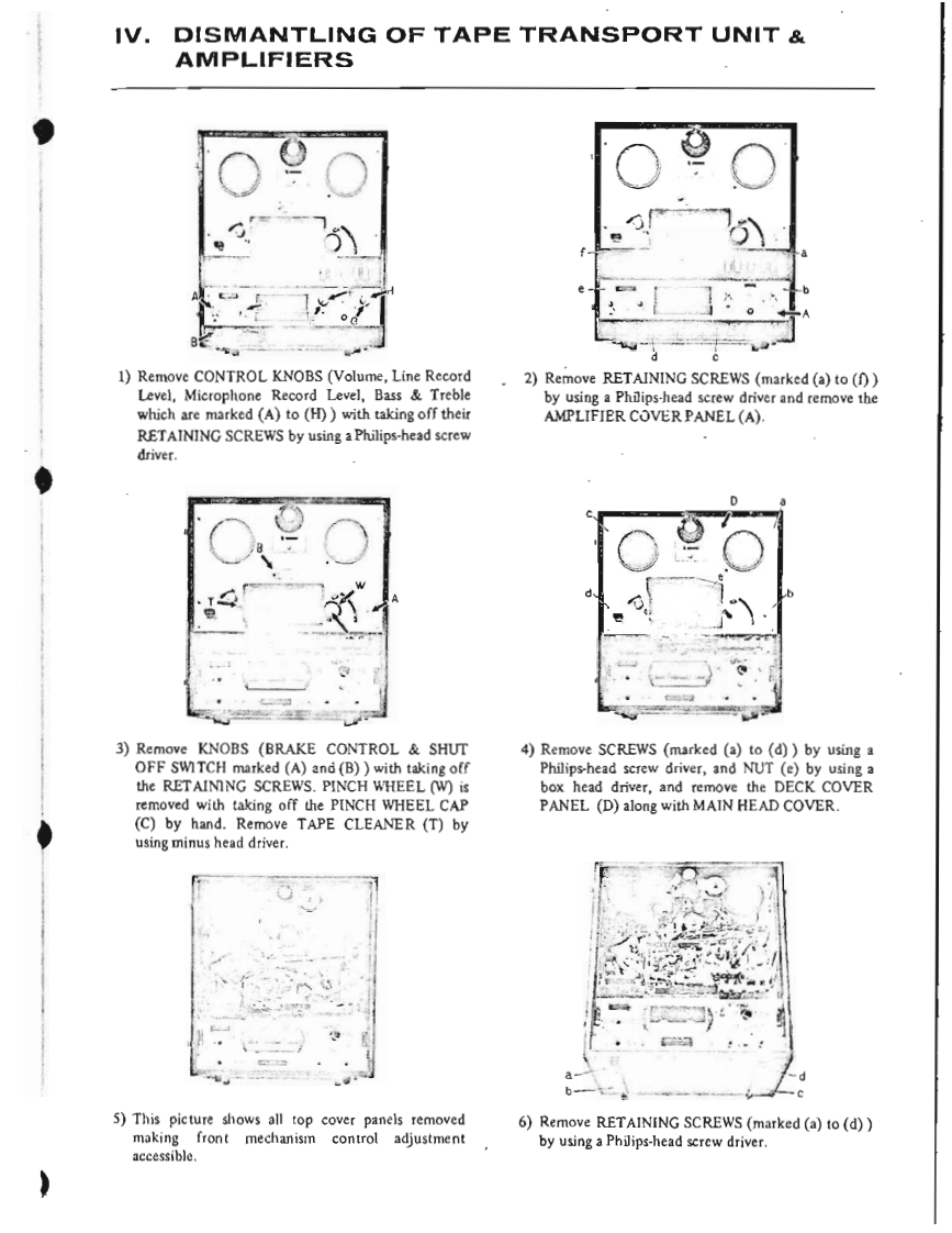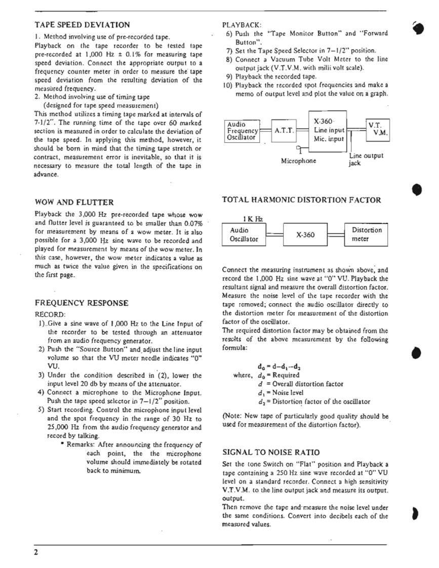 I.SPECIFICATIONSPOWER SUPPLY AC 100 to 240 V,50 or 60 HzMAIN MOTOR Hysteresis Synchronous 3 spcedsRECORDING SYSTEM(2-4-8 pole)motor.In-line 4-track stereo,monaural recordingCondenser Capacity 3MF(50 Hz).2 MFby using Cross-field Bias Head.(60Hz)TAPE SPEED:1-7/8,3-3/4,7-1/2end15ip5Revolutions:TAPE SPEED DEVIATION3,000-1500-750r.p.m.(50Hz)Within 0.5%at 7-1/2 ips3,600-1800-900r.p.m.(60Hz)Within1.0%at 3-3/4 ipsREEL MOTORTwo 6-pole eddy current outer-rotorWithin土】.0%at1-7/8ipsmotorsWOW AND FLUTTERRevolutionsLess than 0.10%rm.s.at 7-1/2 ips930 r.p.m.at 50 Hz,100 VLess than 0.13%r.m.s.at 3-3/4 ips1,120rp.m.at60Hz,120VLess than 0.25%r.m.s.at 1-7/8 ipsHEADSFREQUENCY RESPONSEPLAYBACK HEAD:30to21.000Hz±3dBat7-1/2pIn-line 4-track stereo and monaural30 to 18,000 Hz+3 dB at 3-3/4 ipsImpedance...5,000 ohms at 1,000 Hz40 to 9.000 Hzt4 dB at 1-7/8 ipsGap ..2 micronsSIGNAL TO NOISE RATIORECORDING HEAD(at Line Output)Greater than 48 dB at 7-1/2 ipsIn-line 4-track stereo and monauralGreater than 45 dB at 3-3/4 ipsImpedance...45 ohms at 1,000 HzGreater than 48 dB at 1-7/8 ipsCap...2 micronsTOTAL HARMONIC DISTORTIONERASE HEAD In-line 4-track stereo and monaural(at Line Output,1,000 Hz 0 VU Rec/PB)Impedance...380 ohms at 100 KHzWithin 1.7%at 7-1/2 ipsGap ...0.4 mmWithin 3.0%at 3-3/4 ipsCROSS-FTELD BIAS HEADWithin 3.0%at 1-7/8 ipsIn-line 4-track stereo and monauralRECORDING INPUTSImpedance...430 ohms at 100 KHzMICROPHONE Above 0.7 mVGap...0.4 mmLINE INPUTAbove 70 mVINTERNAL SPEAKERSImpedance...166 K ohms2 4-inch Round SpeakersDIN INPUT:High:70mV166 K ohmsNominal Power Input...3 W.16 ohmsLow 7mV 16 K ohmsTRANSISTORS USEDOUTPUTS:152SC458LG@/©LINE OUTPUTRequired Load Impedance152SC372more than 50,000 ohms12SC828①1.23 V (+4 dbs 1.5 db)at 7-1/2 ips32SC538A@1.03 V(+2.5 dbst 1.5 db)at 3-3/4 ips22SC650@X-360D (without0.82V(+0.5dbs±1.5db)at1-7/8ips12sC728Main Amplifier)44e3.POWER OUTPUT:External Speaker Jack1 2SB75AMore than 10 W at 8 ohms Non-inductive12SB77A®resistance42SD157NOISELess than 5 mV at 8 ohms at Extemal12SD147Speaker Jack62SC828R(Volume Control at"Minimum"position)2 2SCS3BRQMain AmplificrFAST FORWARD AND REWIND TIME4 2SC696EB16ea.75 seconds for a full 1,200 foot tape42sD130Rat 50 HzDIODE USED9 IN34A60 seconds for a full 1.200 foot tape210D2at 60 Hz1210D4CROSS-TALKLess than -70 dB (Monaural)110D6Less than-43 dB(Stereo)15B2ERASE RATIO More than 70 dB2sL150INSULATION DURABILITY2sL-150d500 V AC for more thmn omne minte2 IN759Aduration1 RD-24ABIAS FREQUENCY:100 KHz