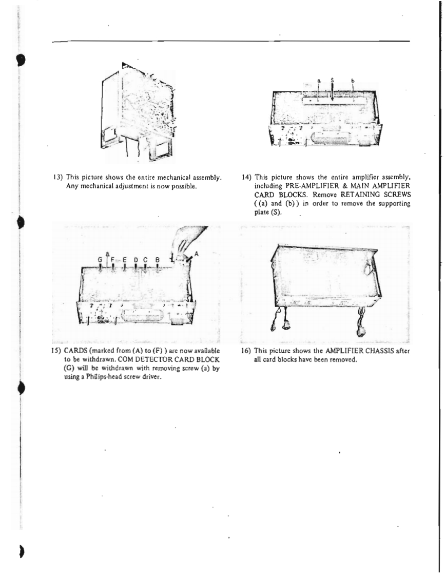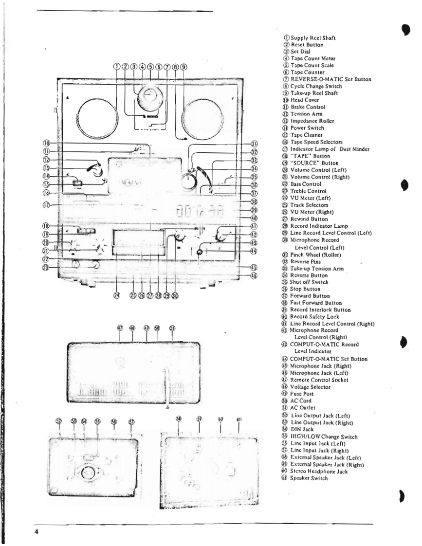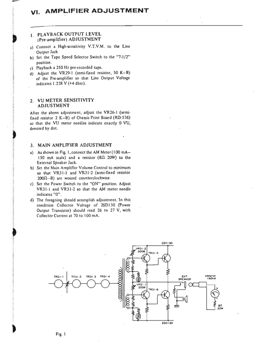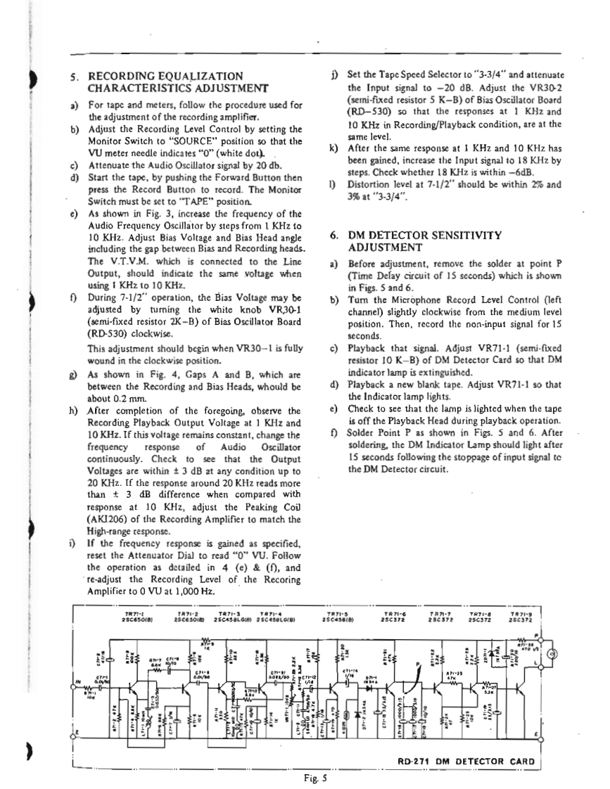 I.SPECIFICATIONSPOWER SUPPLY AC 100 to 240 V,50 or 60 HzMAIN MOTOR Hysteresis Synchronous 3 spcedsRECORDING SYSTEM(2-4-8 pole)motor.In-line 4-track stereo,monaural recordingCondenser Capacity 3MF(50 Hz).2 MFby using Cross-field Bias Head.(60Hz)TAPE SPEED:1-7/8,3-3/4,7-1/2end15ip5Revolutions:TAPE SPEED DEVIATION3,000-1500-750r.p.m.(50Hz)Within 0.5%at 7-1/2 ips3,600-1800-900r.p.m.(60Hz)Within1.0%at 3-3/4 ipsREEL MOTORTwo 6-pole eddy current outer-rotorWithin土】.0%at1-7/8ipsmotorsWOW AND FLUTTERRevolutionsLess than 0.10%rm.s.at 7-1/2 ips930 r.p.m.at 50 Hz,100 VLess than 0.13%r.m.s.at 3-3/4 ips1,120rp.m.at60Hz,120VLess than 0.25%r.m.s.at 1-7/8 ipsHEADSFREQUENCY RESPONSEPLAYBACK HEAD:30to21.000Hz±3dBat7-1/2pIn-line 4-track stereo and monaural30 to 18,000 Hz+3 dB at 3-3/4 ipsImpedance...5,000 ohms at 1,000 Hz40 to 9.000 Hzt4 dB at 1-7/8 ipsGap ..2 micronsSIGNAL TO NOISE RATIORECORDING HEAD(at Line Output)Greater than 48 dB at 7-1/2 ipsIn-line 4-track stereo and monauralGreater than 45 dB at 3-3/4 ipsImpedance...45 ohms at 1,000 HzGreater than 48 dB at 1-7/8 ipsCap...2 micronsTOTAL HARMONIC DISTORTIONERASE HEAD In-line 4-track stereo and monaural(at Line Output,1,000 Hz 0 VU Rec/PB)Impedance...380 ohms at 100 KHzWithin 1.7%at 7-1/2 ipsGap ...0.4 mmWithin 3.0%at 3-3/4 ipsCROSS-FTELD BIAS HEADWithin 3.0%at 1-7/8 ipsIn-line 4-track stereo and monauralRECORDING INPUTSImpedance...430 ohms at 100 KHzMICROPHONE Above 0.7 mVGap...0.4 mmLINE INPUTAbove 70 mVINTERNAL SPEAKERSImpedance...166 K ohms2 4-inch Round SpeakersDIN INPUT:High:70mV166 K ohmsNominal Power Input...3 W.16 ohmsLow 7mV 16 K ohmsTRANSISTORS USEDOUTPUTS:152SC458LG@/©LINE OUTPUTRequired Load Impedance152SC372more than 50,000 ohms12SC828①1.23 V (+4 dbs 1.5 db)at 7-1/2 ips32SC538A@1.03 V(+2.5 dbst 1.5 db)at 3-3/4 ips22SC650@X-360D (without0.82V(+0.5dbs±1.5db)at1-7/8ips12sC728Main Amplifier)44e3.POWER OUTPUT:External Speaker Jack1 2SB75AMore than 10 W at 8 ohms Non-inductive12SB77A®resistance42SD157NOISELess than 5 mV at 8 ohms at Extemal12SD147Speaker Jack62SC828R(Volume Control at"Minimum"position)2 2SCS3BRQMain AmplificrFAST FORWARD AND REWIND TIME4 2SC696EB16ea.75 seconds for a full 1,200 foot tape42sD130Rat 50 HzDIODE USED9 IN34A60 seconds for a full 1.200 foot tape210D2at 60 Hz1210D4CROSS-TALKLess than -70 dB (Monaural)110D6Less than-43 dB(Stereo)15B2ERASE RATIO More than 70 dB2sL150INSULATION DURABILITY2sL-150d500 V AC for more thmn omne minte2 IN759Aduration1 RD-24ABIAS FREQUENCY:100 KHz