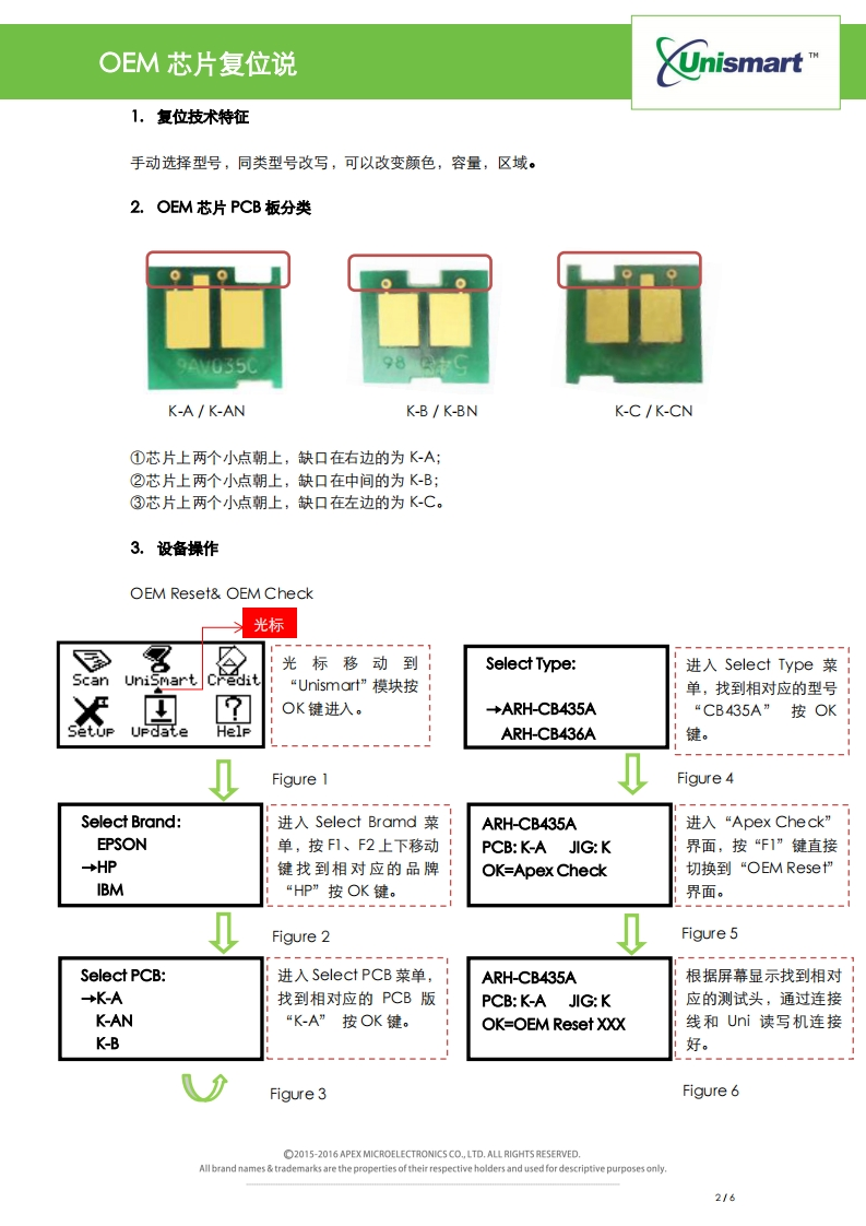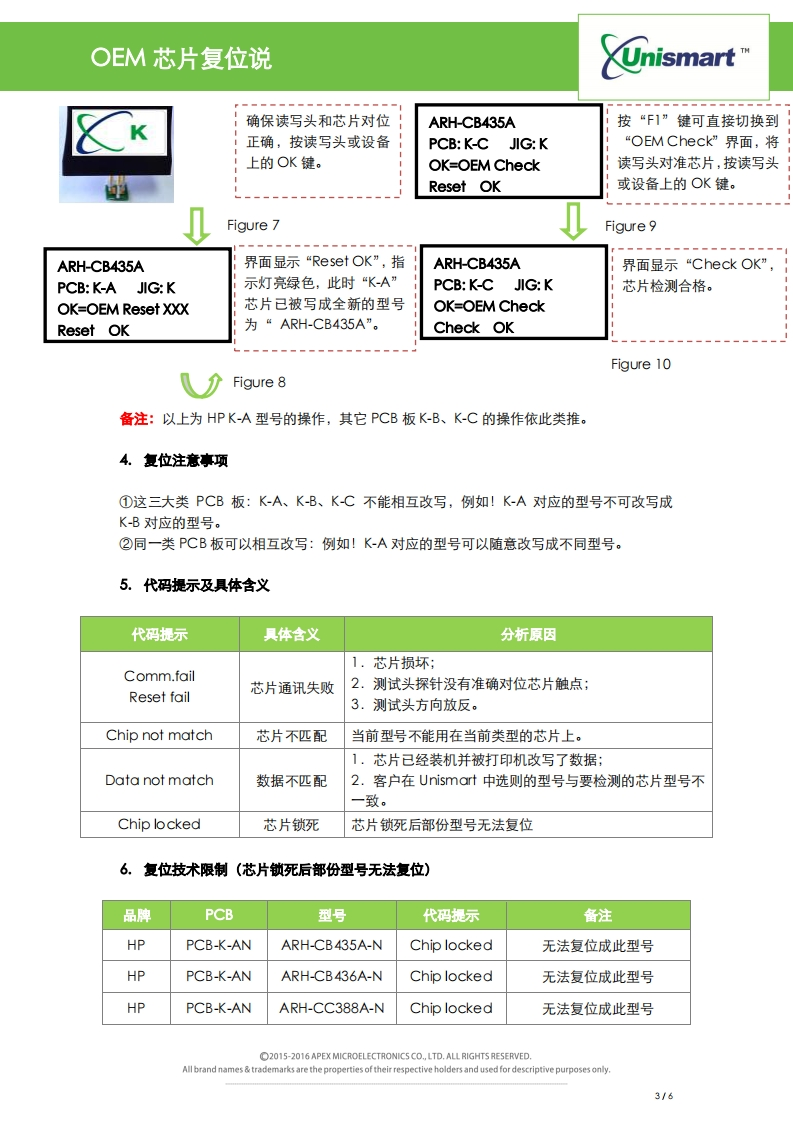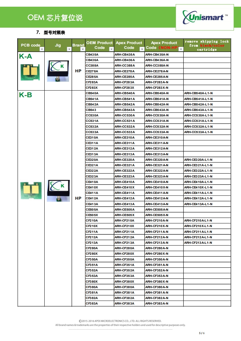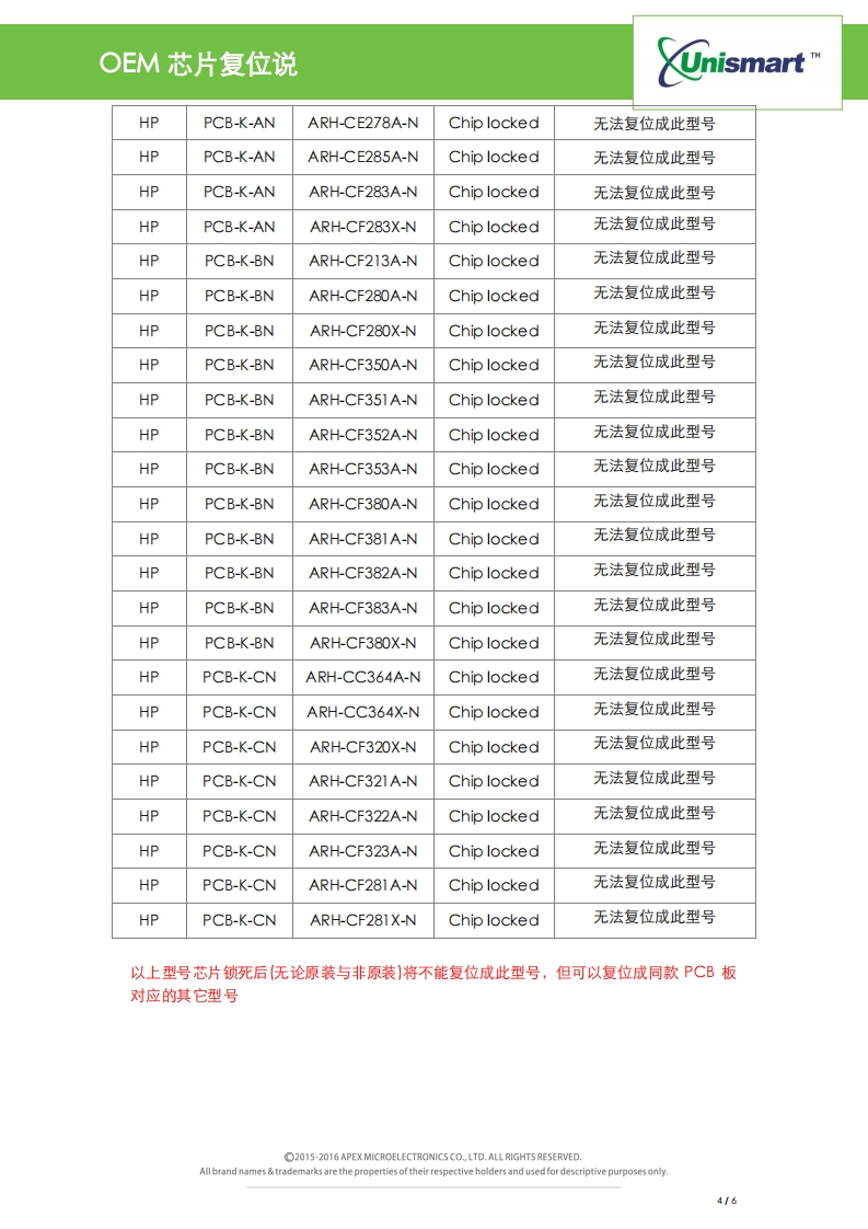 HP-K类OEM芯片复位说明找手册网29天前发布关注私信0.52MB6页021HP-K类OEM芯片复位说明此内容为付费资源,请付费后查看¥19¥21黄金会员免费钻石会员免费登录购买付费资源 第1页 / 共6页 第2页 / 共6页 第3页 / 共6页 第4页 / 共6页 第5页 / 共6页 第6页 / 共6页 已完成全部阅读,共6页 THE END惠普 文本预览 OEM芯片复位说UnismartUni HP-KOEM芯片复位说明V1.0目录1复位技术特征22.OEM芯片PCB板分类.…23.设备操作…4.复位注意事项….35.代码提示及具体含义…36.复位技术限制…37.型号对照表5 查看更多 收起部分 喜欢就支持一下吧收藏