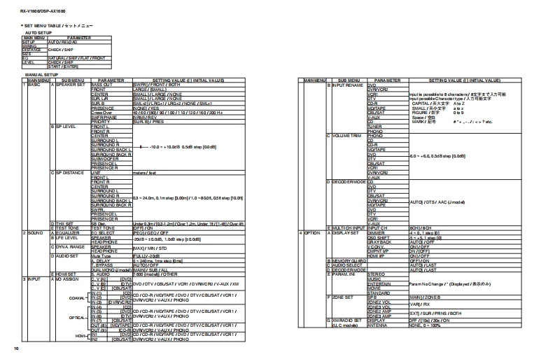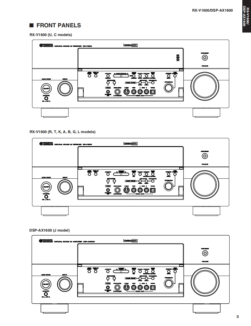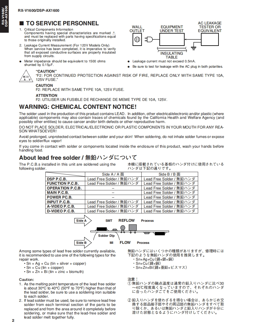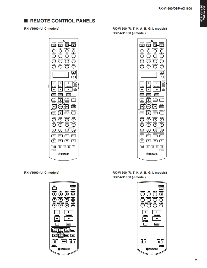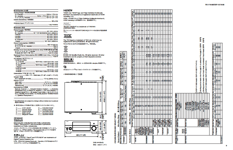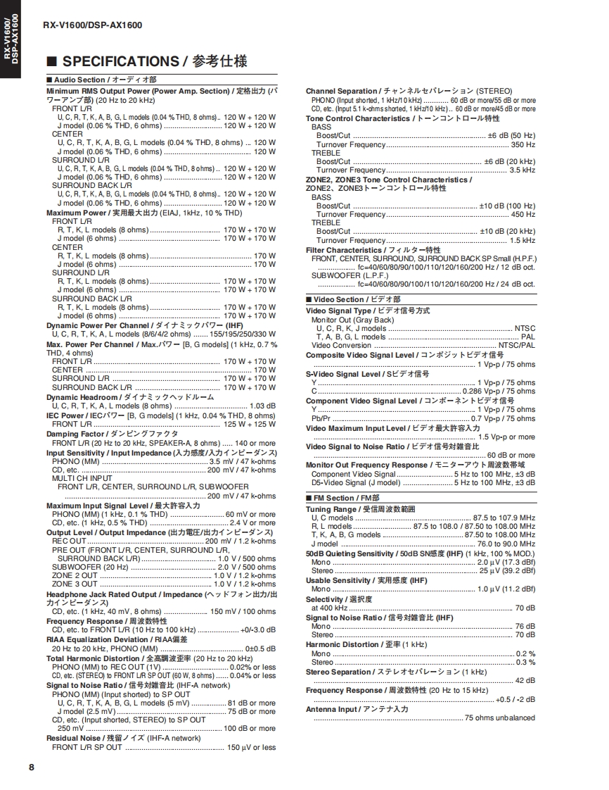 DSFRX-AV RECEIVER/AV AMPLIFIERRX-V1600/DSP-AX1600SERVICE MANUALIMPORTANT NOTICEThis manual has been provided for the use of authorized YAMAHA Retailers and their service personnel.It has been assumed that basic service procedures inherent to the industry,and more specifically YAMAHA Products,are alreadyknown and understood by the users,and have therefore not been restated.WARNING:Failure to follow appropriate service and safety procedures when servicing this product may result in personalinjury,destruction of expensive components,and failure of the product to perform as specified.For these reasons,we advise all YAMAHA product owners that any service required should be performed by an authorizedYAMAHA Retailr or the appointed service representative.IMPORTANT:The presentation or sale of this manual to any individual or firm does not constitute authorization,certification orrecognition of any applicable technical capabilities,or establish a principle-agent relationship of any form.The data provided is believed to be accurate and applicable to the unit(s)indicated on the cover.The research,engineering.adservice departments of YAMAHA are continually striving to improve YAMAHA products.Modificationsare,therefore,inevitableand specifications are subject to change without notice or obligation to retrofit.Should any discrepancy appear to exist,pleasecontact the distributor's Service Division.WARNING:Static discharges can destroy expensive components.Discharge any static electricity your body may haveaccumulated by grounding yourself to the ground buss in the unit (heavy gauge black wires connect to this buss).IMPORTANT:Turn the unit OFF during disassembly and part replacement.Recheck all work before you apply power to the unit.■CONTENTSTO SERVICE PERSONNEL.2DISPLAY DATA.60-61FRONT PANELS.3IC DATA…62-69REAR PANELS4-6BLOCK DIAGRAM......71-73REMOTE CONTROL PANELS7PIN CONNECTION DIAGRAM.........…74-75SPECIFICATIONS/参考仕横8-10PRINTED CIRCUIT BOARD...........76-97INTERNAL VIEW.......…11SCHEMATIC DIAGRAM99-111DISASSEMBLY PROCEDURES/分解手顺...12-15PARTS LIST.......113-146UPDATING FIRMWAREREMOTE CONTROL147-1497刀一上ヴ工了0書老这16-23ADVANCED SETUP/SELF DIAGNOSIS FUNCTION(DIAG)/了ドバ>又卜七y卜了yブメ二1一卷骰定寸石..150自己診断機能(ダ亻了)24-57Parts List for Carbon Resistors151AMP ADJUSTMENT/了>寸部調整.58-59二②节一上入了二1了儿体、工一夕隔定)再生然态使用TL'米寸。This Service Manual uses recycled paper米YAMAHA1009812005 YAMAHA CORPORATION All rights reserved.This manual is oopyighted by YAMAHA and may not be copiedorredistrbuted either in pint or electonically without permission.YAMAHA CORPORATIONP.O.Box 1,Hamamatsu,Japan雪05.11