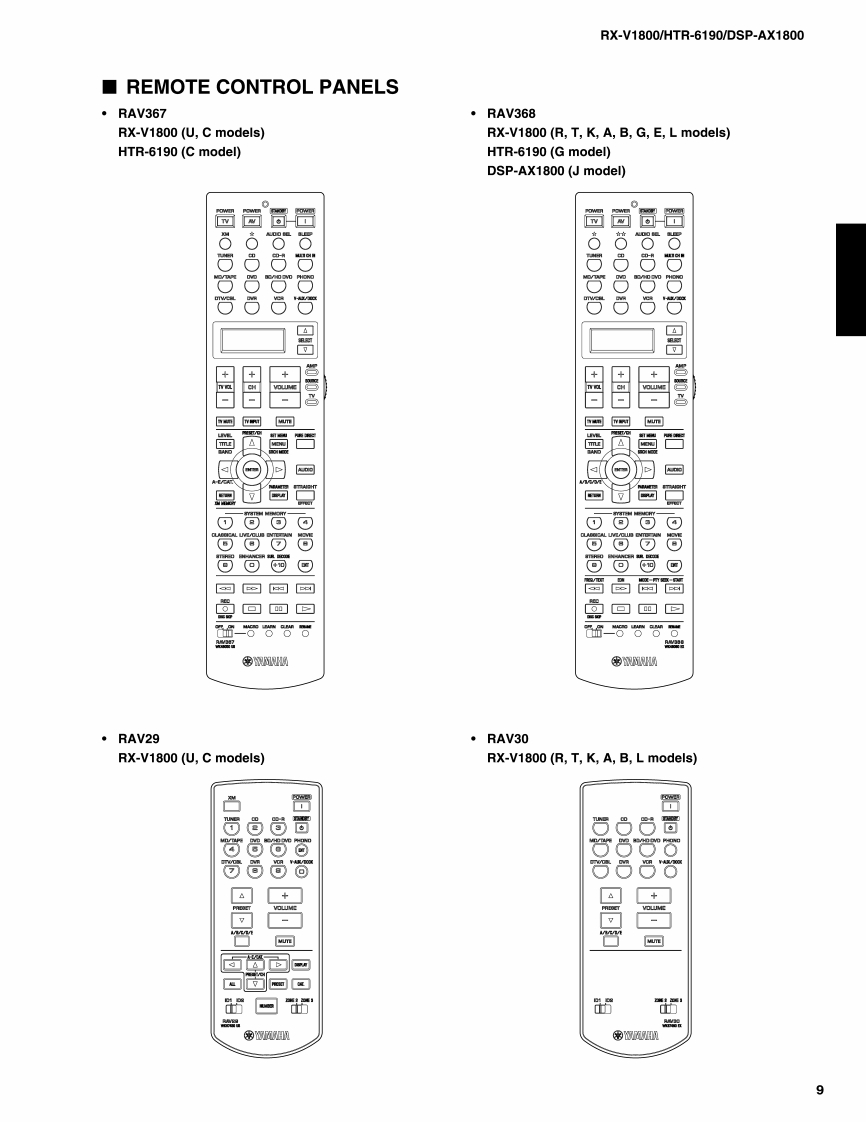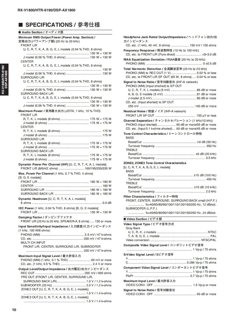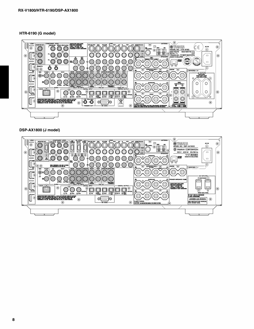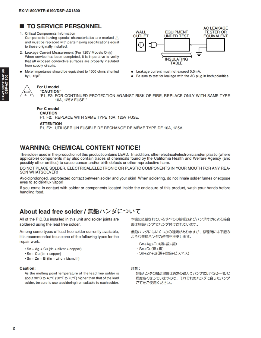 AV RECEIVER/AV AMPLIFIERRX-V1800/HTR-6190/DSP-AX1800SERVICE MANUAL-AX1800RX-V1200HTR1900IMPORTANT NOTICEThis manual has been provided for the use of au thorized YAMAHA Retailers and their service personnelIt has been assumed that basic service procedures inherent to the industry,and more specifically YAMAHA Products,are alreadyknown and understood by the users,and have therefore not been restated.WARNING:Failure to follow appropriate service and safety procedures when servicing this product may result in personalinjury,destruction of expensive components,and failure of the product to perform as specified.For these reasonswe advise all YAMAHA product owners that any service required should be performed by an authorizedYAMAHA Retailer or the appointed service representative.IMPORTANT:The presentation or sale of this manual toany individual or fim does not constitute authorization,certification orecognition of any applicable technical capabilities,or establish a principle-agent relationship of any form.The data provided is believed to be accurate and applicable to the unit(s)indicated on the cover.The research,engineering.andservice departments of YAMAHA are continually striving to improve YAMAHA products.Modifications are,therefore,inev itableand specifications are subject to change without notice or obligation to retrofit.Should any discrepancy appear to exist,pleasecontact the distributor's Service Division.WARNING:Static discharges can destroy expensive components.Discharge any static electricity your body may haveaccumulated by grounding yourself to the ground buss in the unit (heavy gauge black wires connect to this buss)IMPORTANT:Turn the unit OFF during disassembly and part replacement.Recheck all work before you apply power to the unit.■CONTENTSTO SERVICE PERSONNEL2AMP ADJUSTMENT/了>才部調整.71FRONT PANELS.…3-4DISPLAY DATA72REAR PANELS5-8C DATA73-84REMOTE CONTROL PANELS...9BLOCK DIAGRAMS...........85-87SPECIFICATIONS/参考仕樣10-13PRINTED CIRCUIT BOARDS.......88-115INTERNAL VIEW...14PIN CONNECTION DIAGRAMS...........116-118DISASSEMBLY PROCEDURES/分解手順...14-20SCHEMATIC DIAGRAMS ......119-137UPDATING FIRMWAREREPLACEMENT PARTS LIST139-174了7一么ヴ工了刃書老达办.20-33REMOTE CONTROL.....175-178SELF-DIAGNOSTIC FUNCTION/ADVANCED SETUP/ダ亻了分(自己診断機能).………..34-70下1>又卜七y卜了yブメ二1一卷設定寸石..179-181二)竹一上入了二1F儿体、工3マ一夕隔定)再生纸卷使用T儿'米寸。This Service Manual uses recycled paper米YAMAHA101063This manual is oopyighted by YAMAHA and may notbe copedorredistributed either in pintor electroncally without permission.YAMAHA CORPORATIONP.O.Box 1,Hamamatsu,Japan'07.08