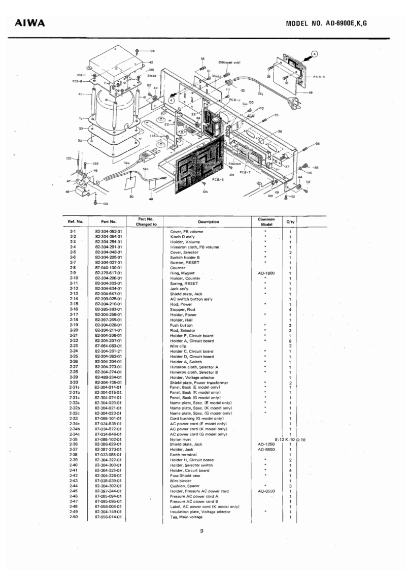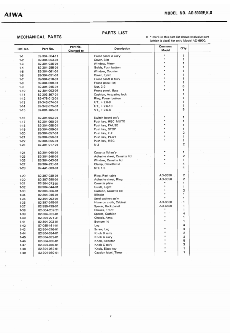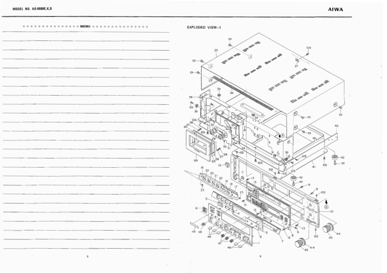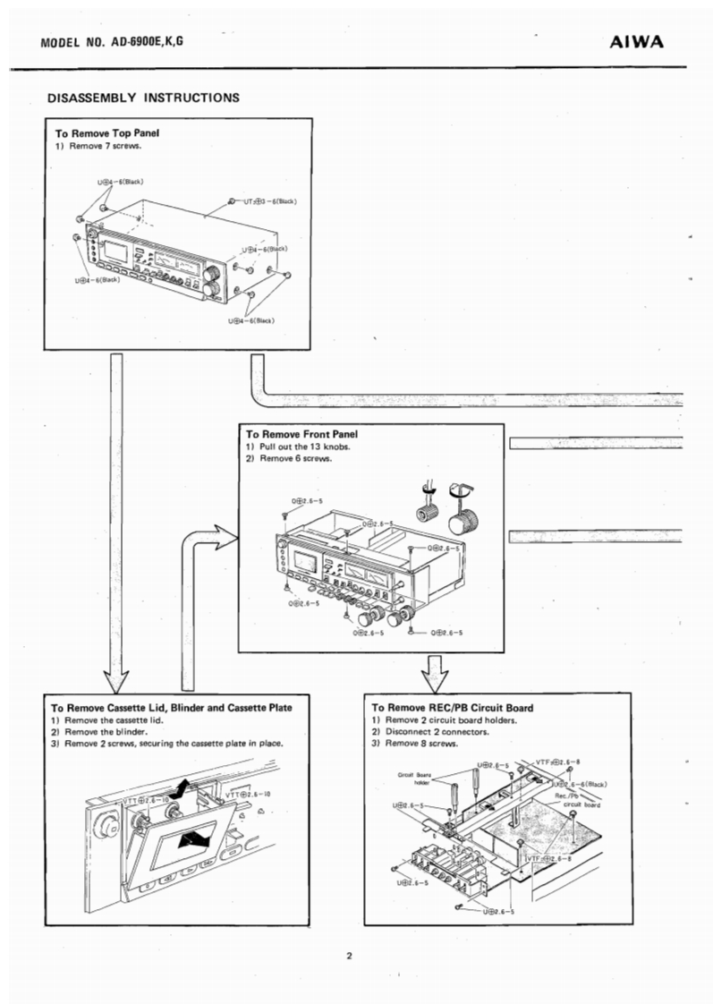 STEREO CASSETTE DECKWITH DOLBYNR SYSTEMMODEL NO.AD-69O▣E,KGAIWA(SERVICE MANUAL】三®®®日DATE OF ISSUE 9/1978SPECIFICATIONSSemiconductors:13IC's,171 transistors,82 diodes,Frequency response:LH type,20~16 kHz12 FET's 6 LED'sPower source:AC 110~120V/220V/240V (E model)2514kz(3d8)AC 120V/240V (K.G model)Power consumption:28chab1e50/60,S0Fe-Cr tape,20~20 kHz25~18 kHz dB)Dimensions:450(W0×120(H)×327ID)mmCrO,tape,20≈19kHzWeight:9.8kgTrack system:4-track 2-channel stereo25-17kz(号aB)Tape spe4.76cm/e405gMotor:38 pulse FG servo motor (for capstan)Wow flutter:Less than 0.04%(WRMS)at PbDC servo motorAutomatic stop system:Full auto-stopHead:V-cut conbination ferrite headAutomatic shut-off action time:[for Rec./Pb)2±0.50euble cap ferrite head (for Erasure)Pinch roller pressure:580+70Input:MICMax.input sensitivity-40g0.25mVTake-up torque:FF&rewind torque:50±10gcm(200 ~10 ks suitable)155±259cmLINE IN:Max.乐品ninactin5365±5s0c.《wlc-60 cassette】(More than 50 kn)DIN:Max,input sensitivityPlayback output:0.58±0.06V(LINE)0.25mv,50k1(TTA-161)Output柱LINE OUT;Standard output levelPlayback noise:Less than 3.5 mV (LH,DOLBY OFF)0.41V(0VU)(Un-Weighted)Less than 1.0 mV (Fe-Cr,CrO2,Optimum load impedanceDOLBY ON)More than 50 knRec./Pb output:0VU±1.0 dB (LINE)DIN:Standard400Hz0VU月Rec./P distorrtion:Less than 1.5%(LH)Optimum ioad impedance(400Hz0VU)Less than 1.0%(Fe-Cr)More than 50 knLess than 1.5%(CrO,)PHONES;8n~150nRec./Pb S/N:More than 40/45 dB LH,DOLBY(400 Hz 0 VU)OFF/ON)[Un-Weighted)More than 43/46 dB (Fe-Cr,CrO.DOLBY OFF/ON)Channel separation:More than 30 dB(1 kHz 0 VU)Cross talk:More than 60 dB(1kHz0VU】More than 60 dBVU meter display error:0VU±0.5dBSpecifications and external appearance are subject totoVU月change without notice due to product improvement.Peak meter display error:0VU+7d8)+7dB±1dB.Dolby Noise Reduction System is licensed from Dolby0VU-10dB)-10dB±1dBLaboratories Incorporated(0 VU-20 dB)-20 dB 12 dBThe name "Dolby"and the "Double D"symbol areBias frequency:105 kHztrademarks of Dolby Laboratories Incorporated.